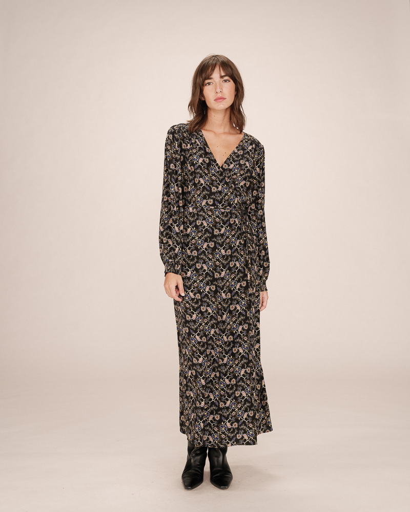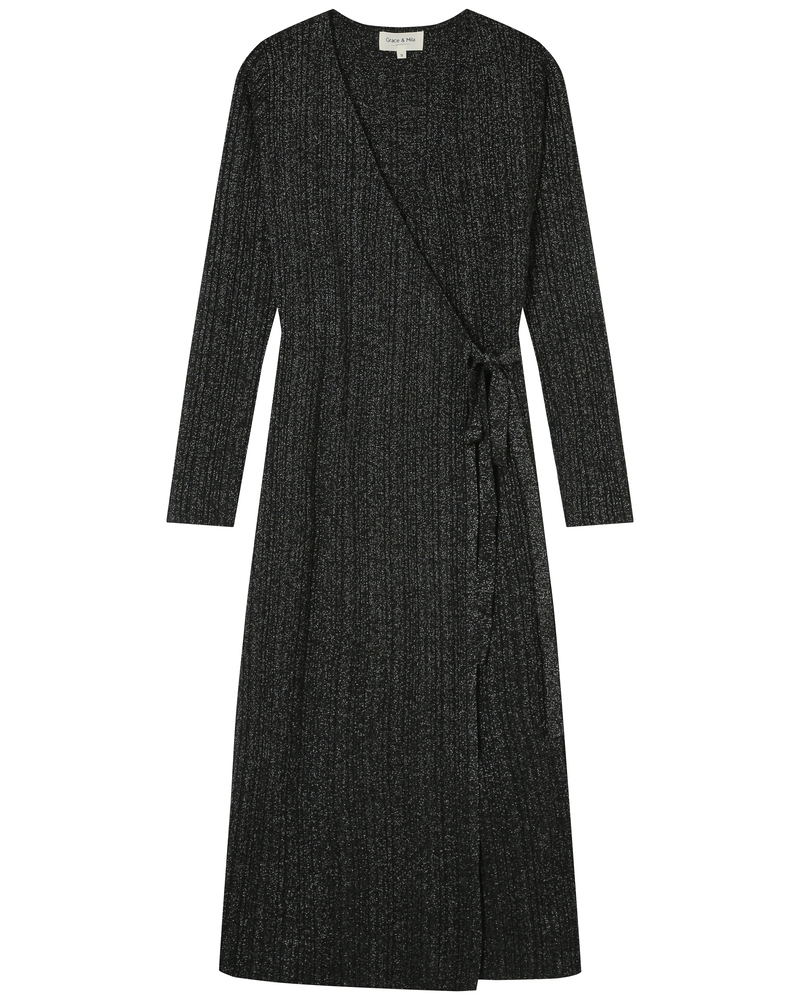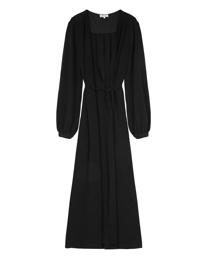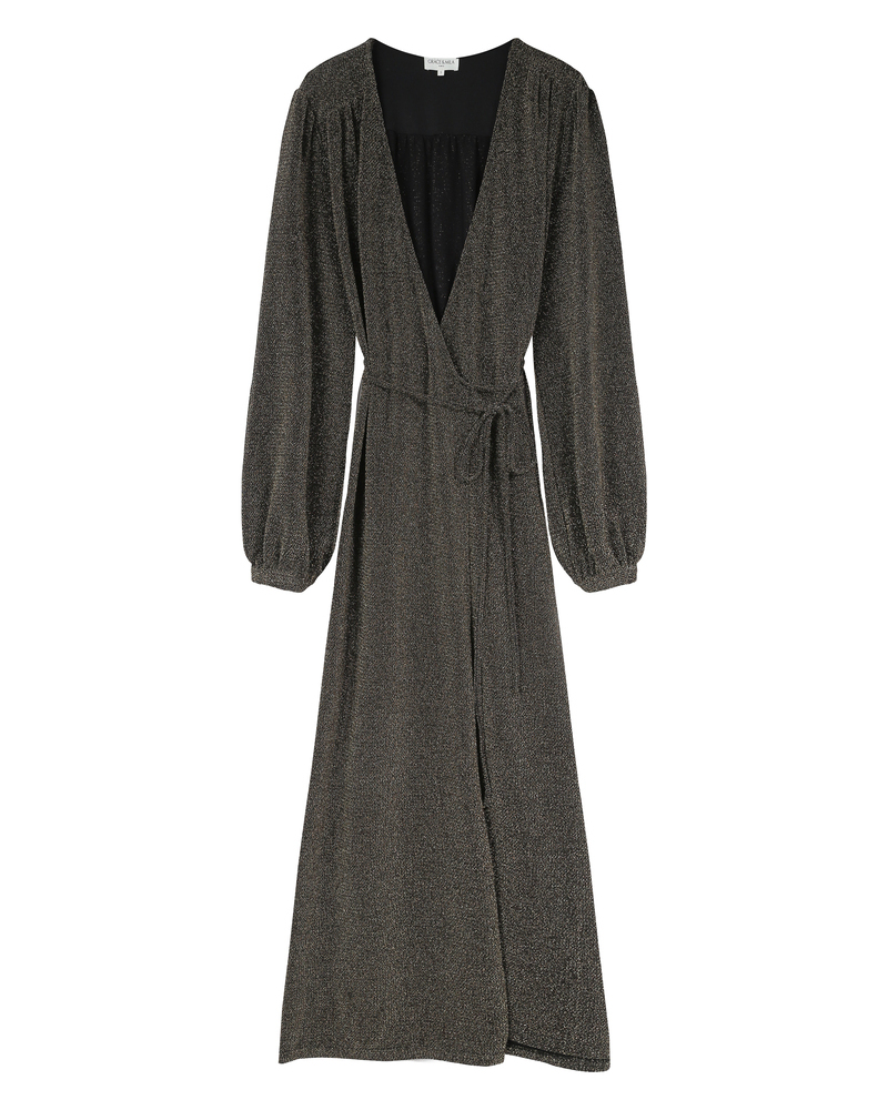 Made from lurex fabric, the TALIA long dress is a must-have of the season. Metallic threads are woven into this piece to create a radiant fabric. Details such as long puff sleeves and a V-neckline highlight the femininity of the style. The TALIA wrap dress features an elasticated waistband at the back and a tie belt at the waist to structure the silhouette.