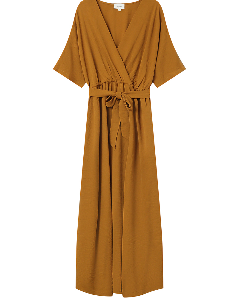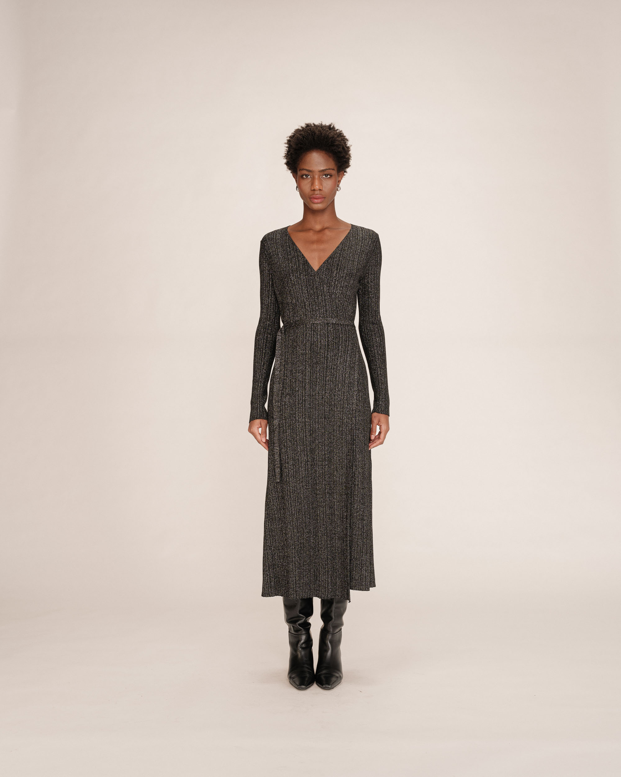 The TANGERINE wrap dress is made from a natural fiber fabric with lurex. The V-neckline, straight cut, and waist tie elegantly enhance feminine curves. The TANGERINE lurex dress is an elegant and feminine piece that creates a bright and chic silhouette.