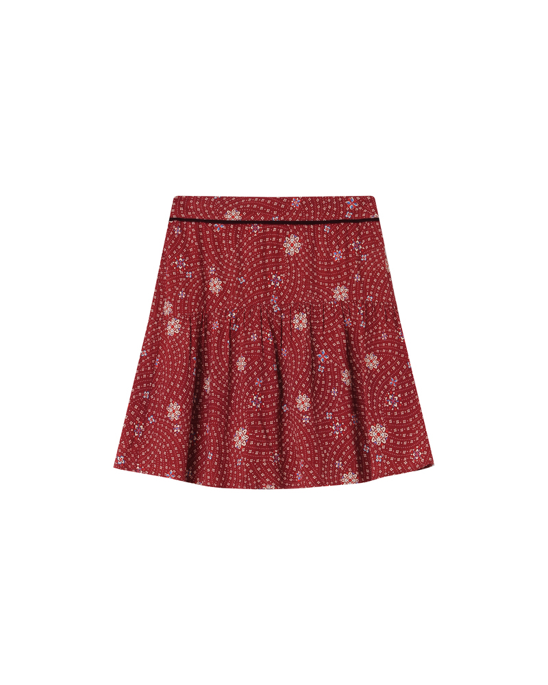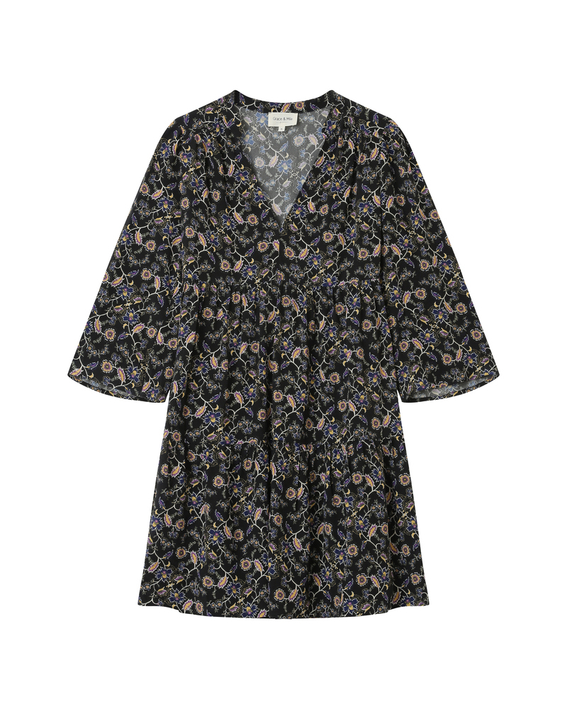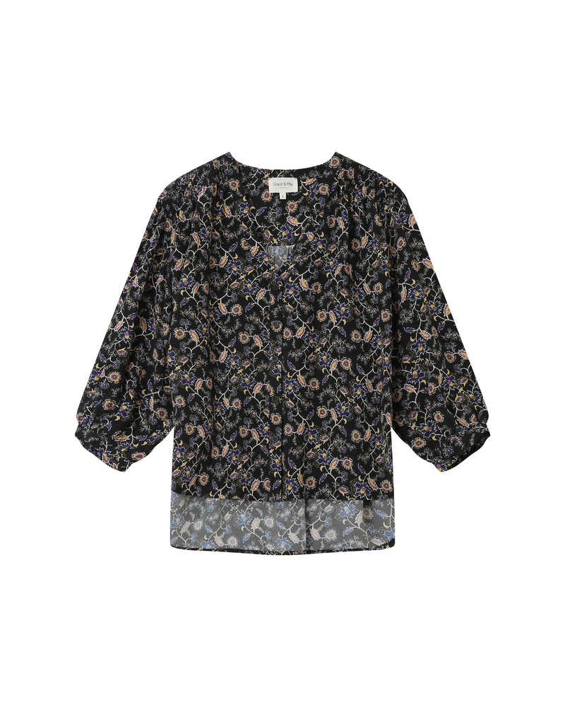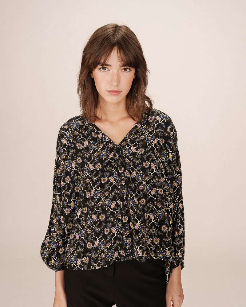 The SECRETE printed blouse is a light and relaxed piece that creates a feminine and refined silhouette. Enhanced by a floral print with Paisley-inspired motifs, the blouse features a V-neckline and delicate gathers at the shoulders and back, giving it timeless elegance. The SECRETE patterned blouse has a button-down front.
