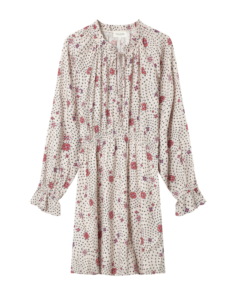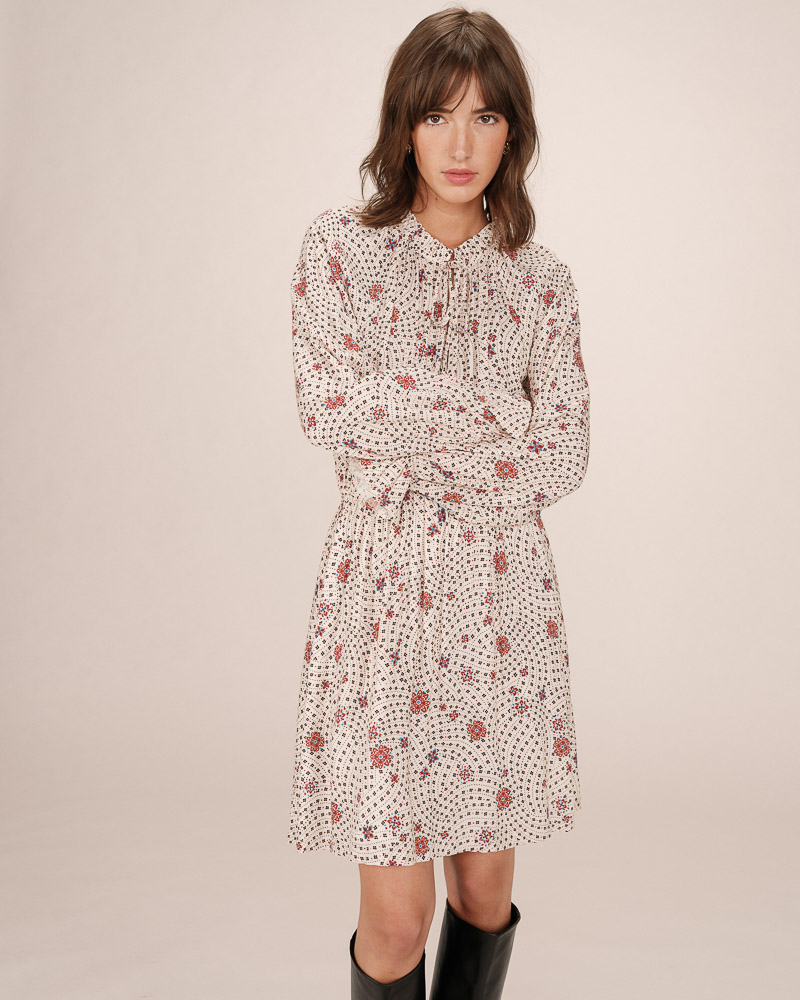 The SCARLETT long-sleeved blouse is enhanced by a seventies-style floral print that creates a bohemian silhouette. The blouse features details such as a V-neckline with two front ties and long sleeves with elasticated cuffs, making it a refined and detailed piece. The SCARLETT printed blouse has a straight cut that suits every woman's curves.