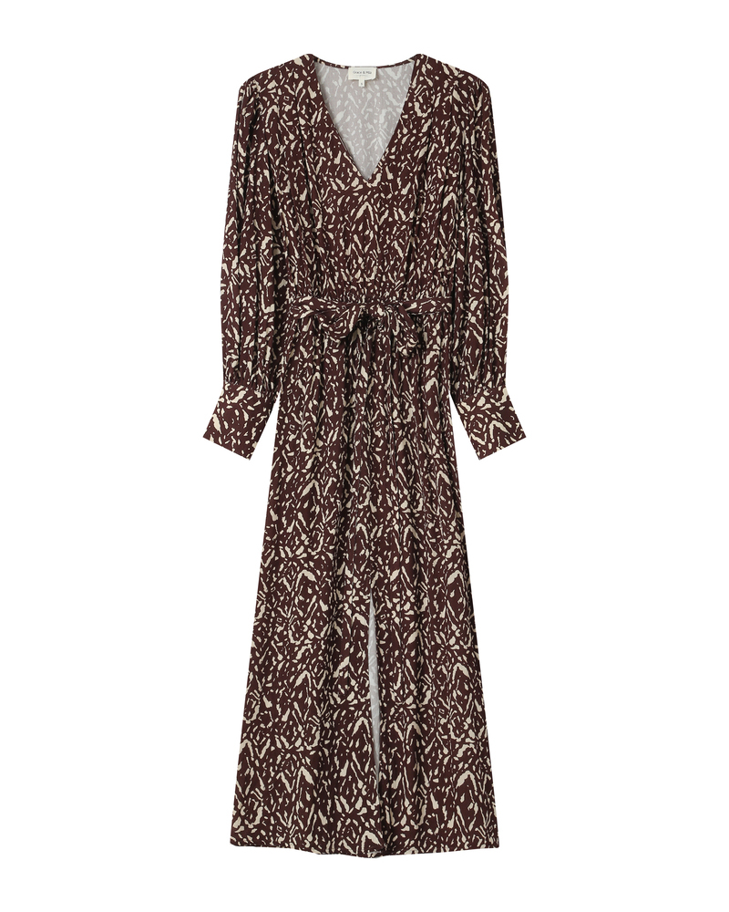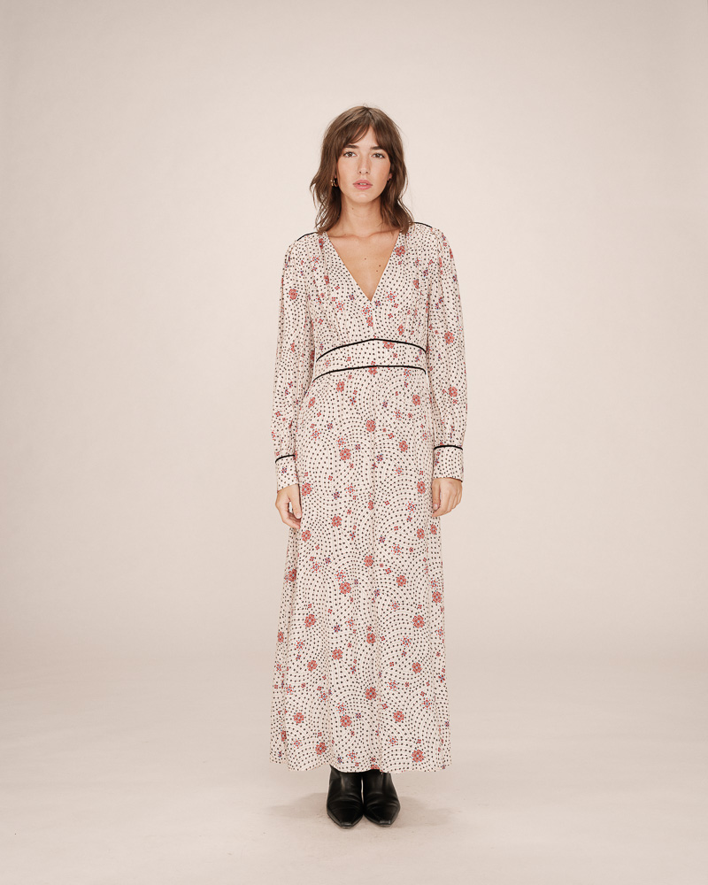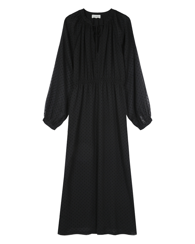 Made from a transparent and flowing fabric adorned with a velvet polka dot pattern, the THESSA long dress adds a light and elegant piece to the collection. The lined model reveals the shoulders and arms through transparency for a sensual look. Details such as the slit at the bottom and the tie-front V-neck make the THESSA polka dot dress a truly feminine piece.