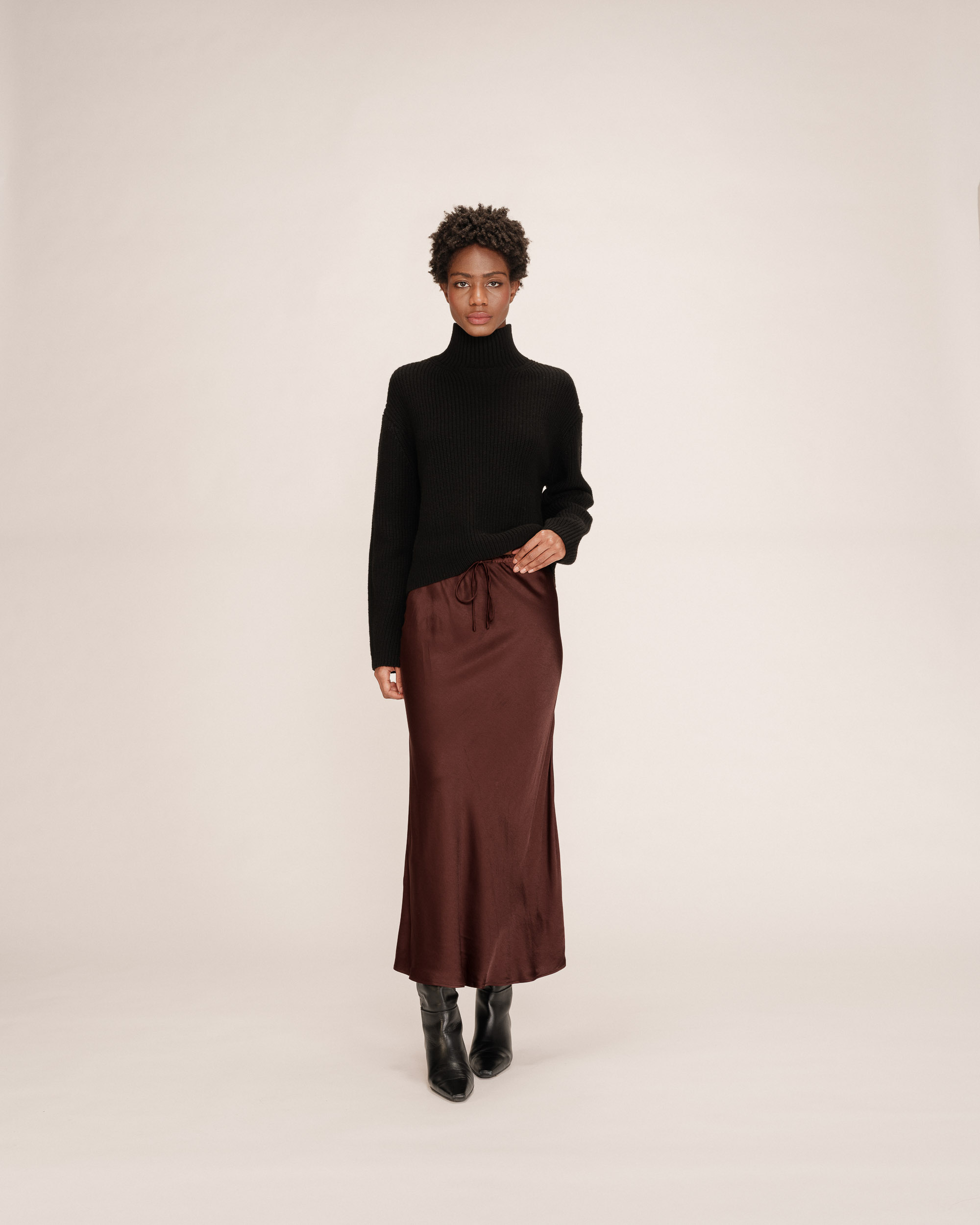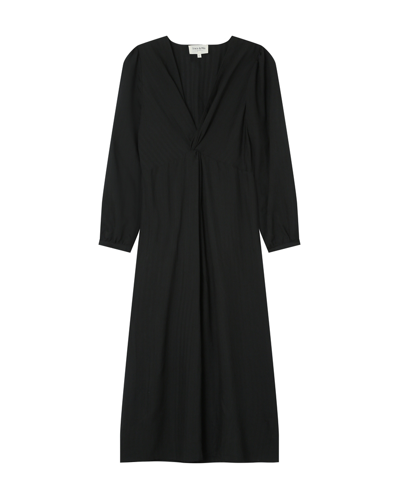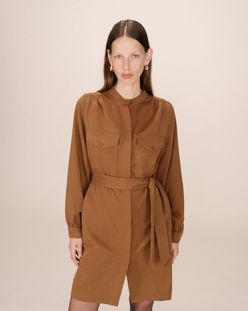 The flowing fabric of the TILLEUL knit dress moves with you, while the waist tie structures the silhouette to elegantly enhance feminine curves. The model features a V-neckline, straight cut, and long sleeves. The TILLEUL knit dress is a decidedly feminine and sophisticated piece.