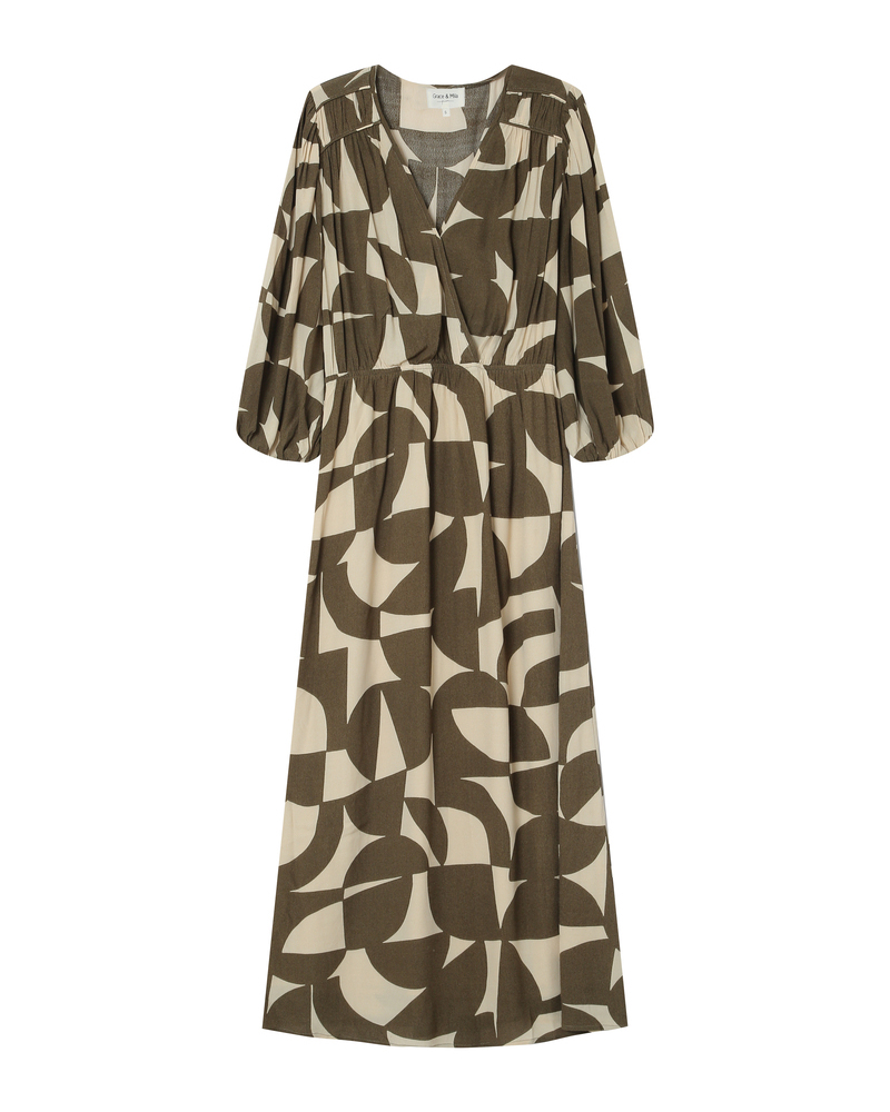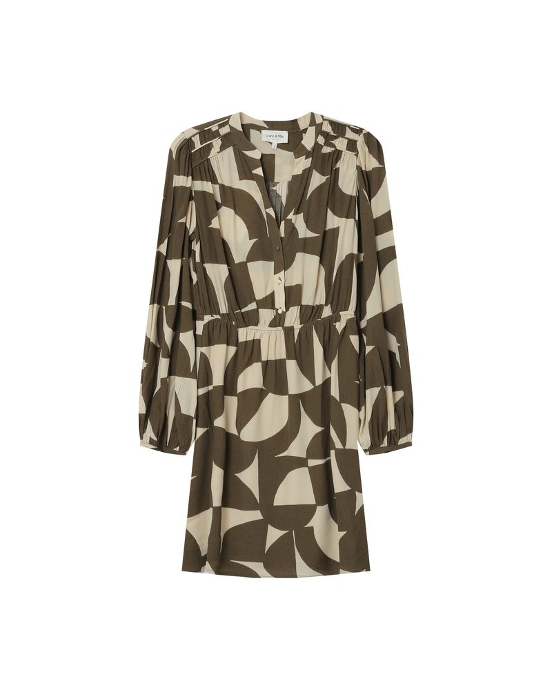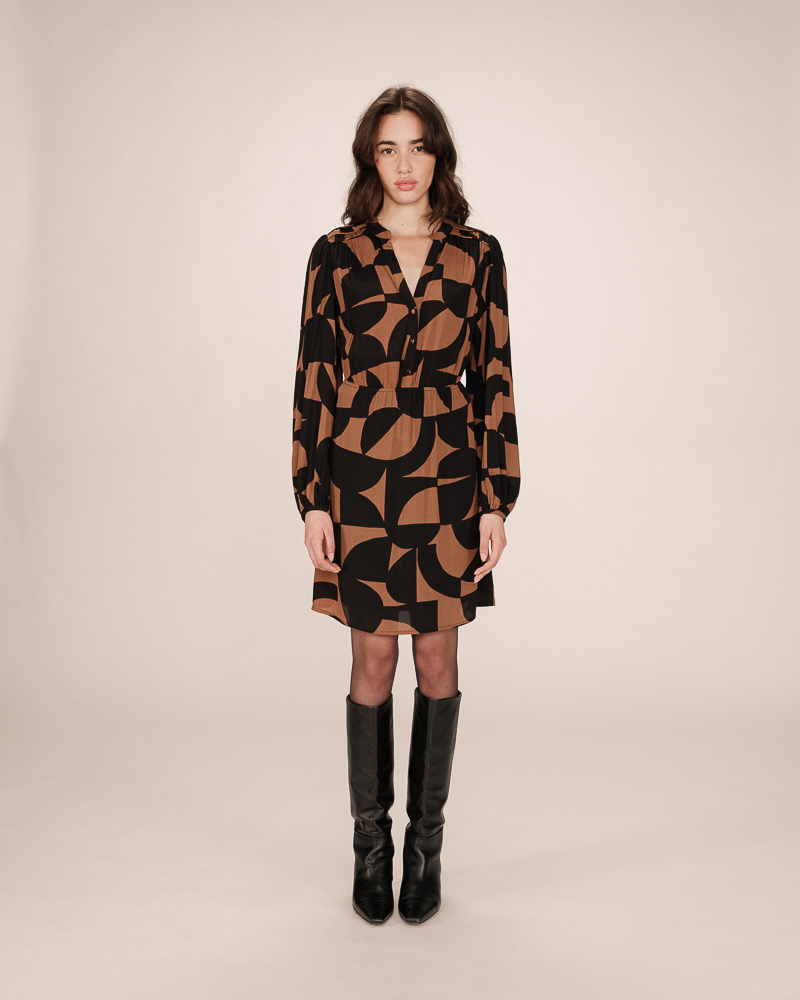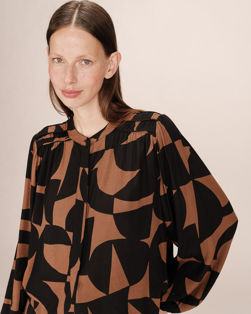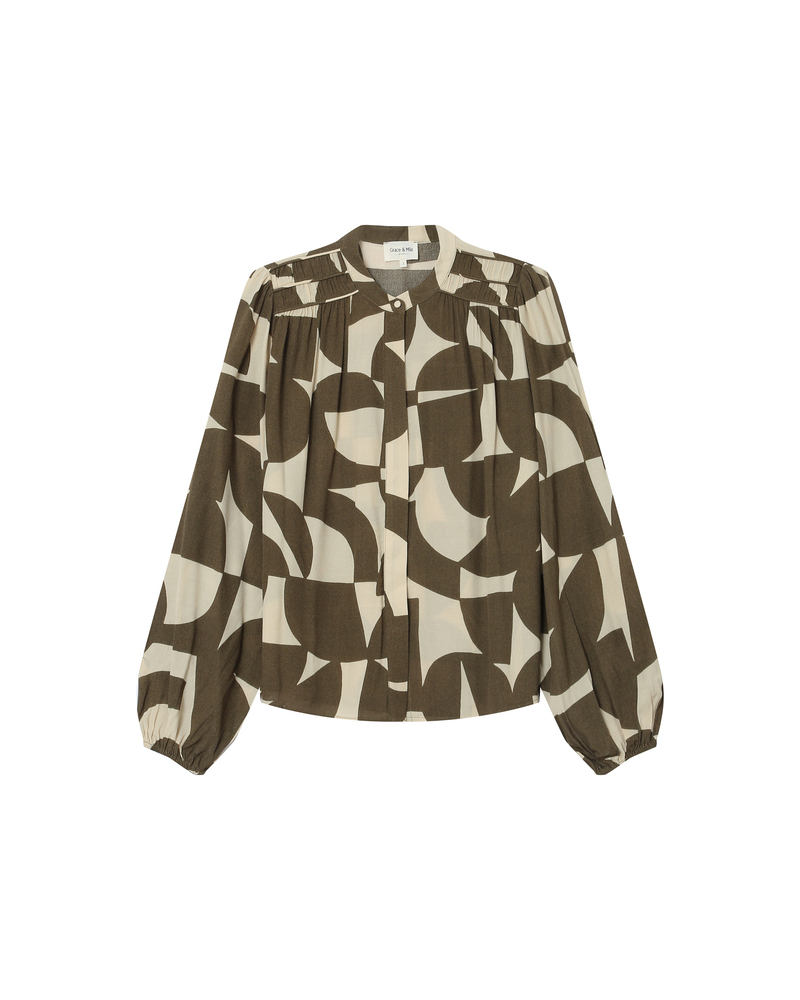Flowing and lightweight, the SORPRESA long sleeve blouse adds a feminine and elegant piece to the collection. The long sleeves, shoulder gathers, and round neckline create a sophisticated and refined look. The SORPRESA flowing blouse is made with a two-tone geometric print that shapes a modern and structured silhouette. The straight cut flatters and suits every woman's curves.