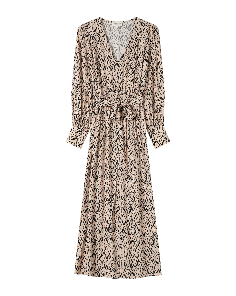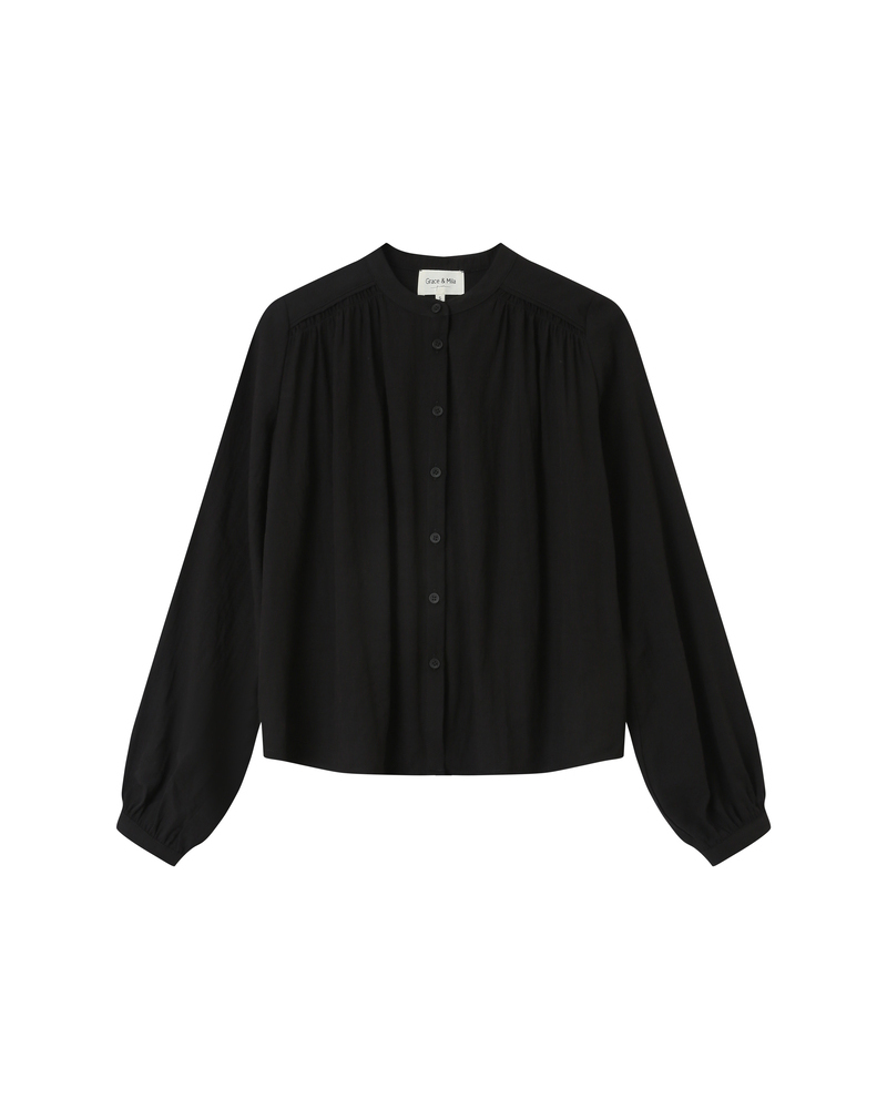 Made from viscose fabric, the SAVANNAH long-sleeved blouse blends fluidity and simplicity. Elements such as the straight cut and long sleeves with buttoned cuffs create a classic silhouette, while gathers at the cuffs and front add movement and contrast. The SAVANNAH fluid blouse brings an element of timeless elegance to the collection.