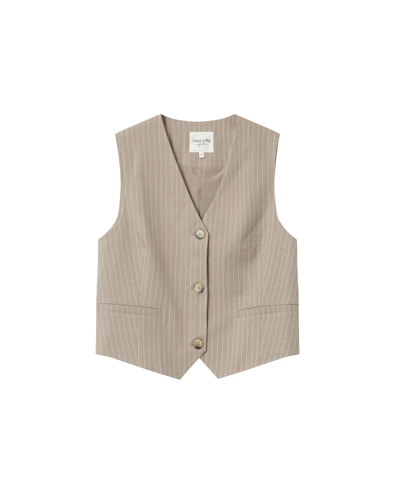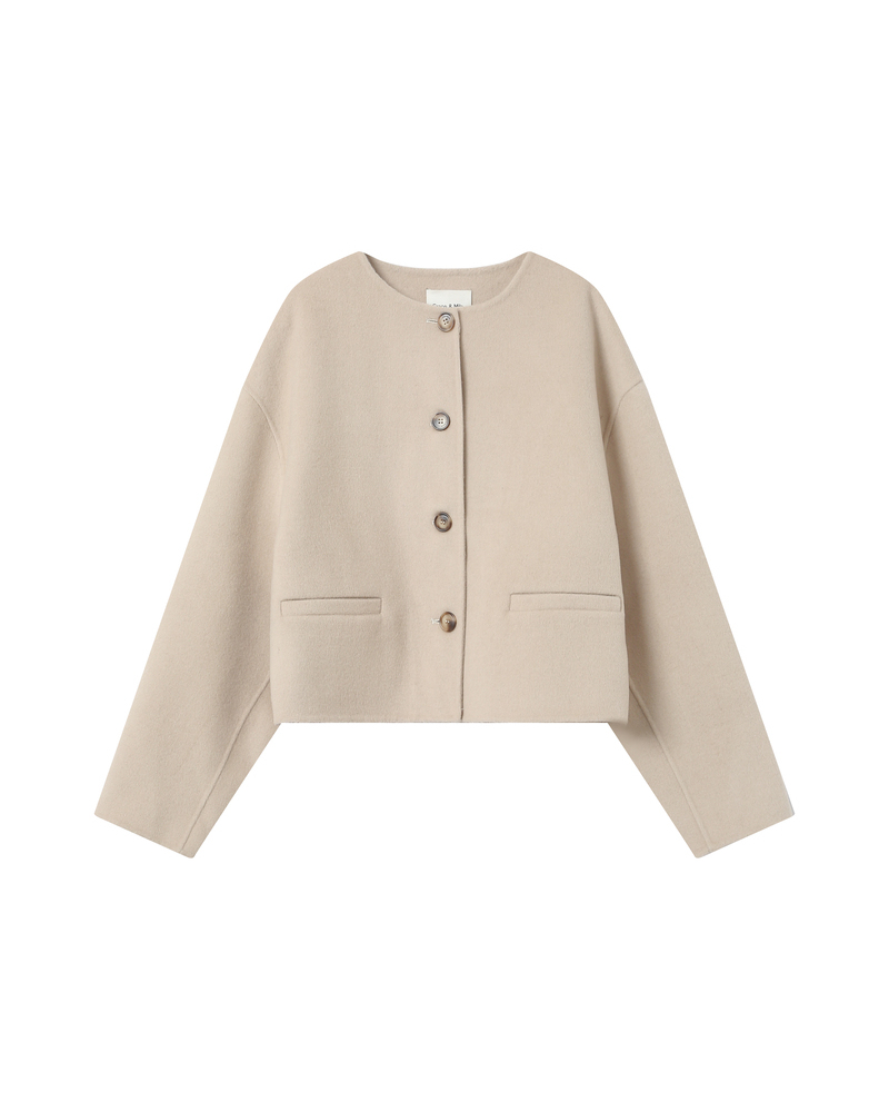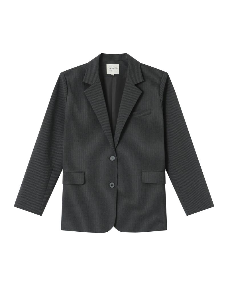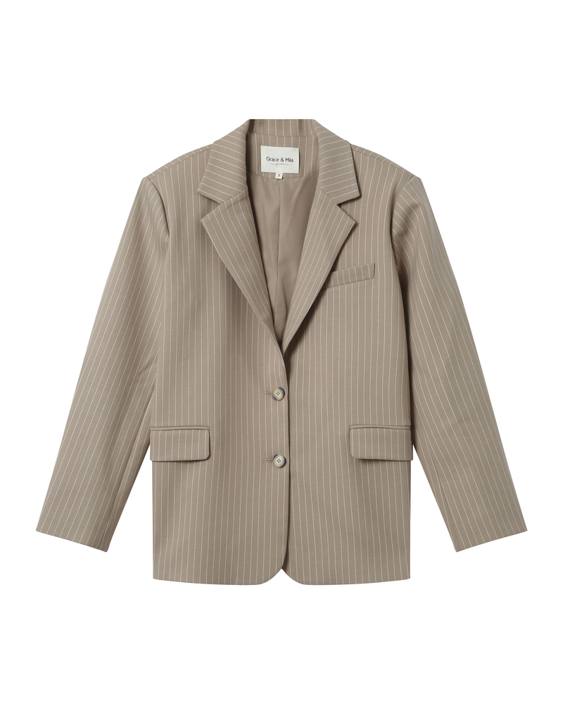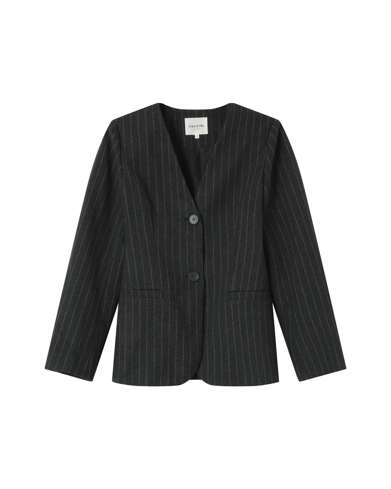 The SHAIN tailored blazer, made from a wool-blend fabric with contrasting stripes, offers a modern yet timeless silhouette. Collarless with a fitted cut, the SHAIN long-sleeved blazer is both elegant and feminine. This lined piece features a single-button closure and welt pockets at the front.