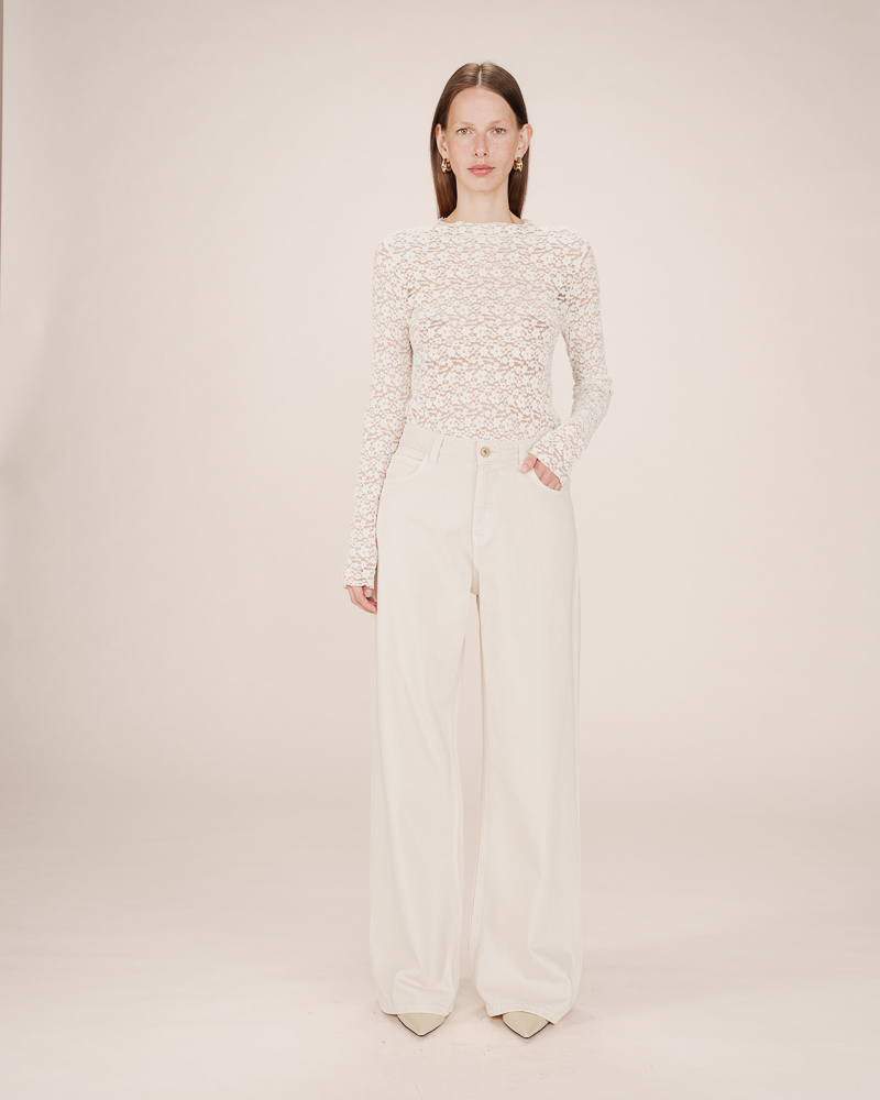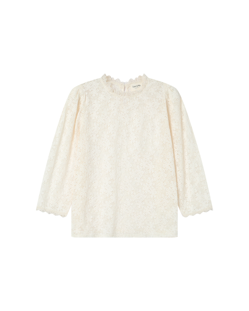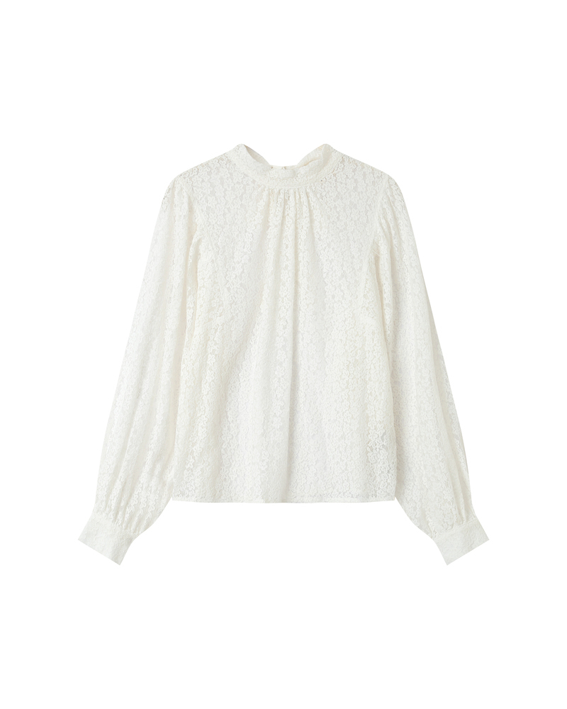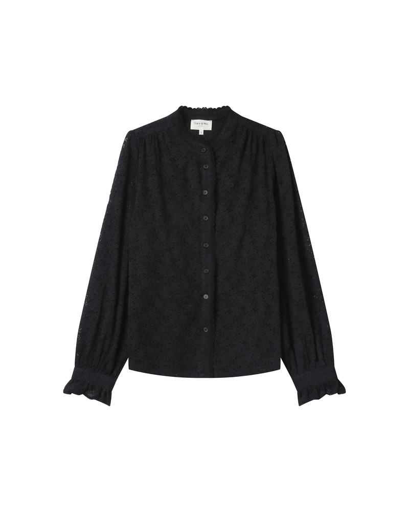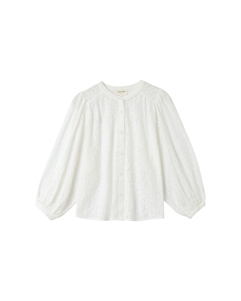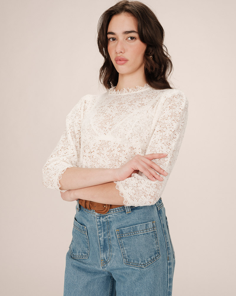 The SOPHIA lace blouse is a romantic piece full of charm. Its relaxed cut contrasts beautifully with delicate gathers and puff sleeves, creating an elegant and structured silhouette. The round neckline, sheer lace, and buttoned cuffs of the SOPHIA long-sleeved blouse offer a boho-chic look full of femininity.