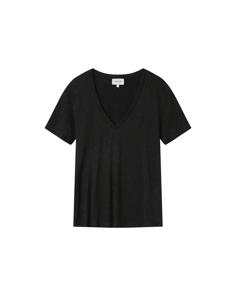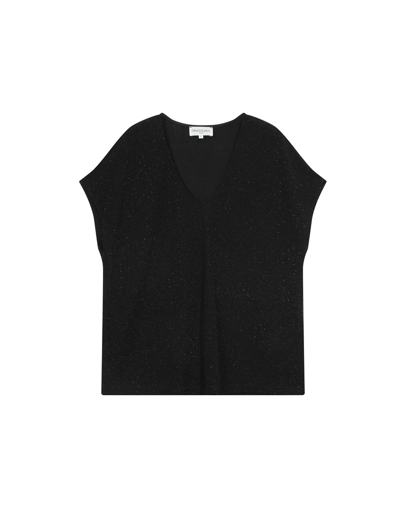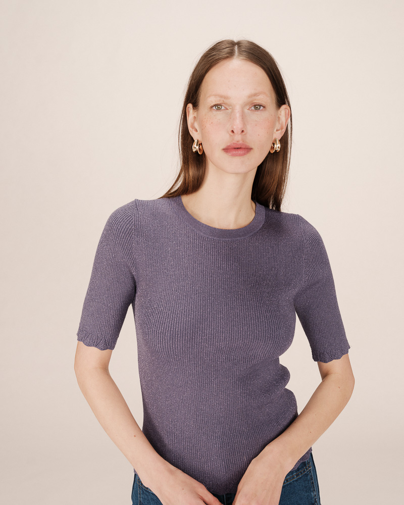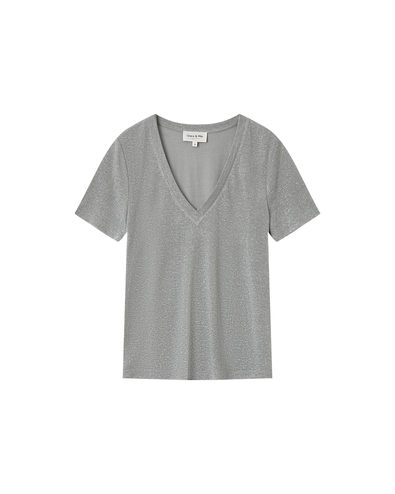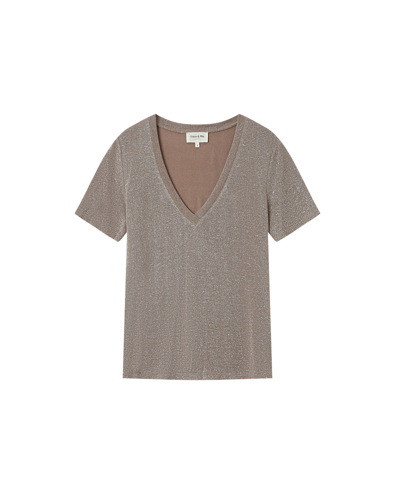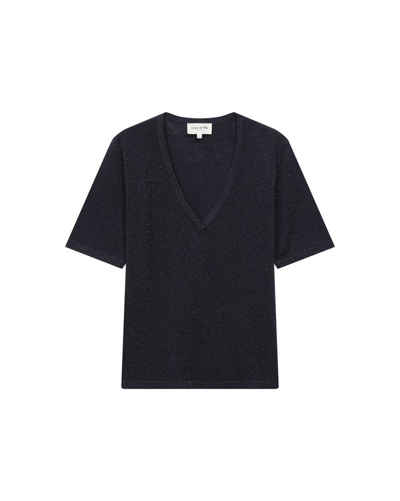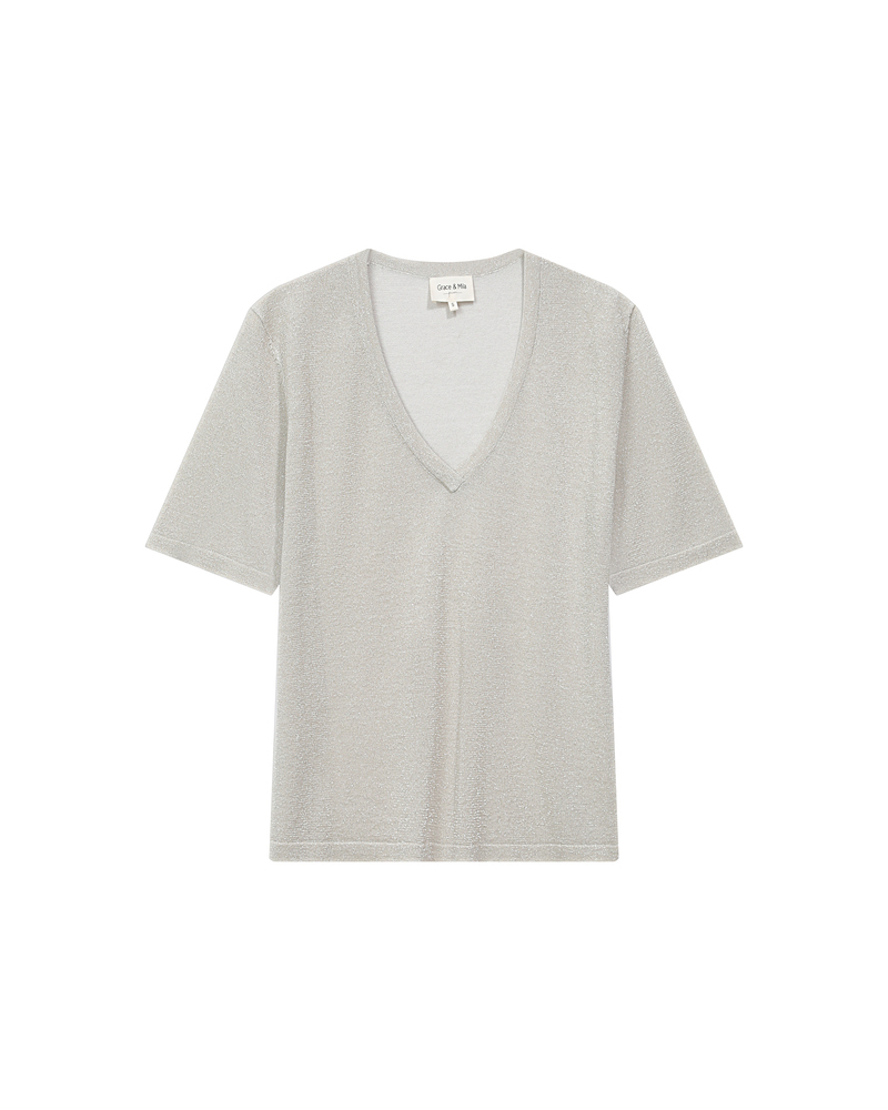 The TAYLOR knit T-shirt is a wardrobe essential enhanced with a touch of lurex, creating a radiant silhouette. Its straight cut and short sleeves are combined with a deep V-neckline for a feminine and elegant look.