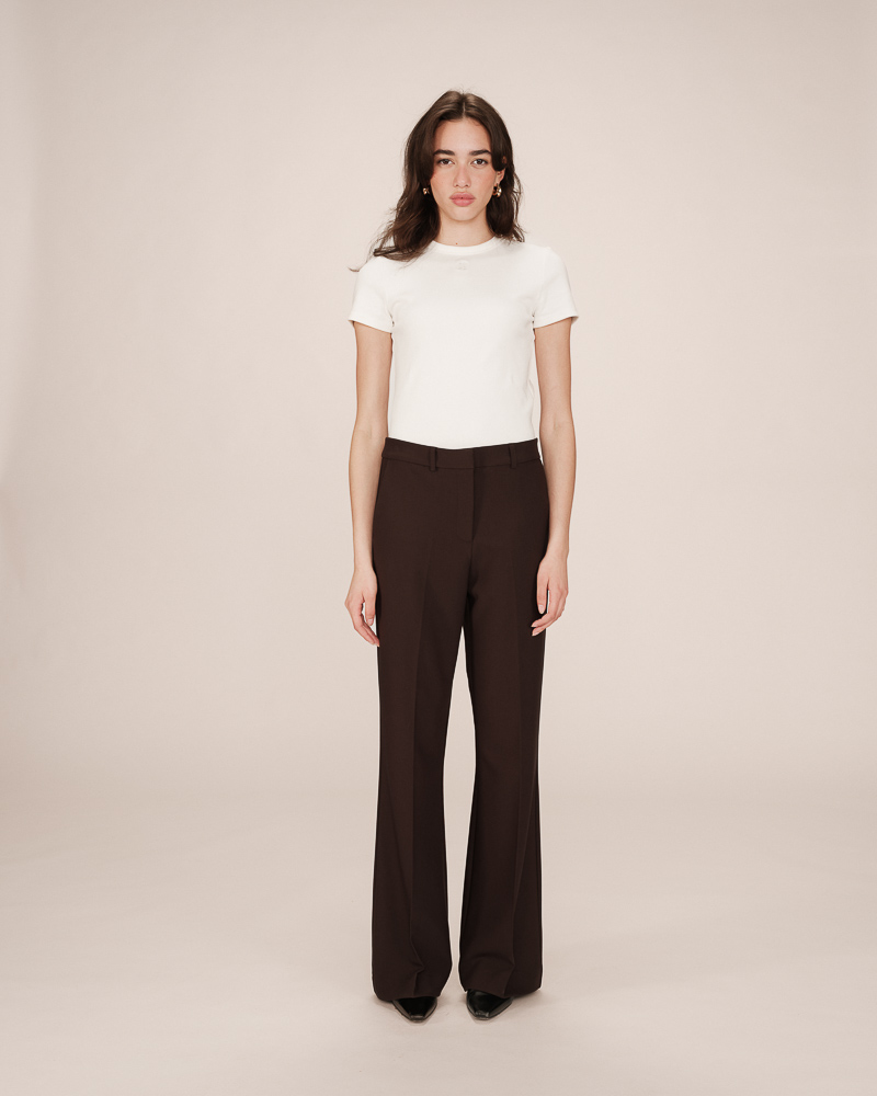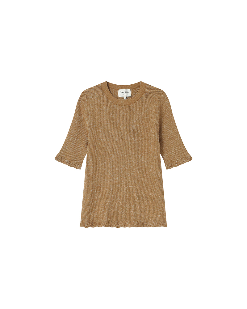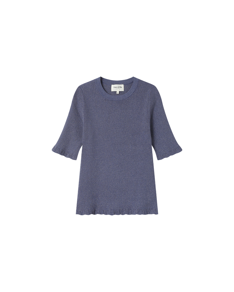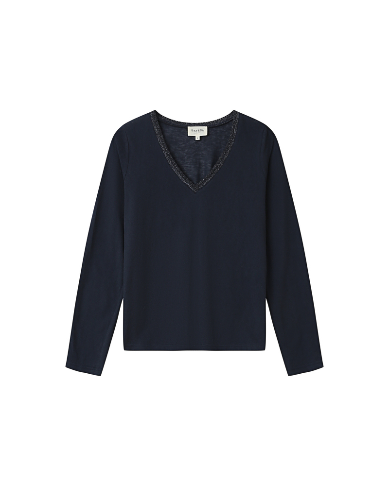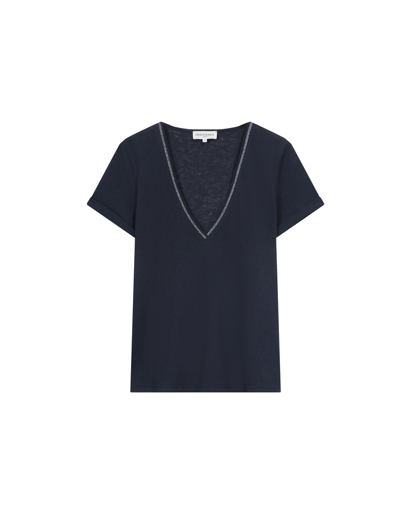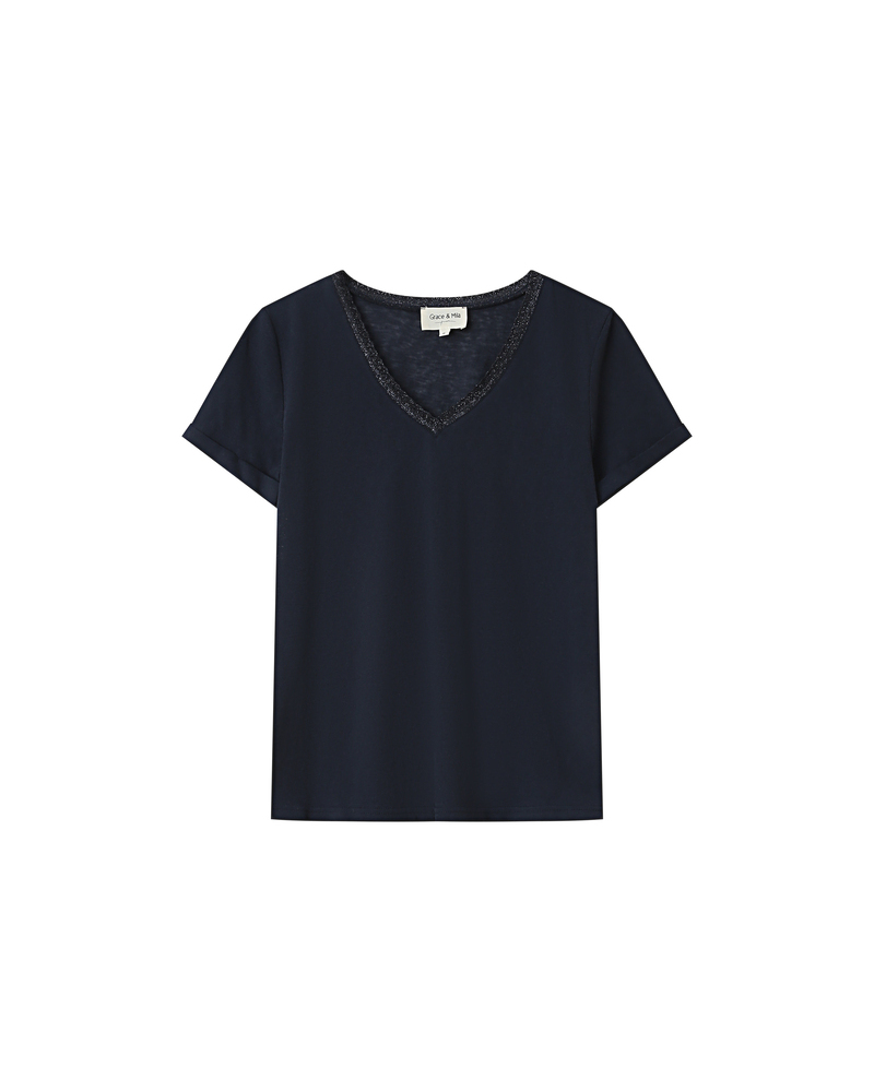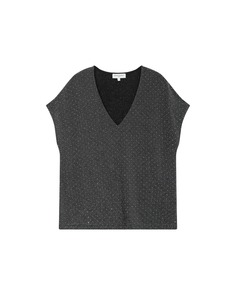 The TAYLOR knit T-shirt is a wardrobe essential enhanced with a touch of lurex, creating a radiant silhouette. Its straight cut and short sleeves are combined with a deep V-neckline for a feminine and elegant look.