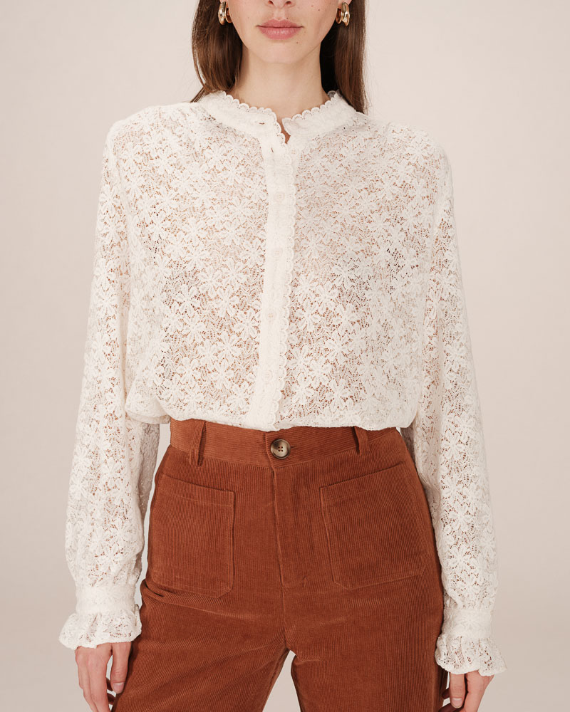 La blouse en dentelle SWING, à l'esprit vintage et romantique, est une pièce à la féminité affirmée. La blouse présente des poignets à volants et un liseré en dentelle à l'encolure qui offrent une silhouette classique et élégante. La coupe droite et les manches longues boutonnées de la blouse à encolure ronde SWING en font un modèle chic et intemporel.