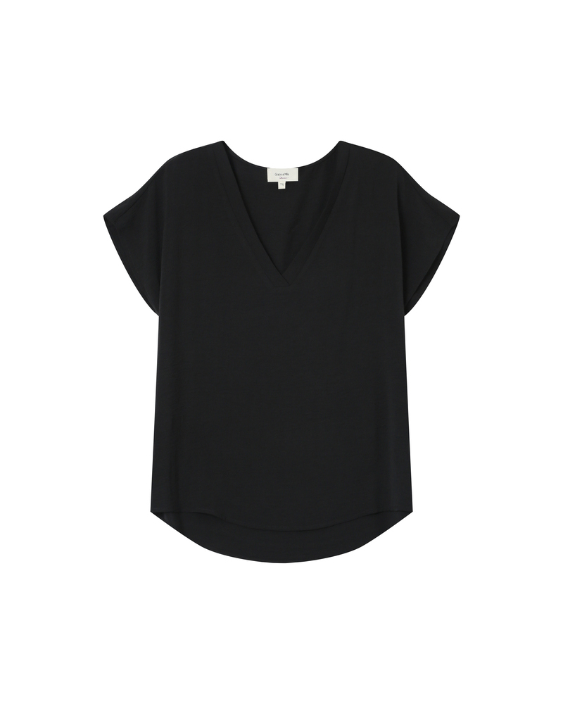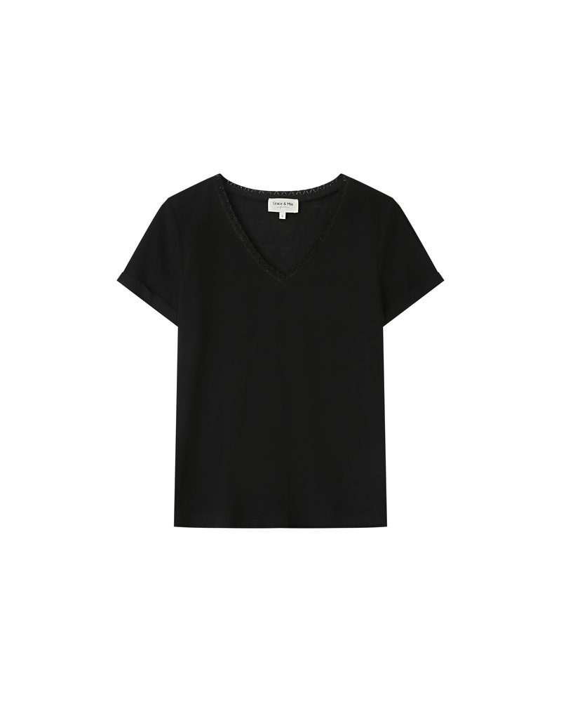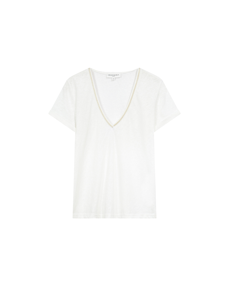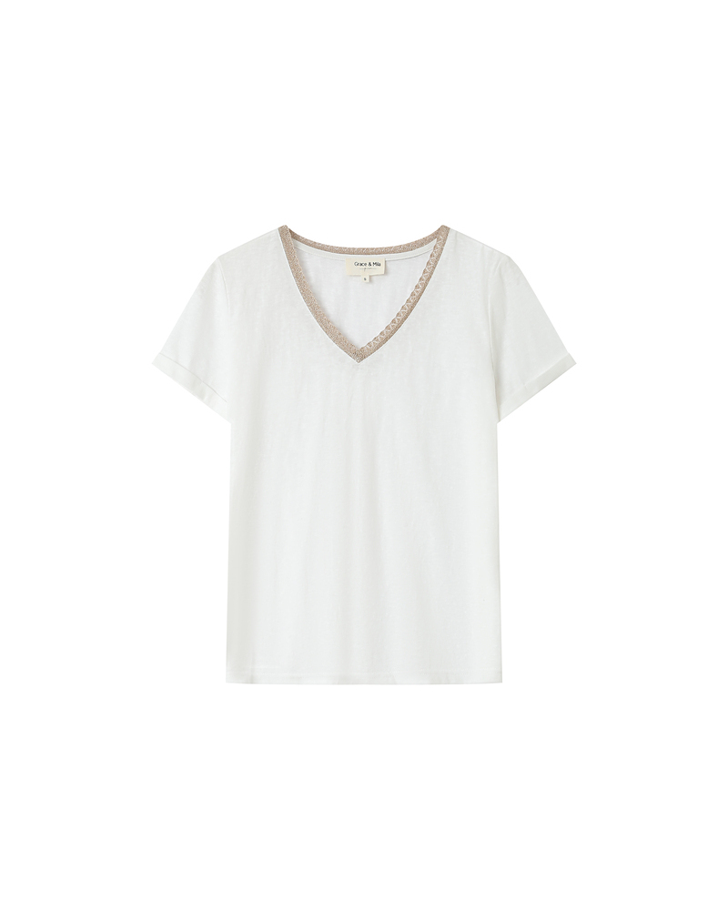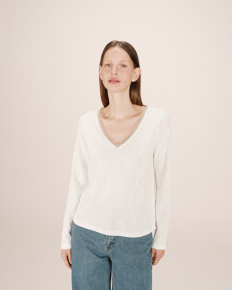 Le top à manches courtes TIM est un intemporel de la Maison. Les lignes classiques du modèle s'adaptent aux courbes de chaque femme. L'encolure en V du top droit TIM est sublimée par un liseré en lurex qui souligne le décolleté et ajoute une touche de féminité à la pièce.