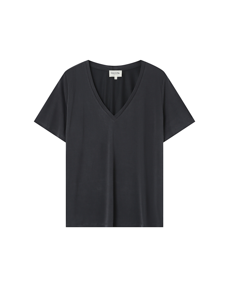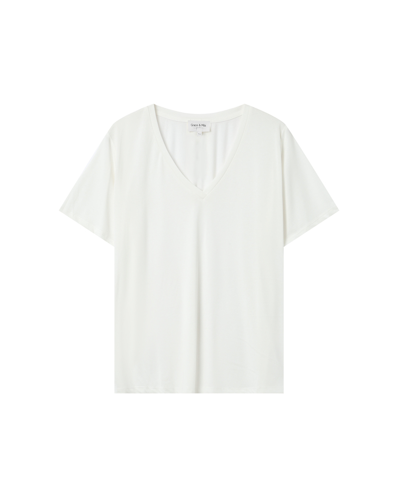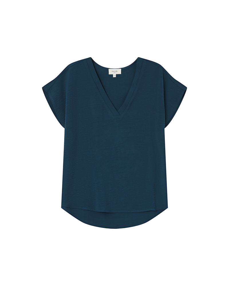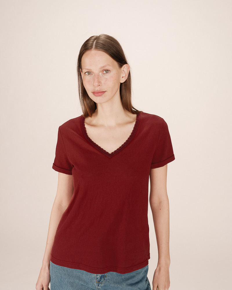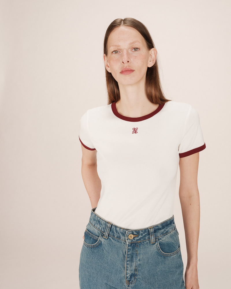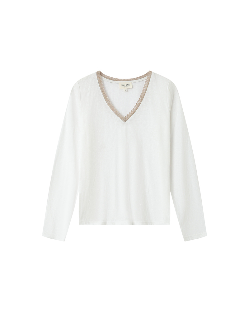 Le top à manches courtes TIM est un intemporel de la Maison. Les lignes classiques du modèle s'adaptent aux courbes de chaque femme. L'encolure en V du top droit TIM est sublimée par un liseré en lurex qui souligne le décolleté et ajoute une touche de féminité à la pièce.