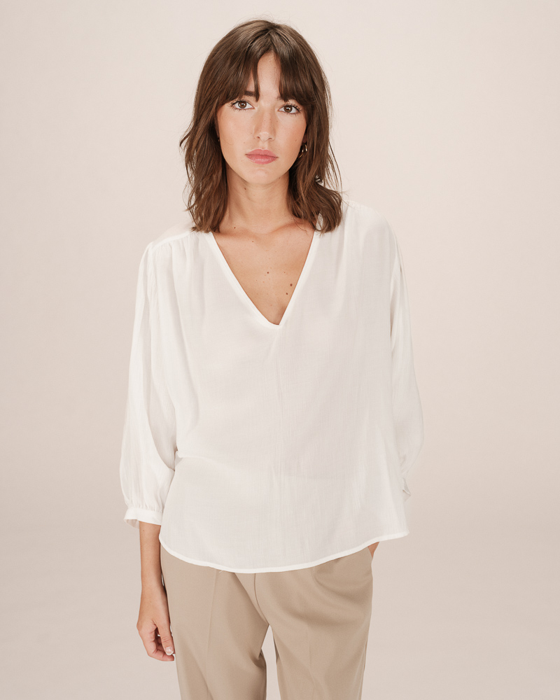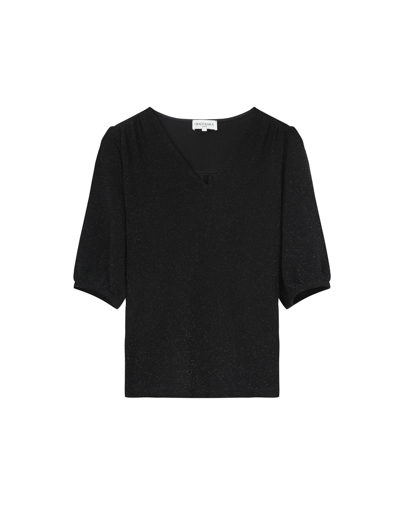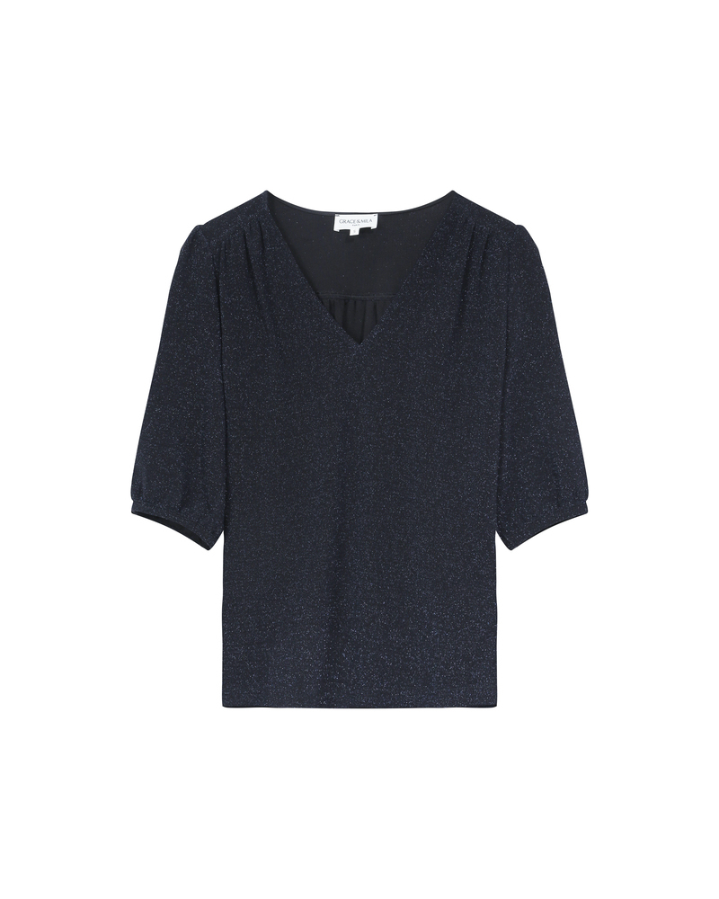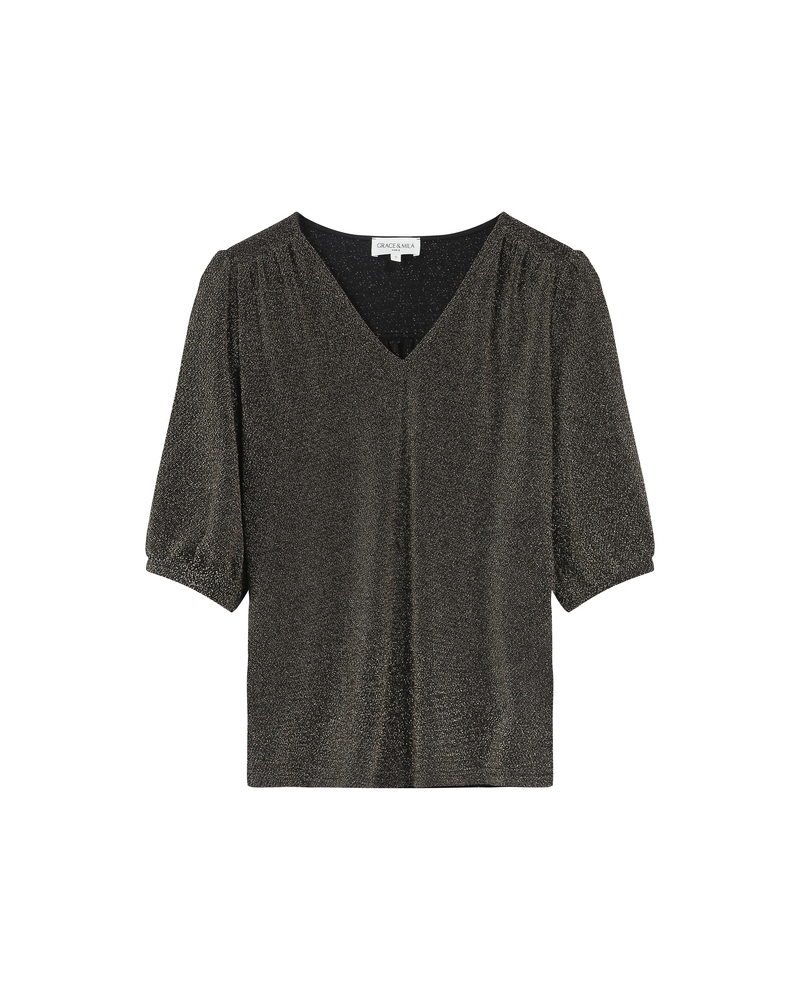 The TIMIDE 3/4-sleeve top features a straight cut, a V-neckline, and gathers at the shoulders for a feminine and relaxed look. This timeless piece is enhanced by a fabric with lurex, creating a luminous and elegant silhouette. The TIMIDE lurex top is a staple for every season.