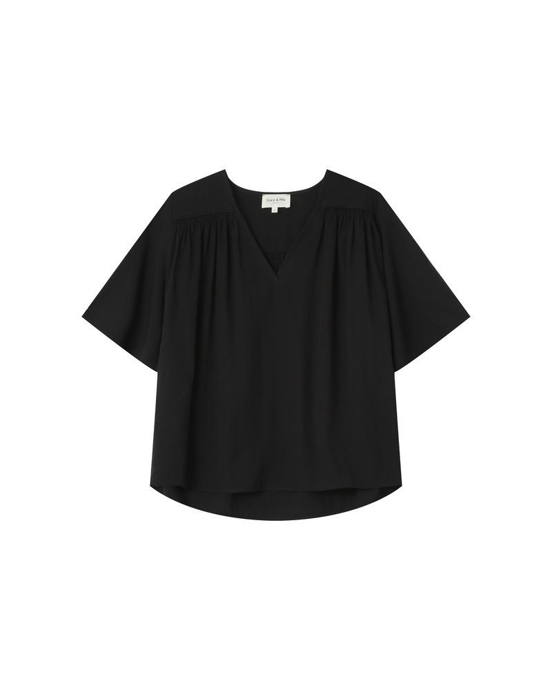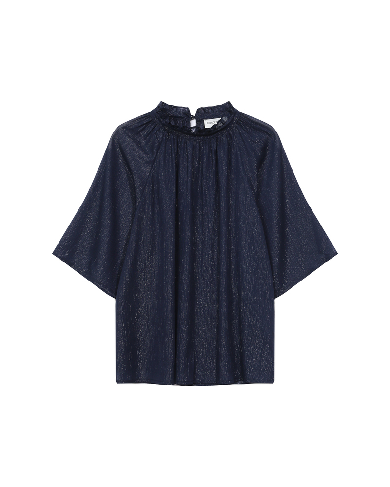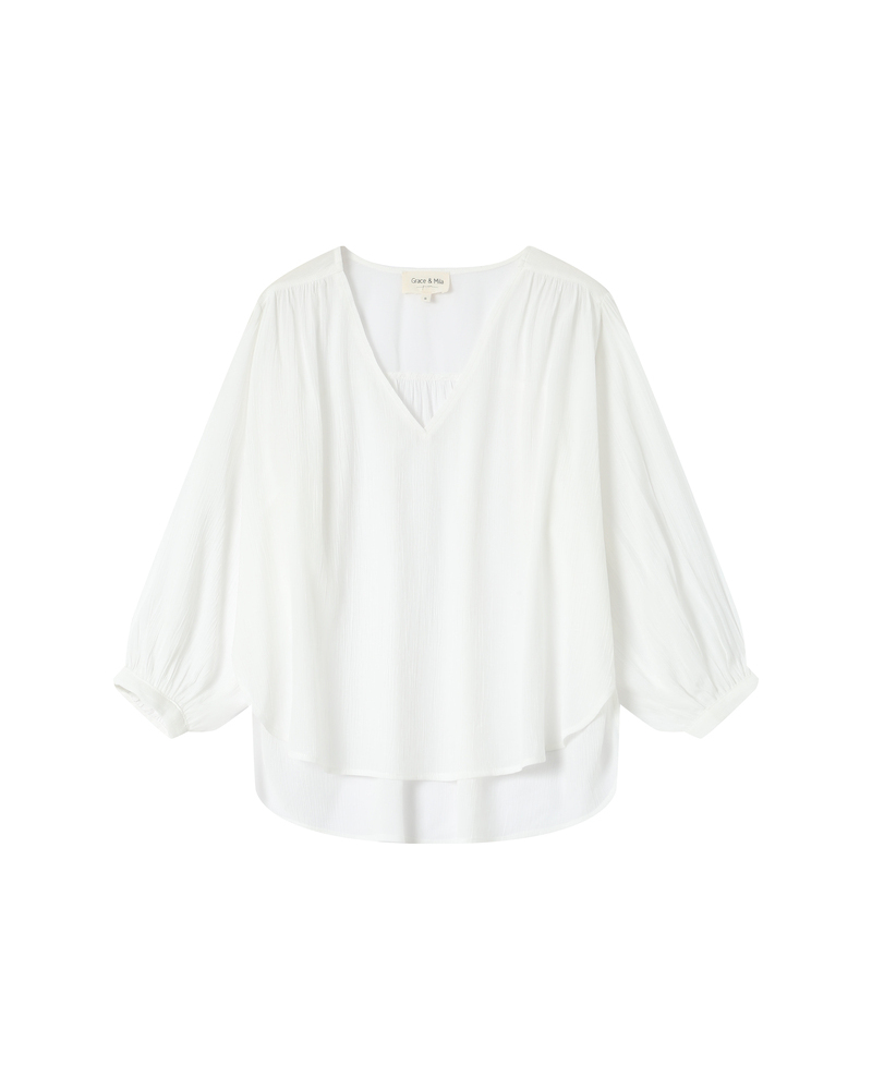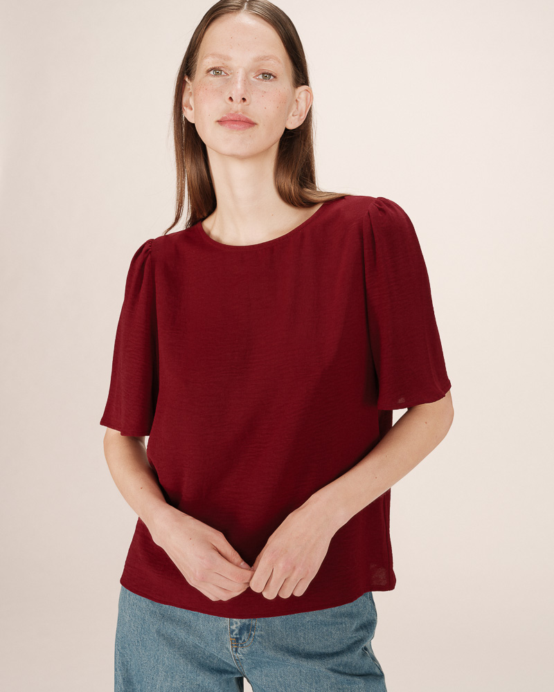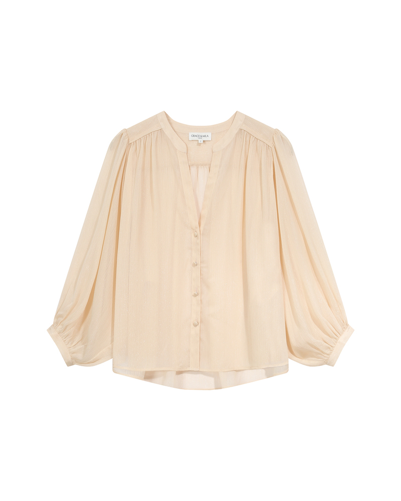 The TIMIDE 3/4-sleeve top features a straight cut, a V-neckline, and gathers at the shoulders for a feminine and relaxed look. This timeless piece is enhanced by a fabric with lurex, creating a luminous and elegant silhouette. The TIMIDE lurex top is a staple for every season.