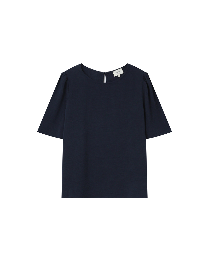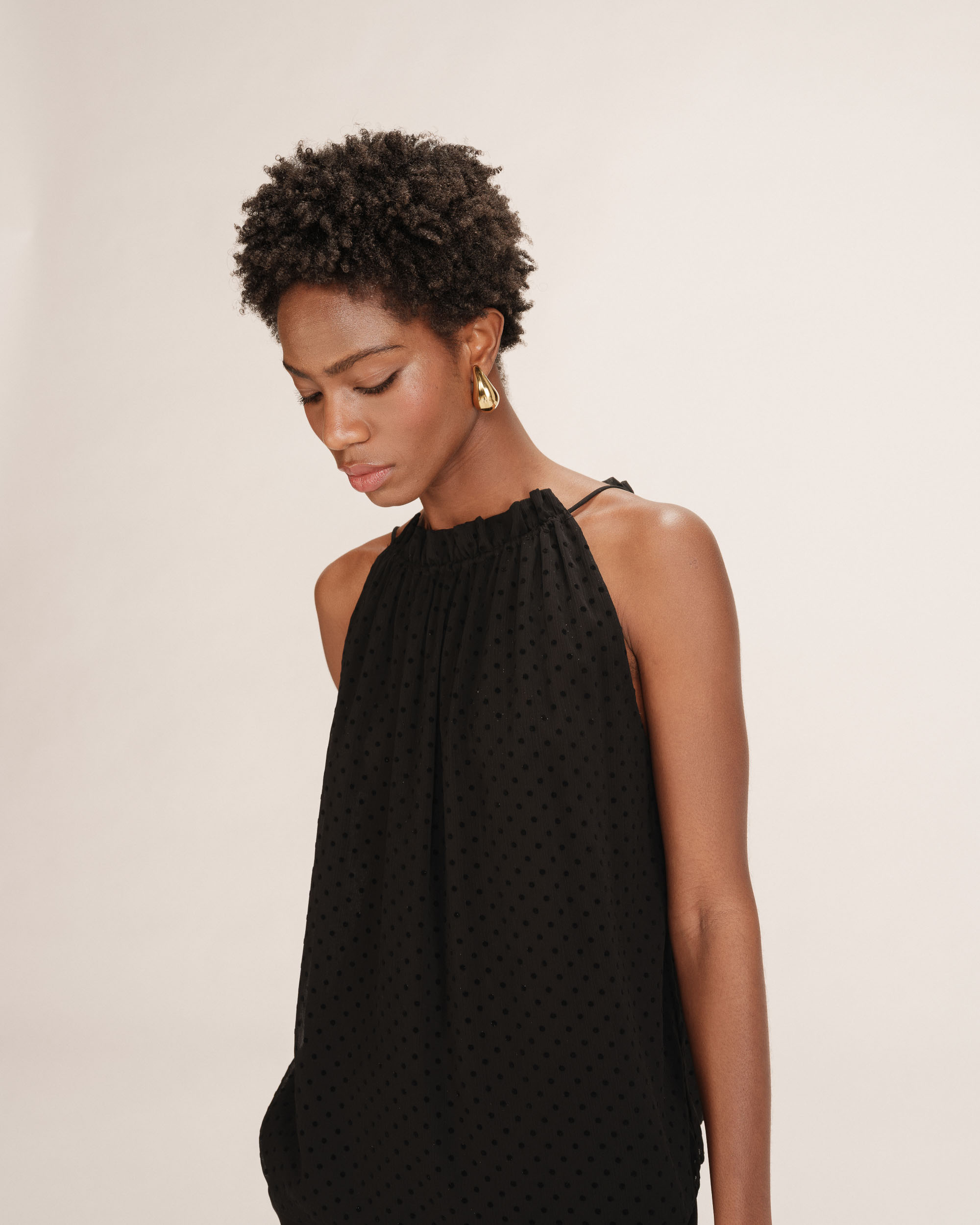 The TROY round-neck top is crafted from a flocked polka dot fabric for a feminine and timeless silhouette. The gathered round neckline at the front and back, combined with the fluid fabric, makes it a light and airy piece. The TROY polka dot top features a keyhole opening with a tie at the back that enhances the back with elegance. The design has a relaxed fit and is lined.