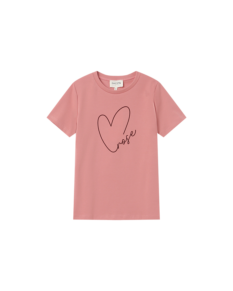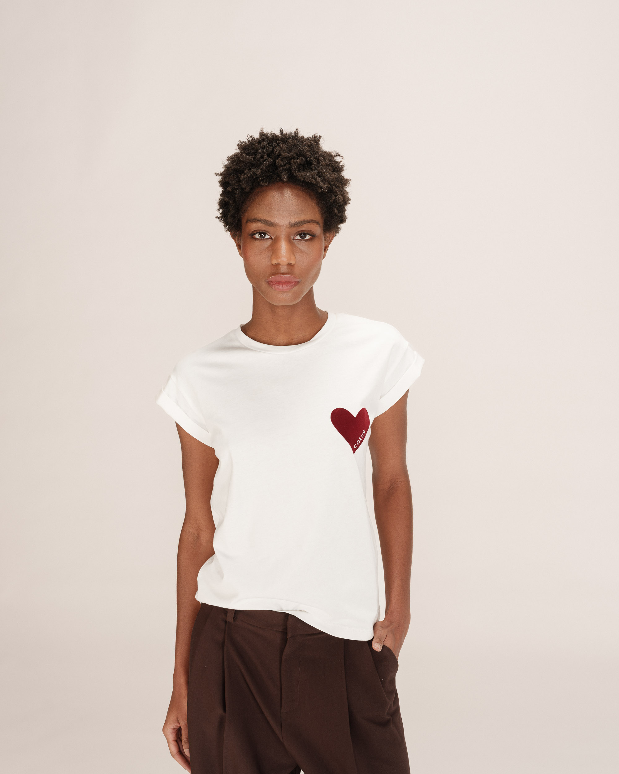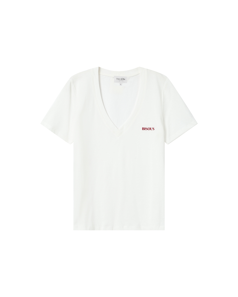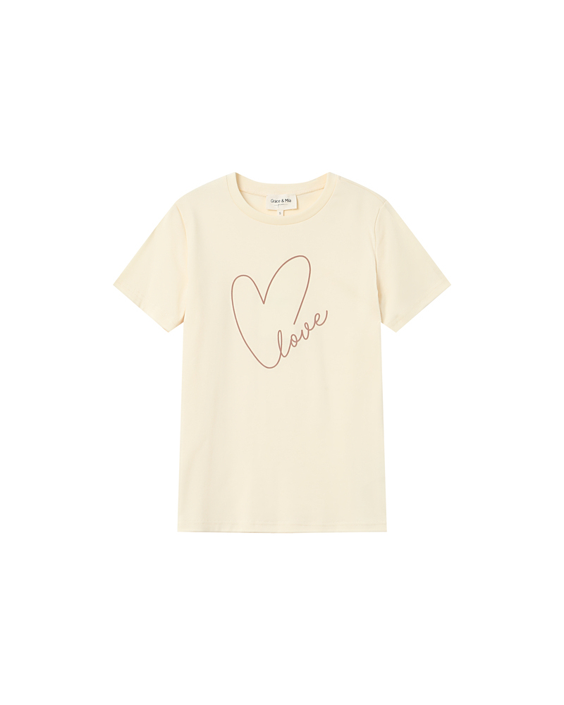 The TAKE short-sleeved T-shirt is made of 100% cotton. This everyday essential easily fits into the wardrobe. Its short sleeves, round neckline, and straight cut adapt to every woman's shape. The TAKE printed T-shirt is available with the messages 'KISS', 'HEART', and 'DREAM' printed inside a velvet heart.
