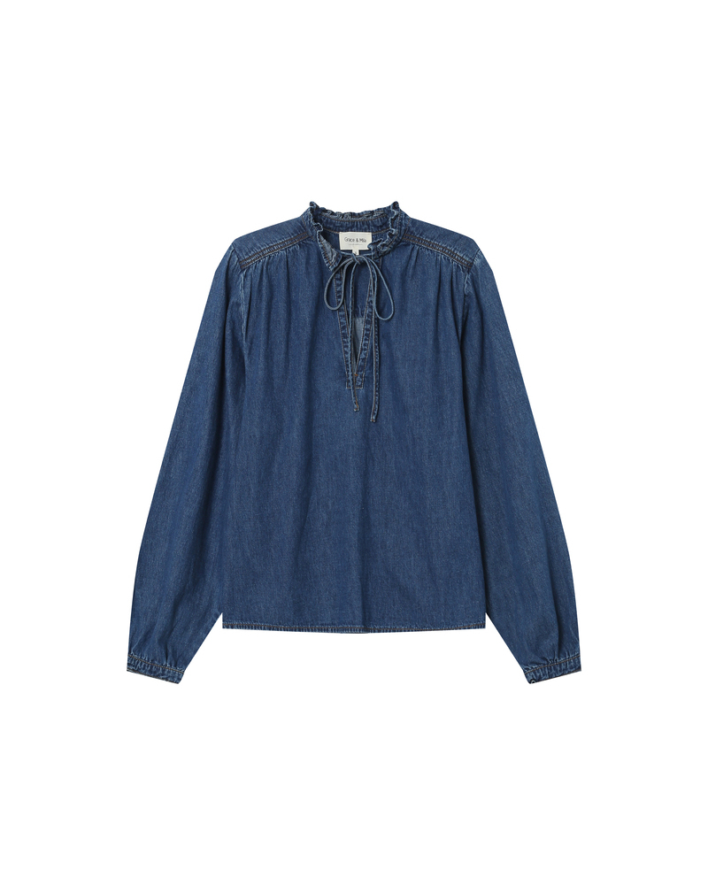 The SALSA long-sleeved blouse gives denim a delicate feminine twist. The collar is adorned with small ruffles, and the tie neckline adds a romantic touch to this everyday piece. The straight fit and subtle gathers of the SALSA denim blouse enhance the silhouette. The piece features an open V-neckline with a tie at the front.