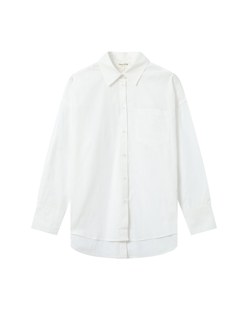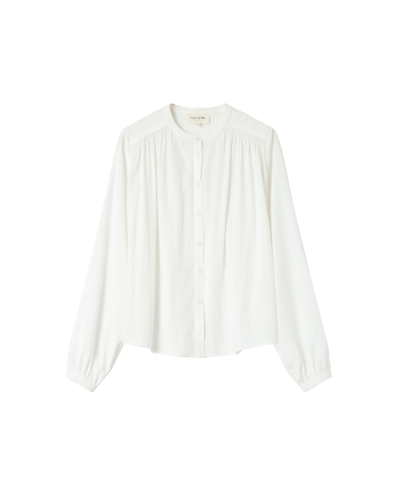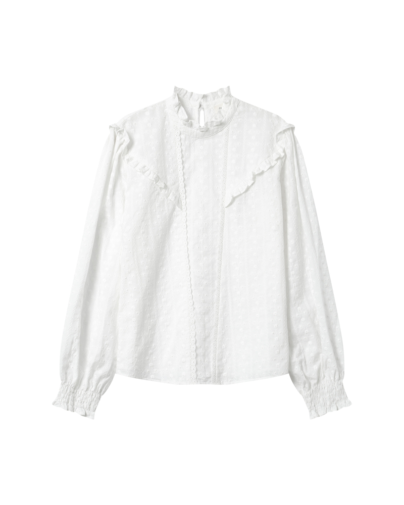 The SEDUCTIVE cotton blouse is a feminine and elegant piece enhanced by refined details. The ruffles on the front and the smocked cuffs create a classic and timeless silhouette. The model is elevated by a round neckline and a buttoned teardrop opening at the back.