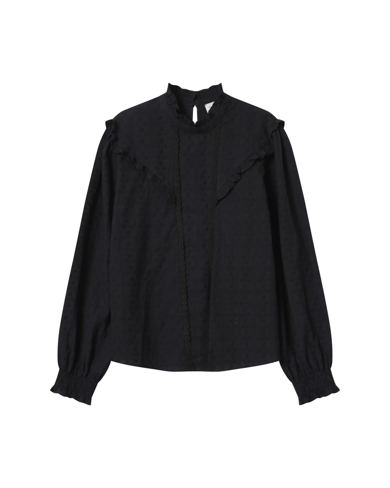 The SWING lace blouse, with its vintage and romantic vibe, is a boldly feminine piece. It features ruffled cuffs and lace trim at the neckline, offering a classic and elegant silhouette. The straight cut and buttoned long sleeves of the SWING round neck blouse make it a chic and timeless style.