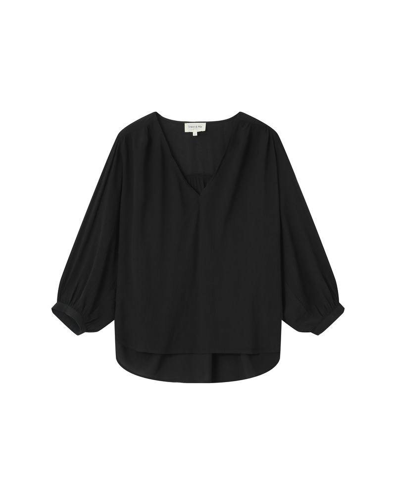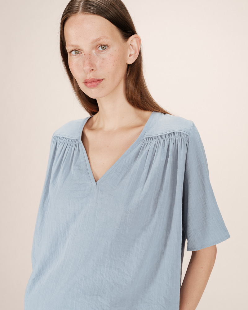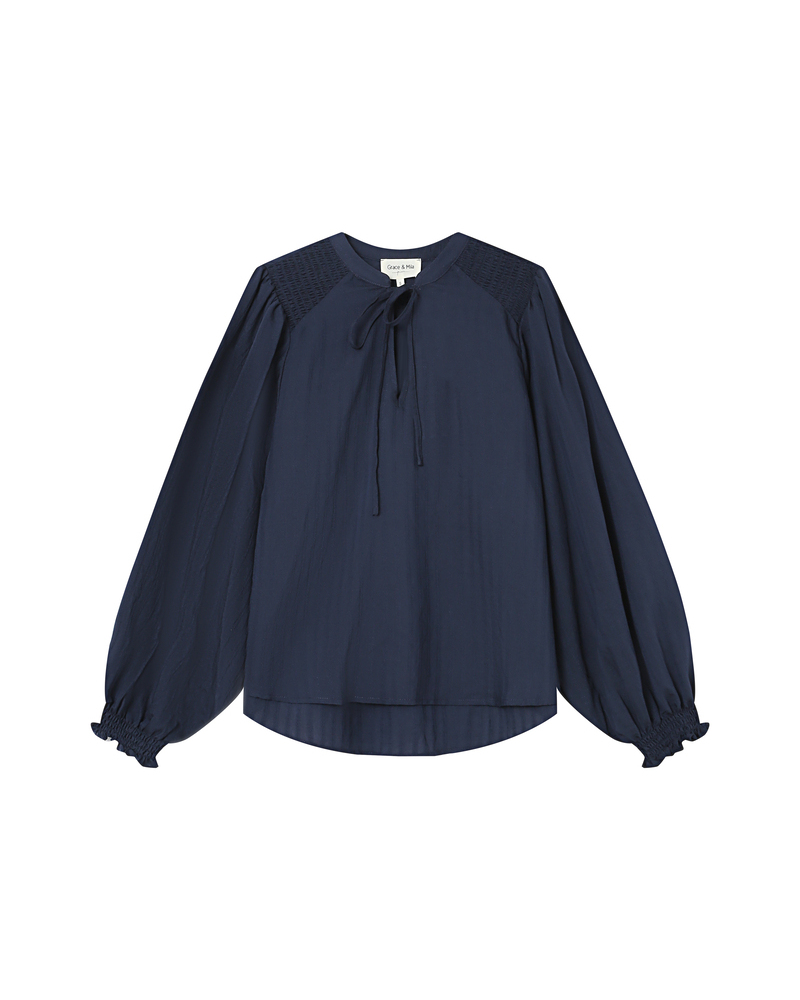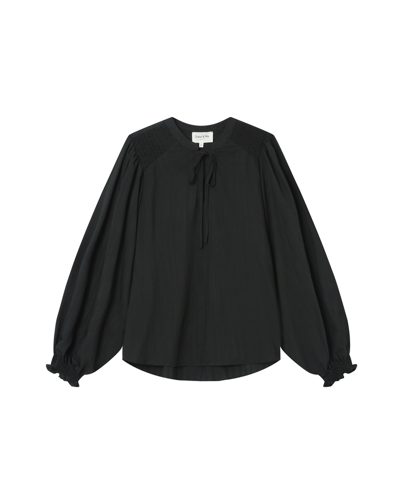 The SERINDA long-sleeved blouse features a straight cut and delicate finishes. The V-neckline with tie detail adds a romantic touch, while the smocking at the shoulders and cuffs brings charm and texture. Inspired by a modern bohemian style, the SERINDA flowy blouse offers an elegant and feminine silhouette.