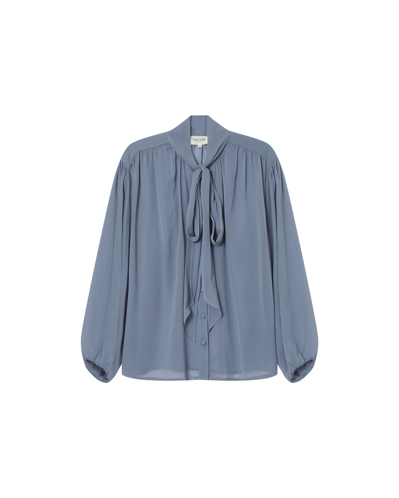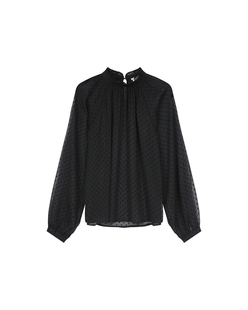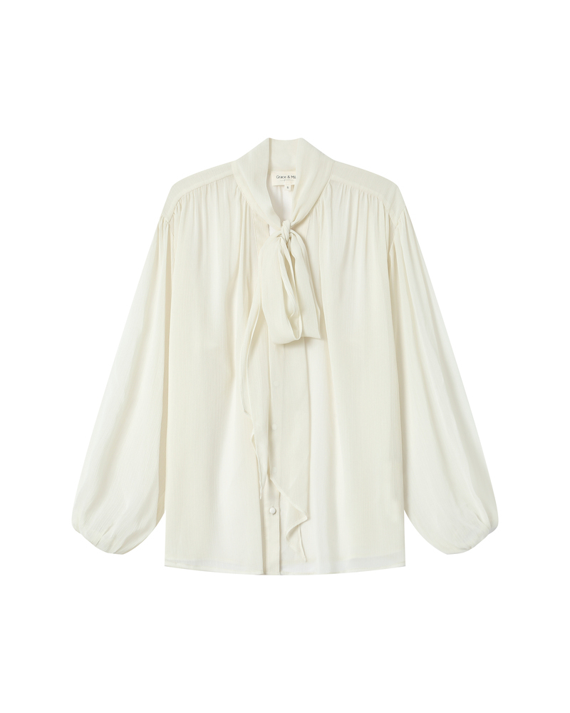 The SPLENDIDE long-sleeved blouse embodies both gentle and confident femininity with its tie-neck collar and refined details. Made from lightweight sheer fabric, this piece offers a fluid drape and a relaxed fit. The gathers at the shoulders and the covered buttons on the SPLENDIDE sheer blouse add a sophisticated touch.