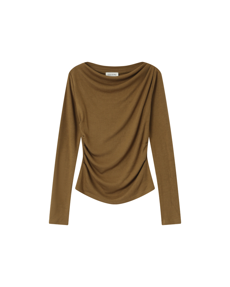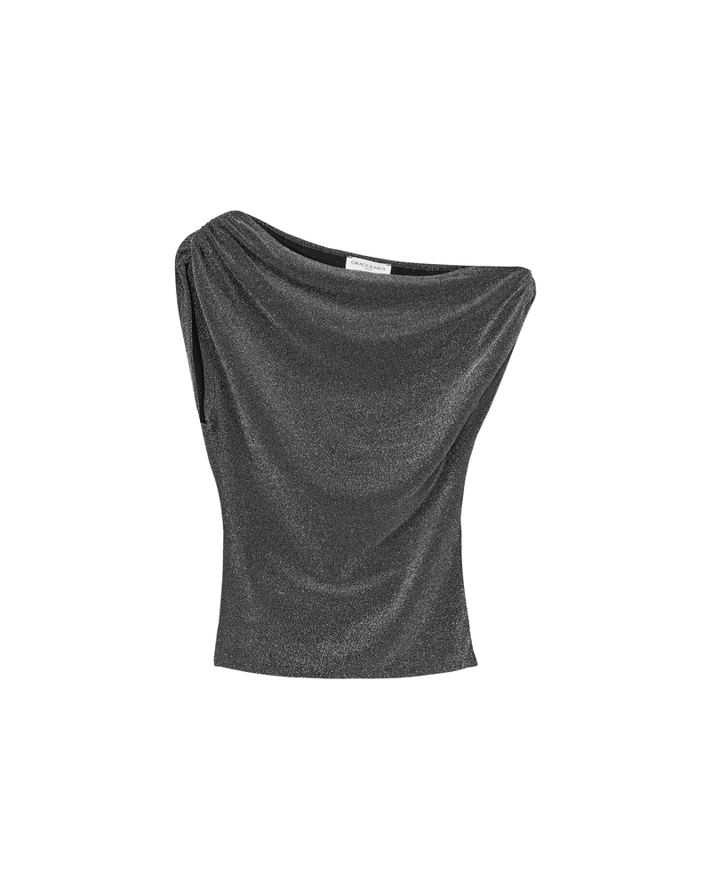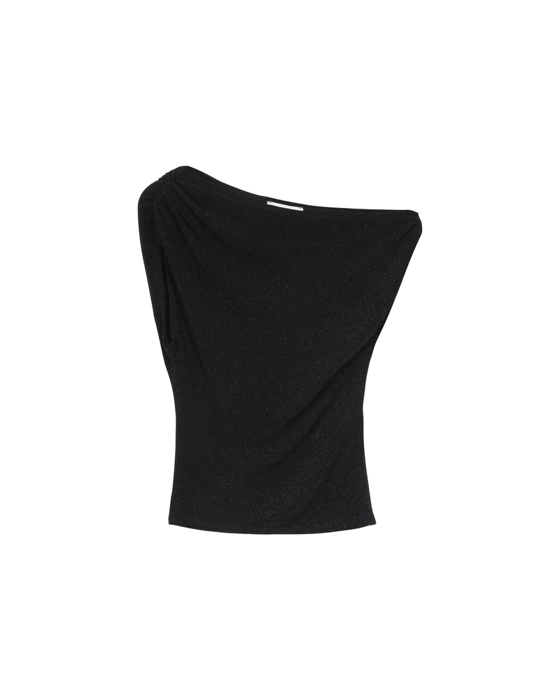 The THAO asymmetrical top is enhanced with lurex jersey fabric, offering a modern and feminine silhouette. Its asymmetrical, fitted cut is paired with gathered shoulders to create a draped effect that highlights the curves. The THAO draped top brings a sophisticated and bold touch to the collection.