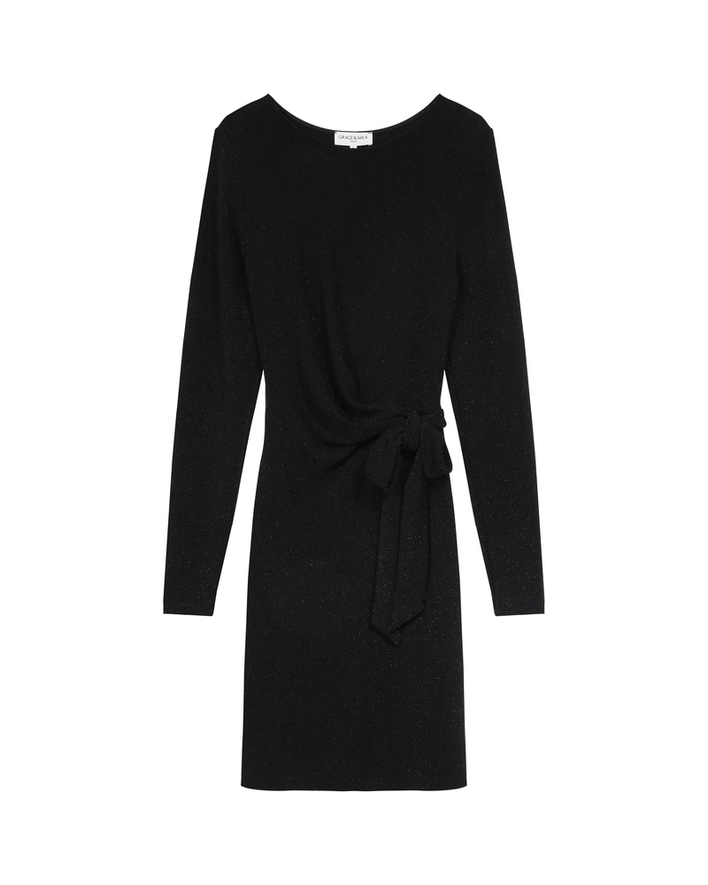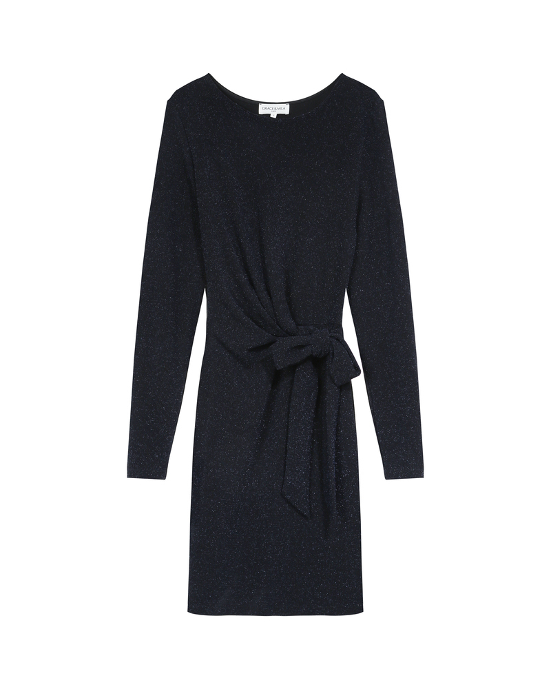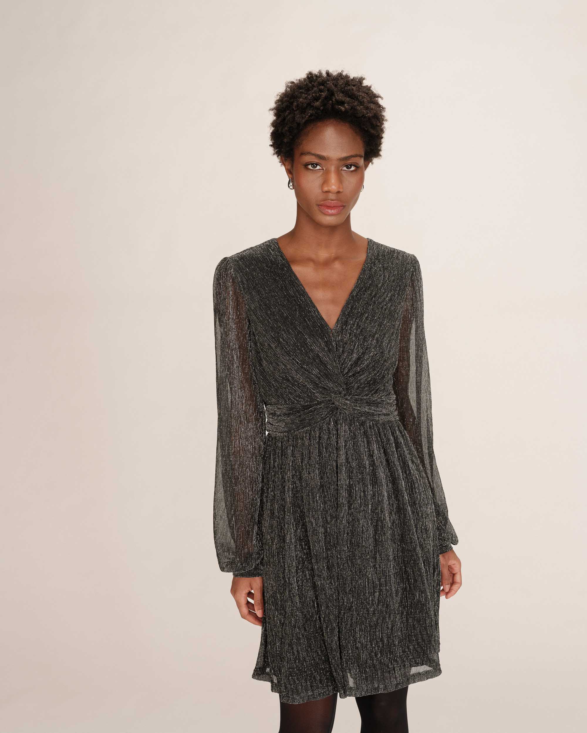 Feminine and elegant, the TEA short dress is a must-have for the festive wardrobe of the collection. The lurex jersey enhances the piece, creating a radiant silhouette. The fluid fabric and fitted cut are combined with a tie belt at the waist to hug the curves and add movement. The TEA lurex dress features a round neckline and long sleeves.