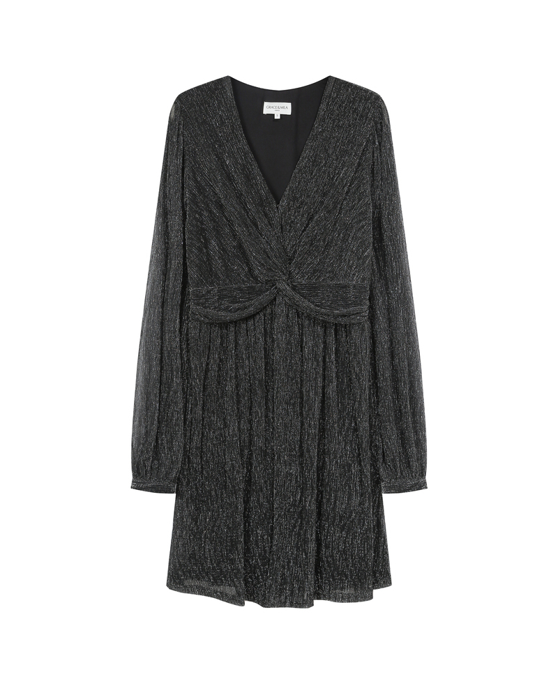 Le tissu plissé de la robe courte TESS est sublimé par un fil métallisé en lurex créant une silhouette festive et lumineuse. Doublée sur le devant et le dos, la robe en lurex TESS dévoile en transparence les épaules. Les éléments tels que les manches longues et bouffantes ou encore l'encolure en V soulignent la féminité du modèle. Le nœud sur le devant et la taille smockée au dos marquent la taille avec élégance.