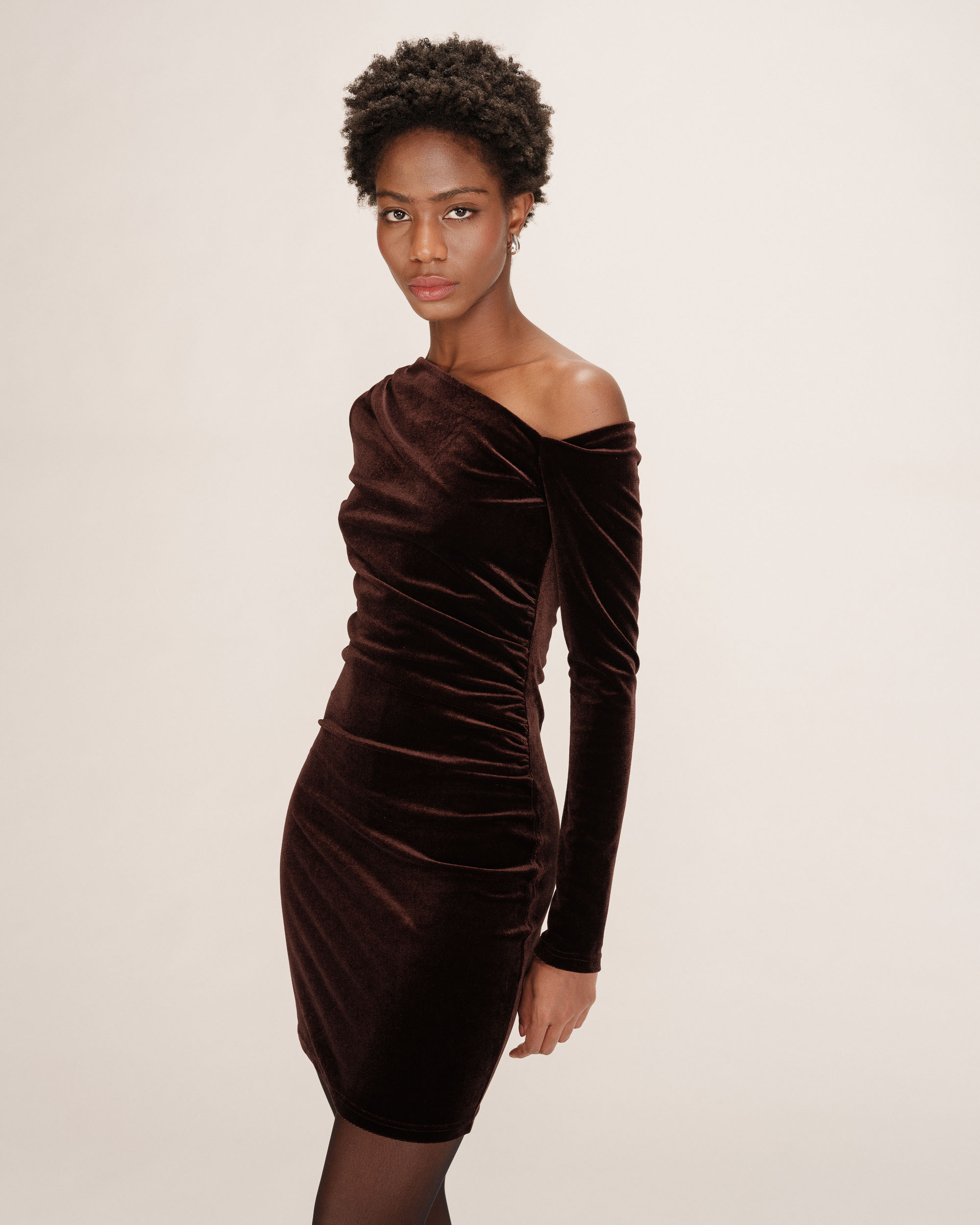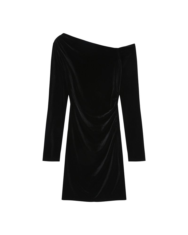 Crafted in velvet fabric, the TRINITE short dress is enhanced by an asymmetric neckline that elegantly reveals the shoulders. The gathers at the waist and shoulder create draping at the front and add movement to the silhouette. The TRINITE velvet dress is a truly feminine and trendy piece for a chic, modern look.