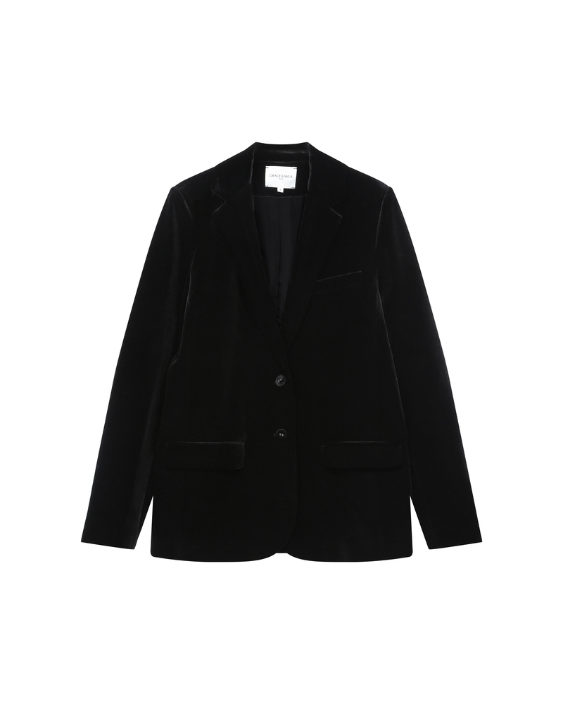 La maison revisite cet essentiel du vestiaire féminin/masculin dans un tissu en velours pour une allure glamour et féminine. La coupe droite du veston en velours TOTEM structure la silhouette, tandis que le col en V ajoute une touche de féminité. Le modèle possède une patte de boutonnage ainsi que deux poches passepoilées sur le devant.