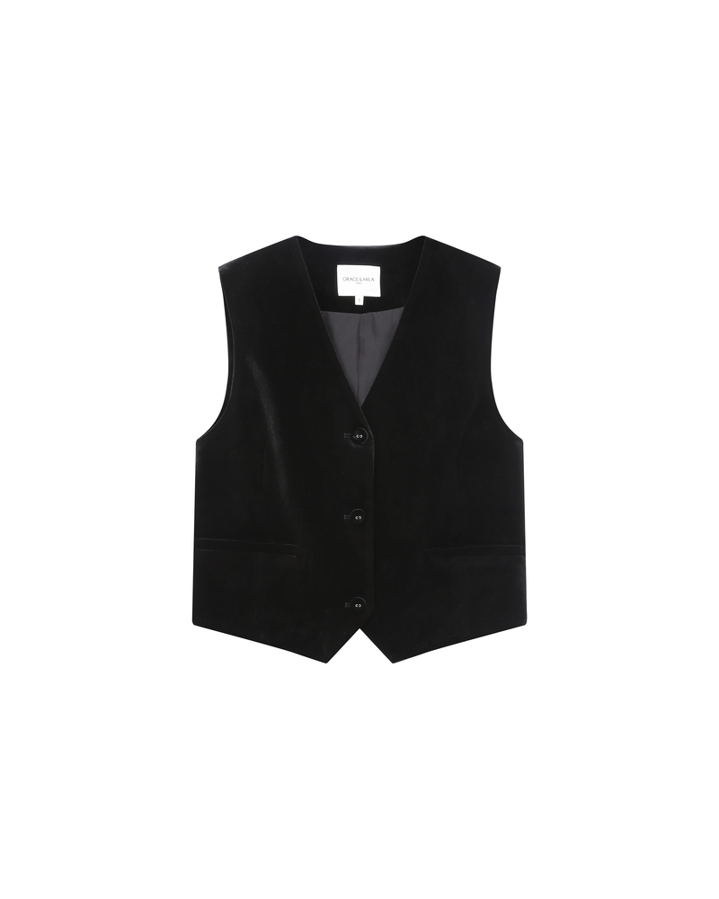 The house reinterprets this essential of the feminine/masculine wardrobe in a velvet fabric for a glamorous and feminine look. The straight cut of the TOTEM velvet vest structures the silhouette, while the V-neck adds a touch of femininity. The model features a buttoned front and two welt pockets on the front.