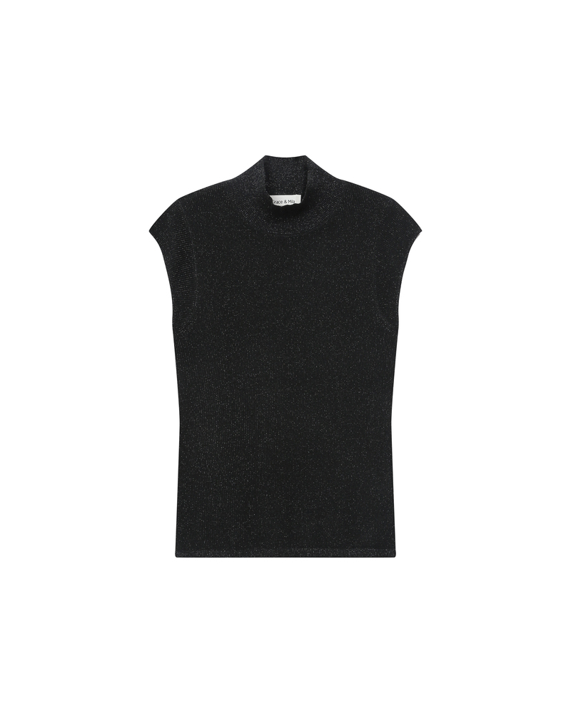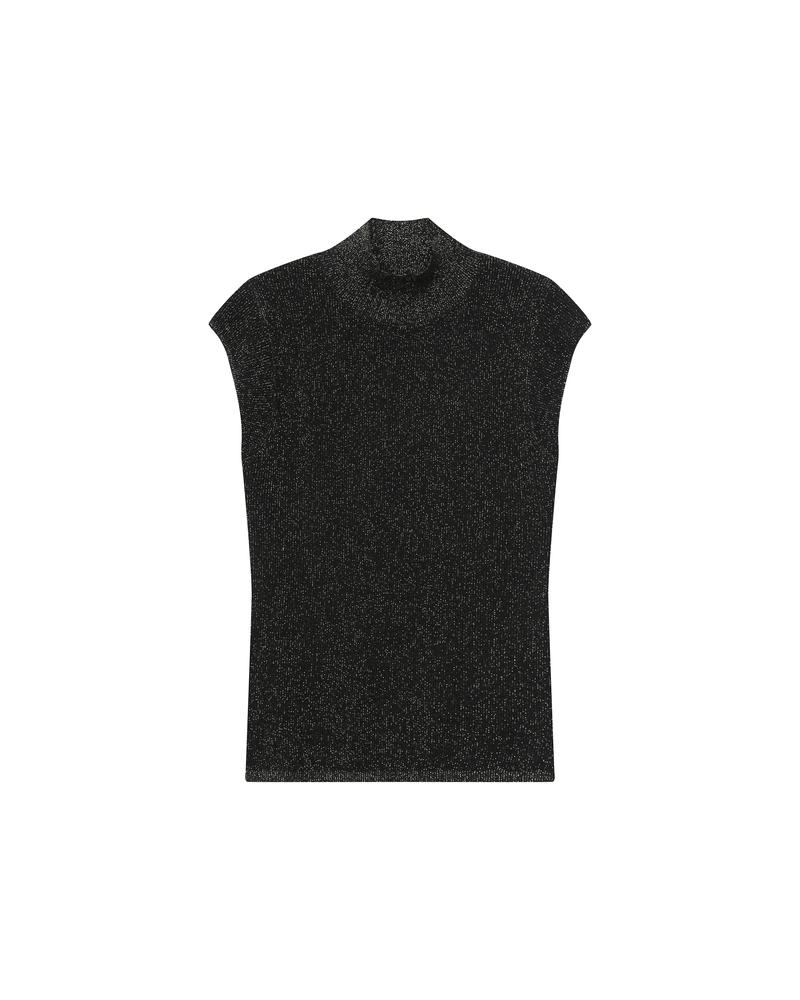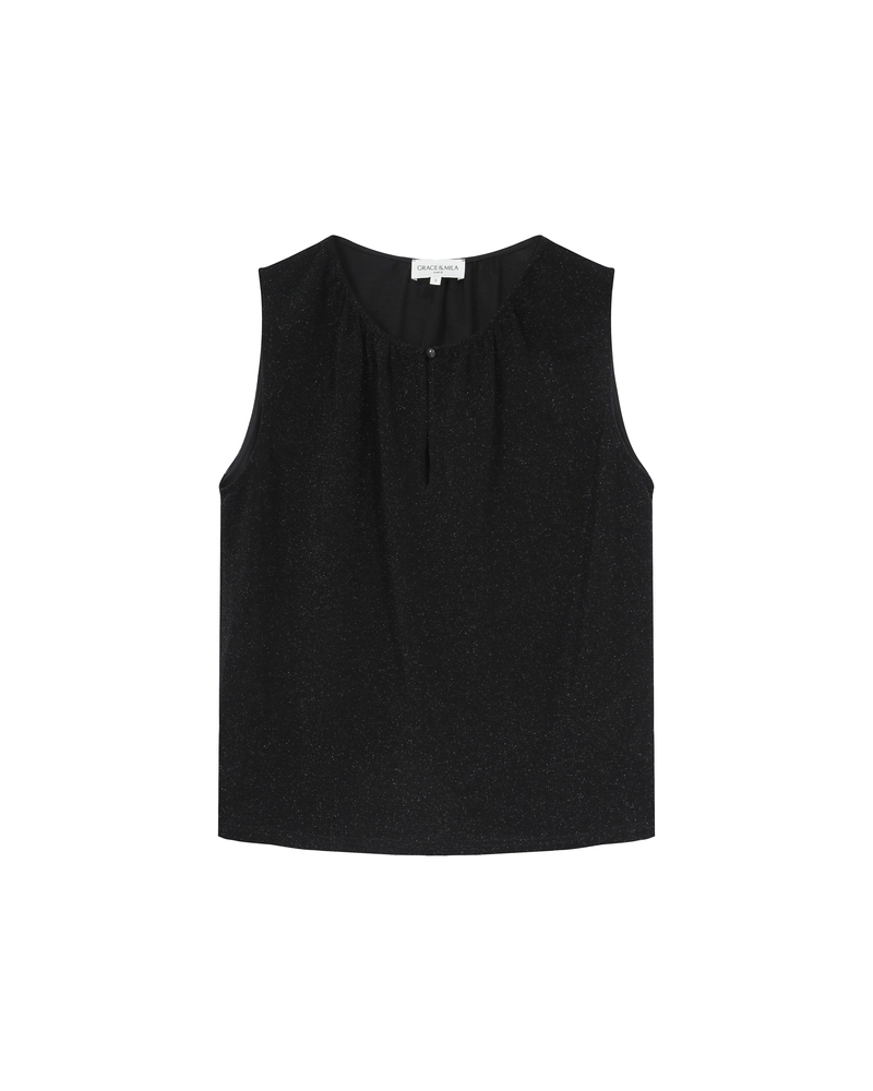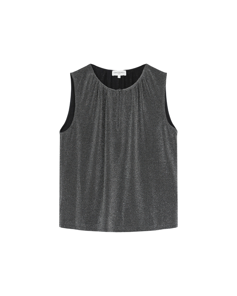 The TEXTO sleeveless top, crafted in lurex, creates a bold and sophisticated silhouette. The top features a buttoned keyhole opening at the front and gathers at the neckline, making it a feminine and elegant piece. The TEXTO lurex top has a fluid, straight cut that enhances feminine curves.