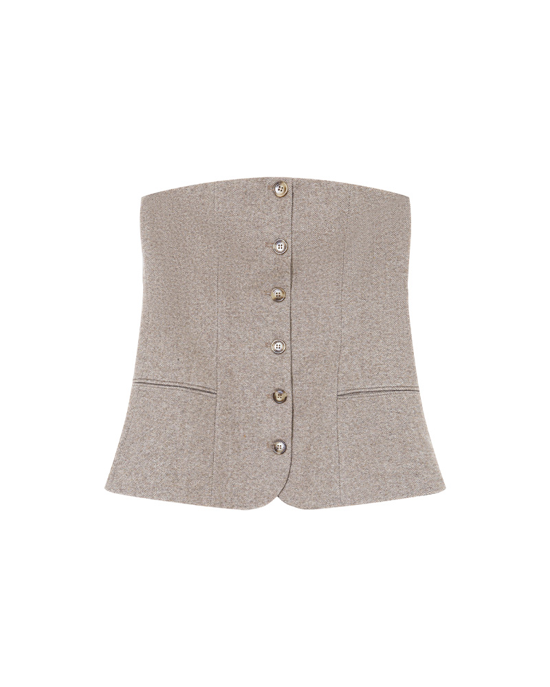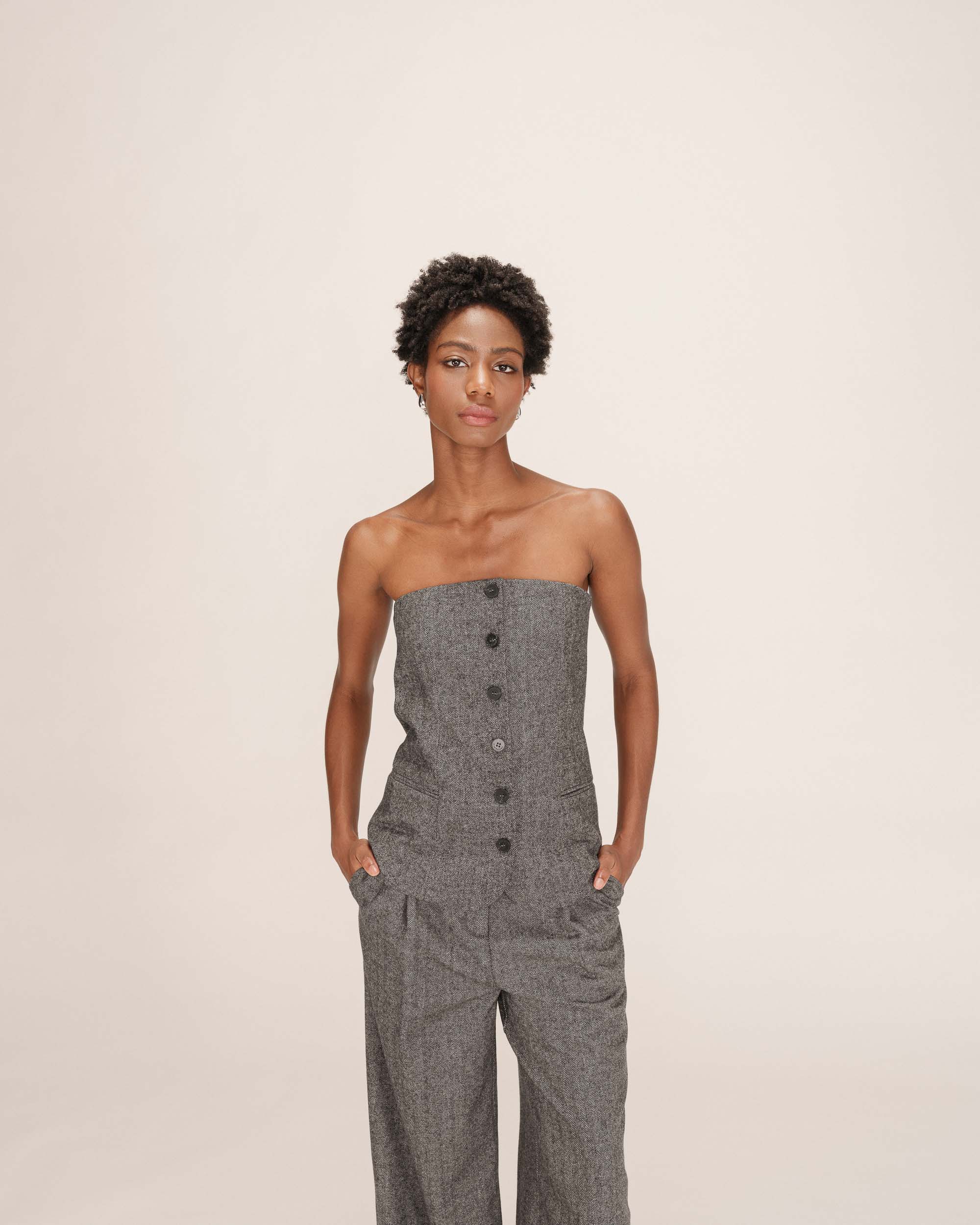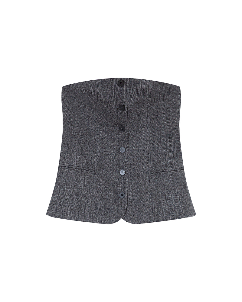 Crafted from a wool blend, the TANDEM fitted bustier is a bold and sophisticated piece. The fitted cut enhances feminine curves and creates a structured, elegant silhouette. The design features faux pockets and a faux button placket at the front. The TANDEM wool bustier has an elasticated back and a side zip fastening, offering both comfort and practicality.