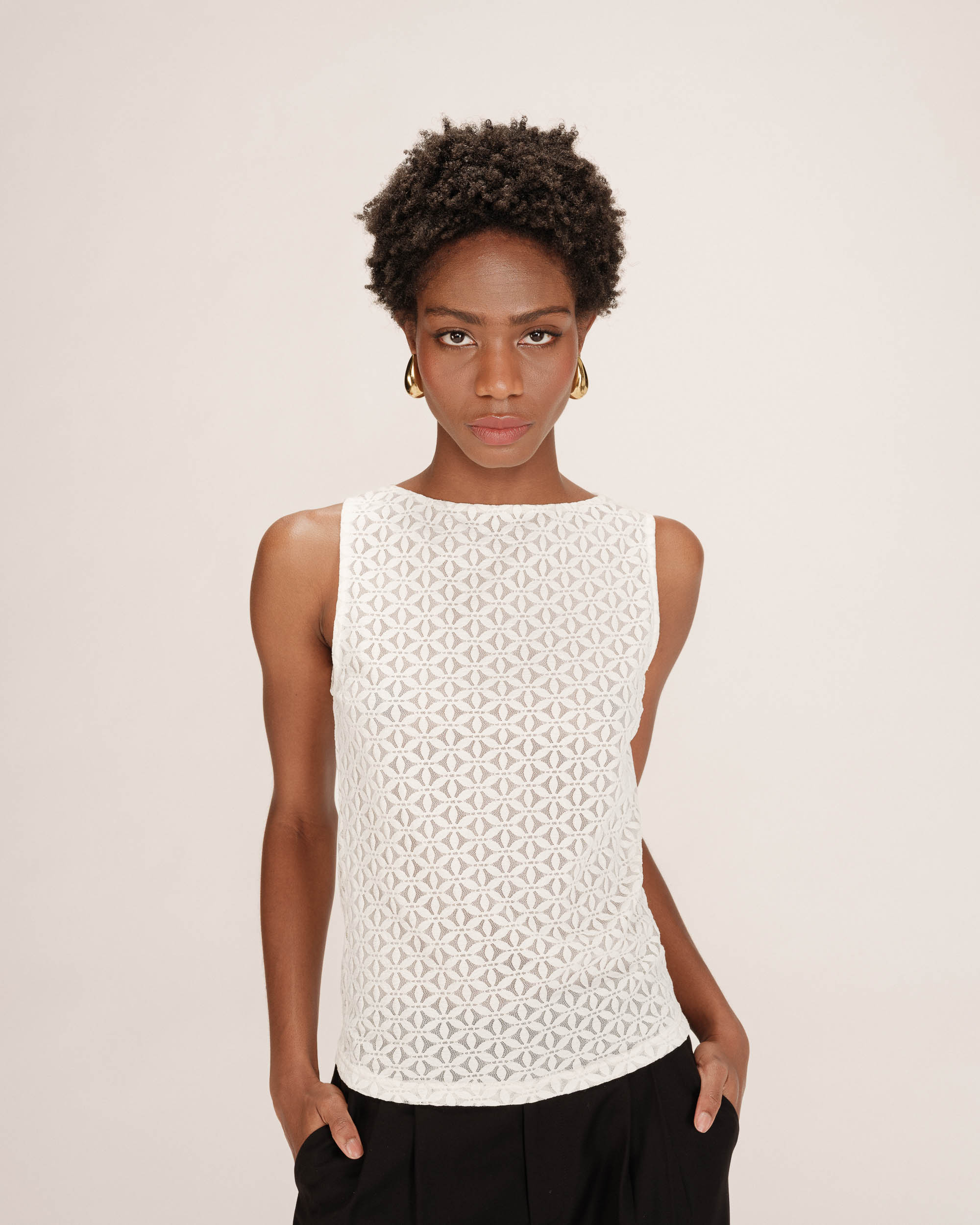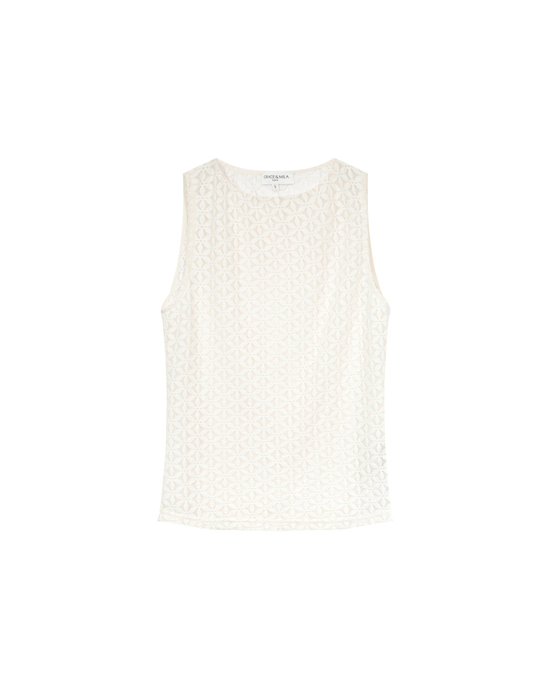 The TENET sleeveless top is enhanced by delicate lace fabric that creates a sensual and refined silhouette. Lined at the front and sheer at the back, the design gracefully reveals feminine curves. The fitted cut and boat neckline make the TENET lace top a sophisticated and feminine piece.