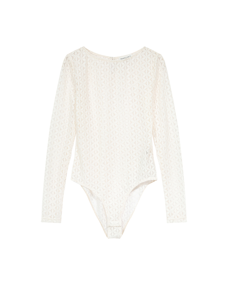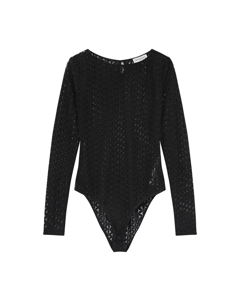 The TANGUY long-sleeved bodysuit is enhanced with transparent lace fabric for a look that is both modern and refined. Details such as the teardrop opening at the back and the boat neckline make it a truly sophisticated piece. The TANGUY lace bodysuit features a fitted cut that highlights feminine curves, along with snap fasteners at the crotch for added practicality.