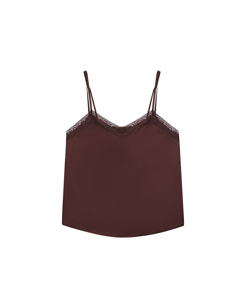 The TREFLE sleeveless camisole is enhanced by a satin fabric that creates a fluid and refined silhouette. The V-neckline is adorned with a lace trim that highlights the décolleté, while the upper back is embellished with an exclusive «Grace» embroidery. The TREFLE satin camisole features a straight cut with thin adjustable straps.