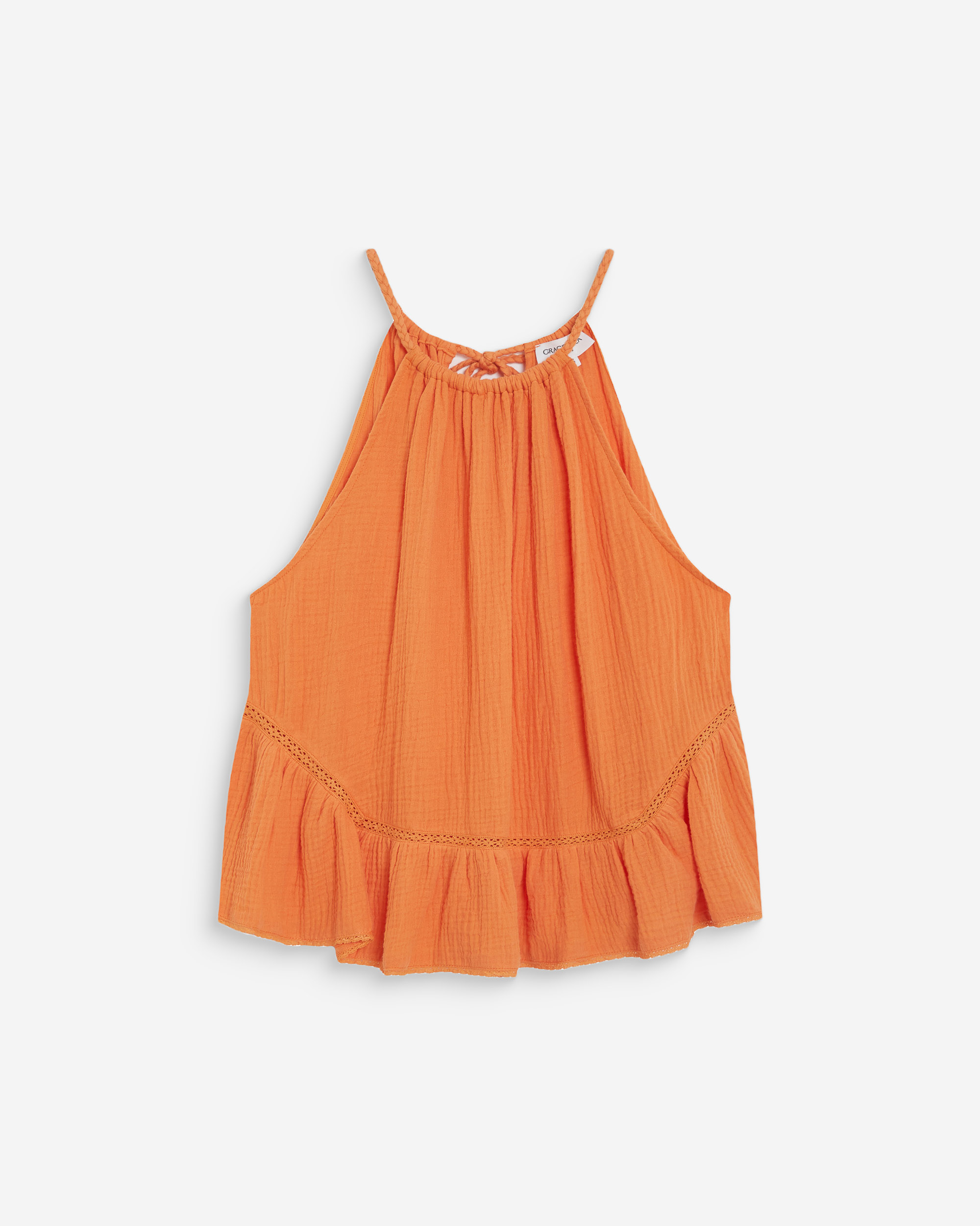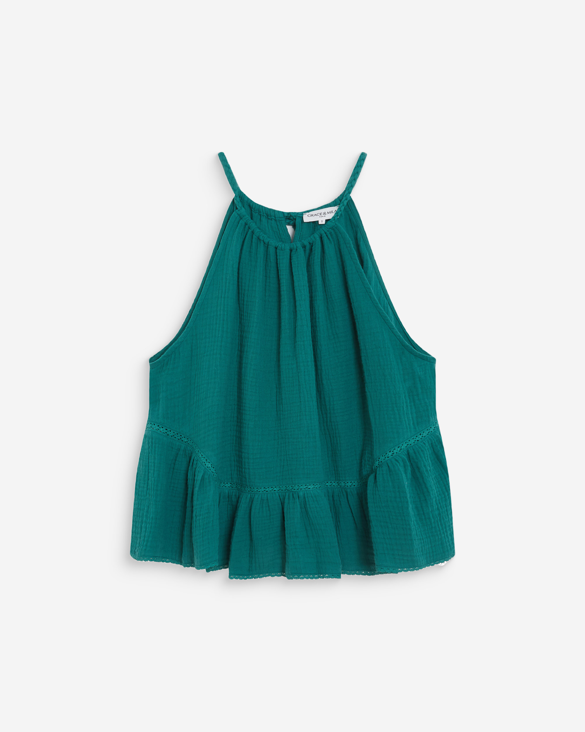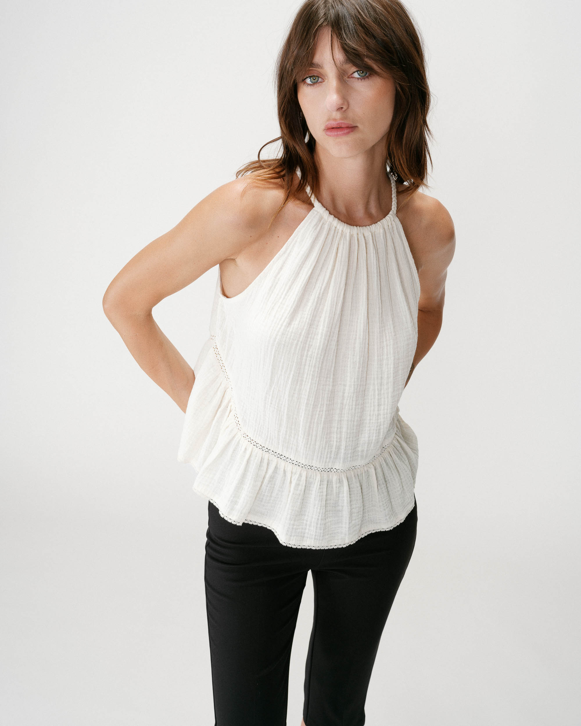 The sleeveless top WIDY, made from 100% cotton, offers a light and relaxed silhouette. Pleats at the neckline are paired with a ruffle at the hem to create movement and volume. The cotton top WIDY has a braided tie at the neckline.