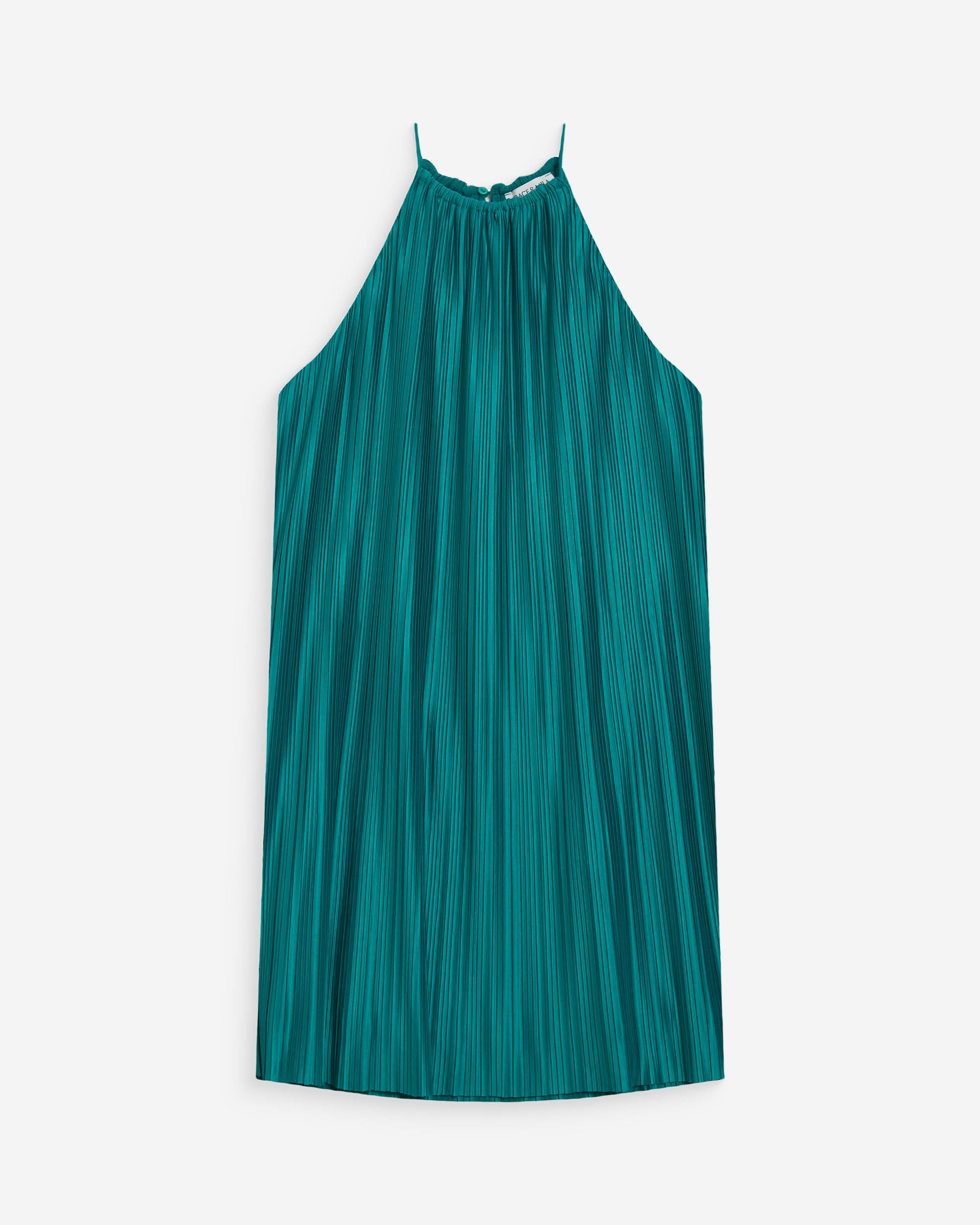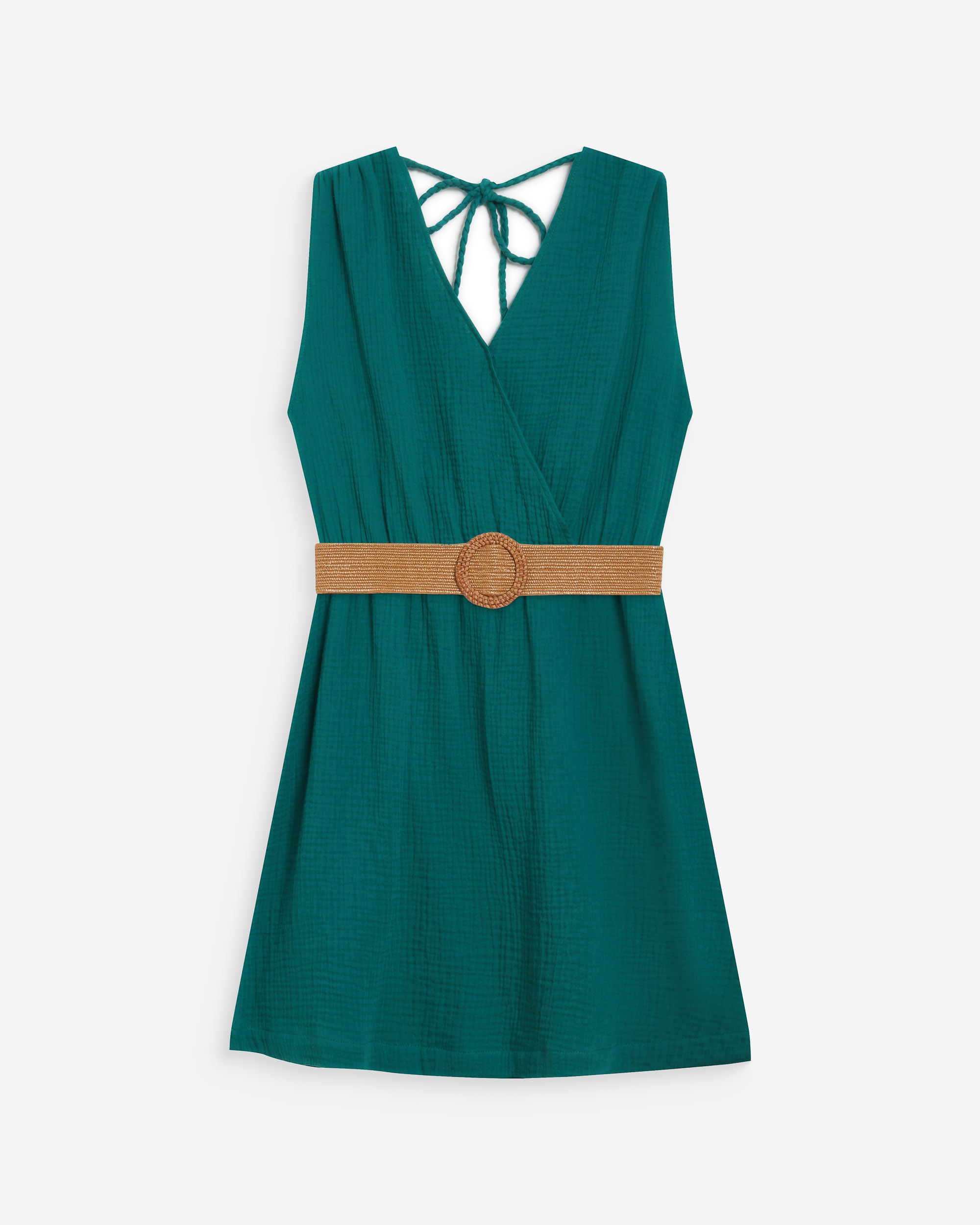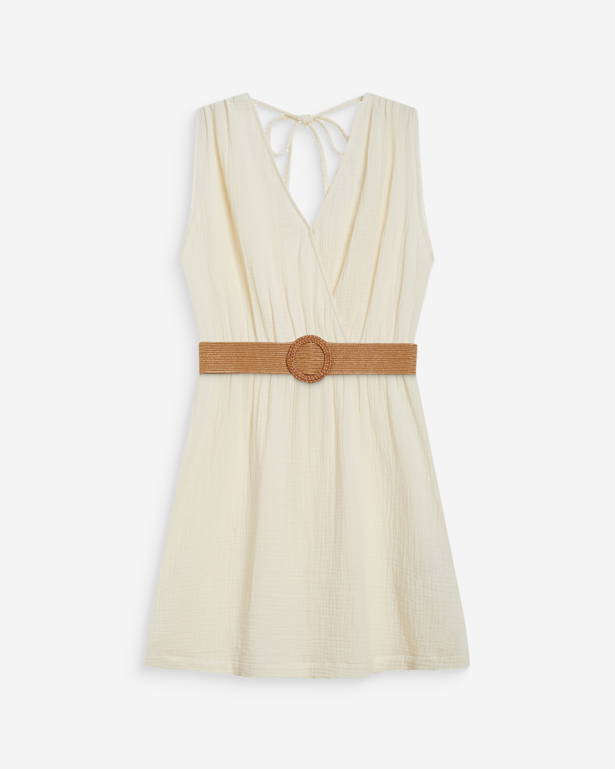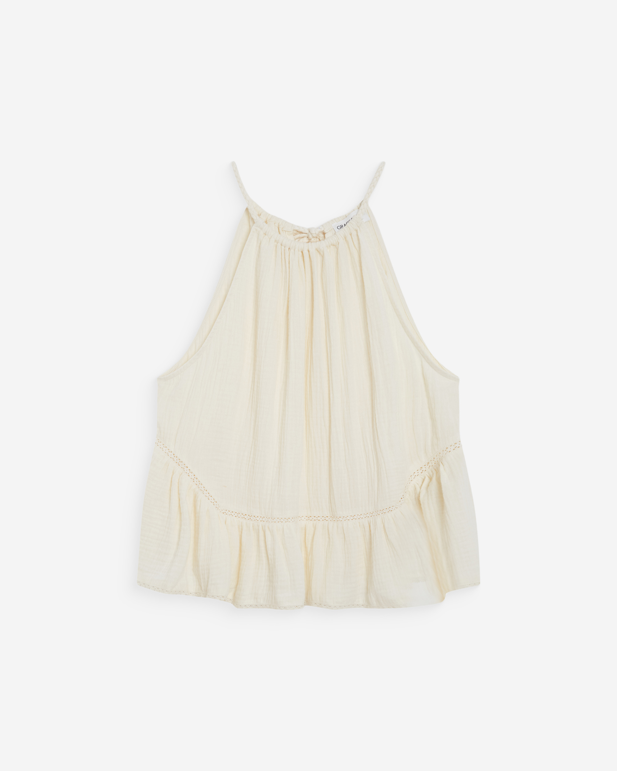 The sleeveless top WIDY, made from 100% cotton, offers a light and relaxed silhouette. Pleats at the neckline are paired with a ruffle at the hem to create movement and volume. The cotton top WIDY has a braided tie at the neckline.