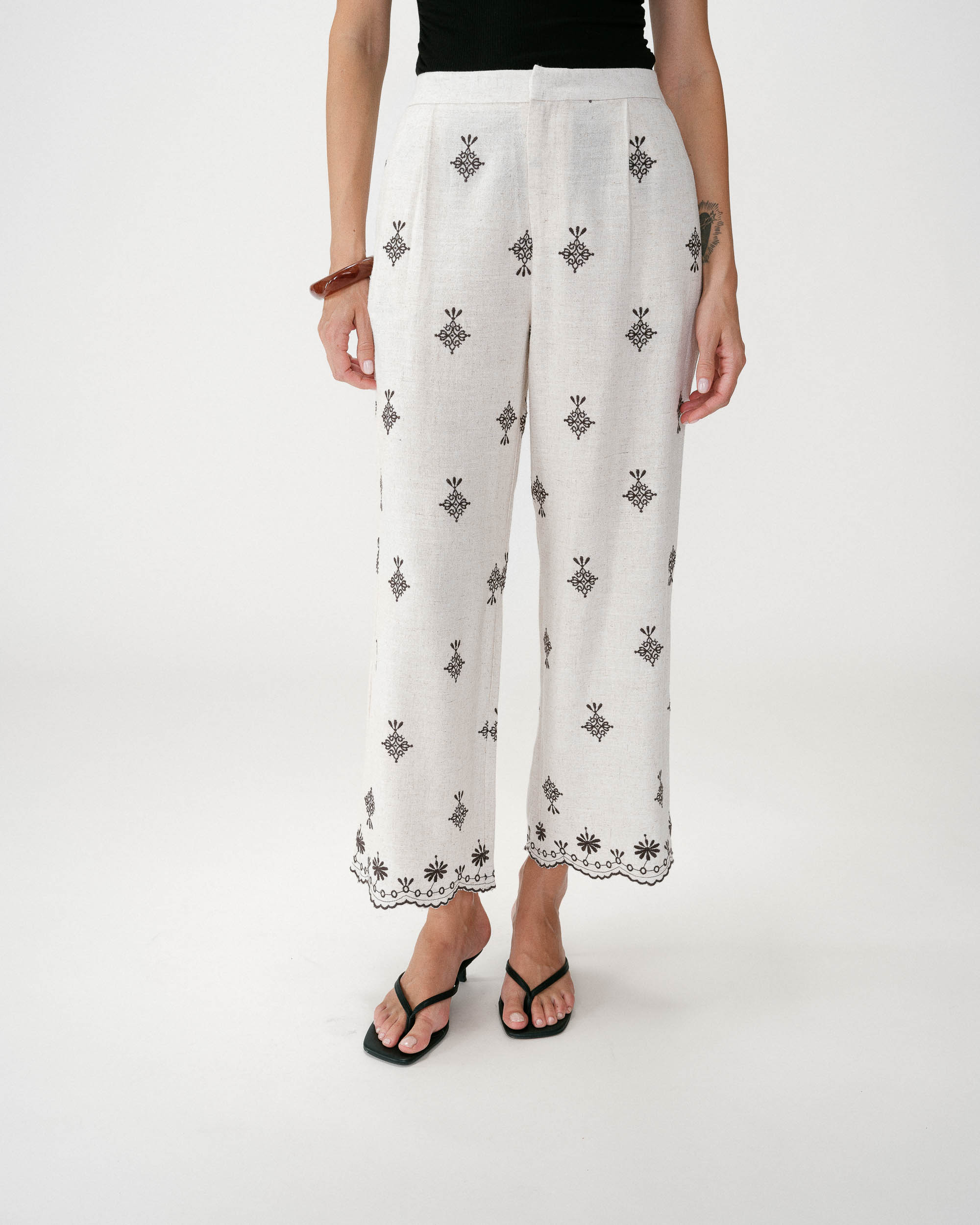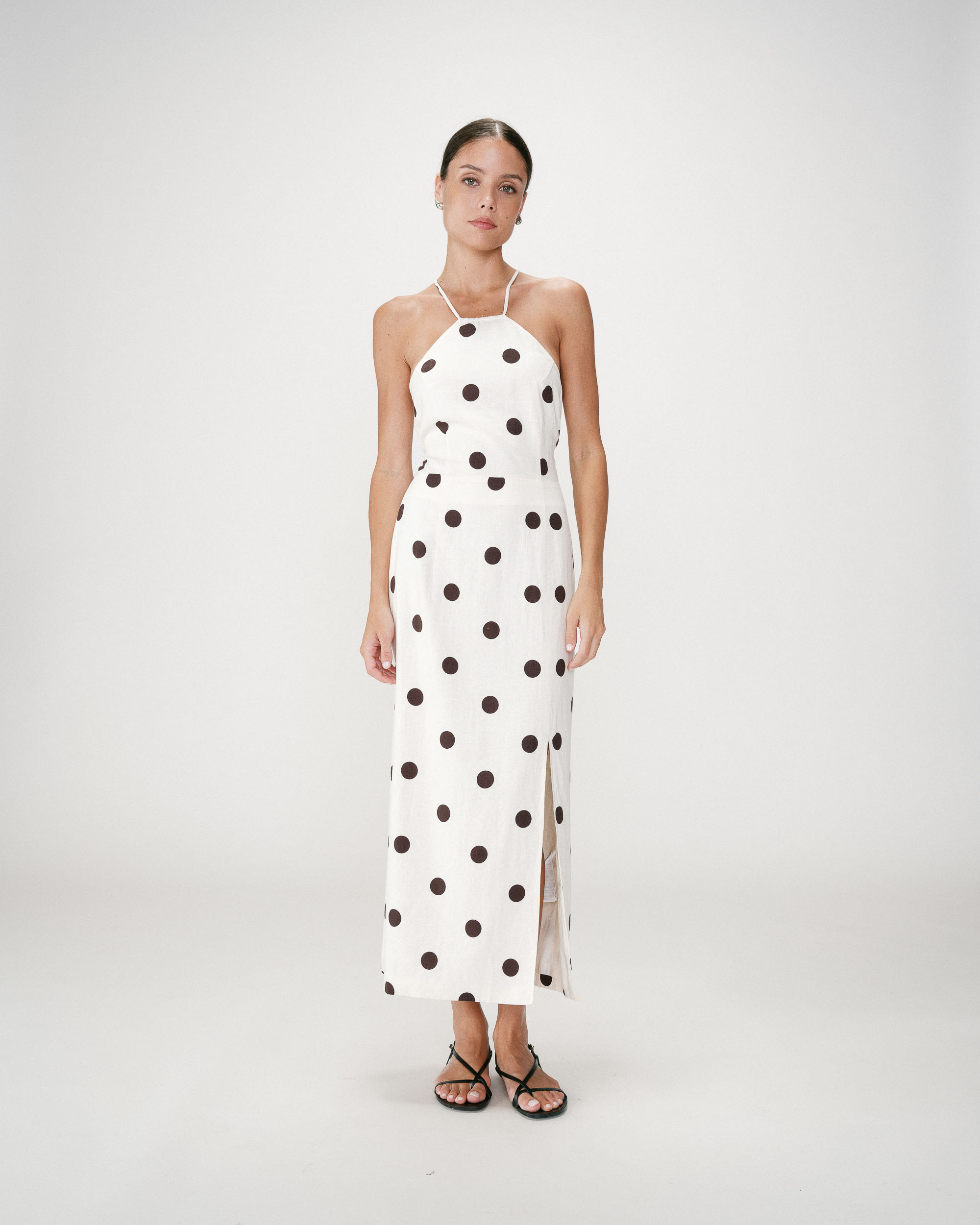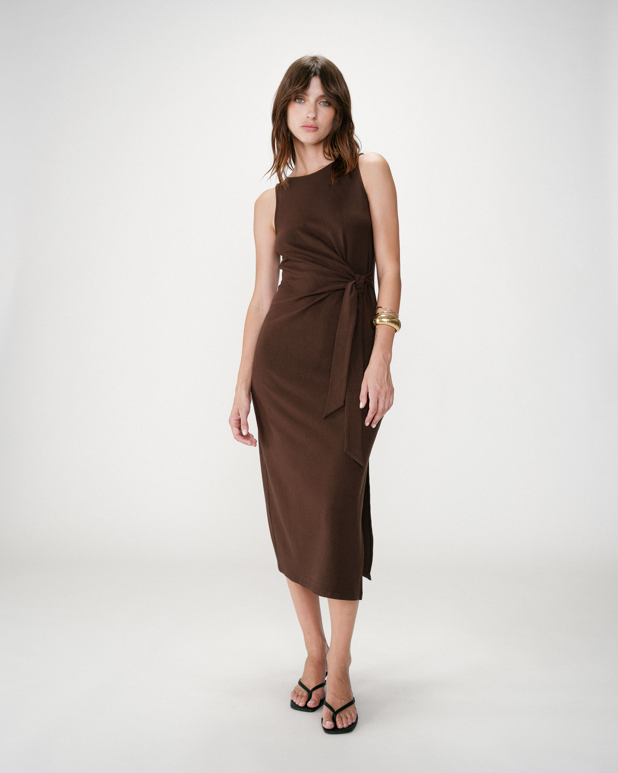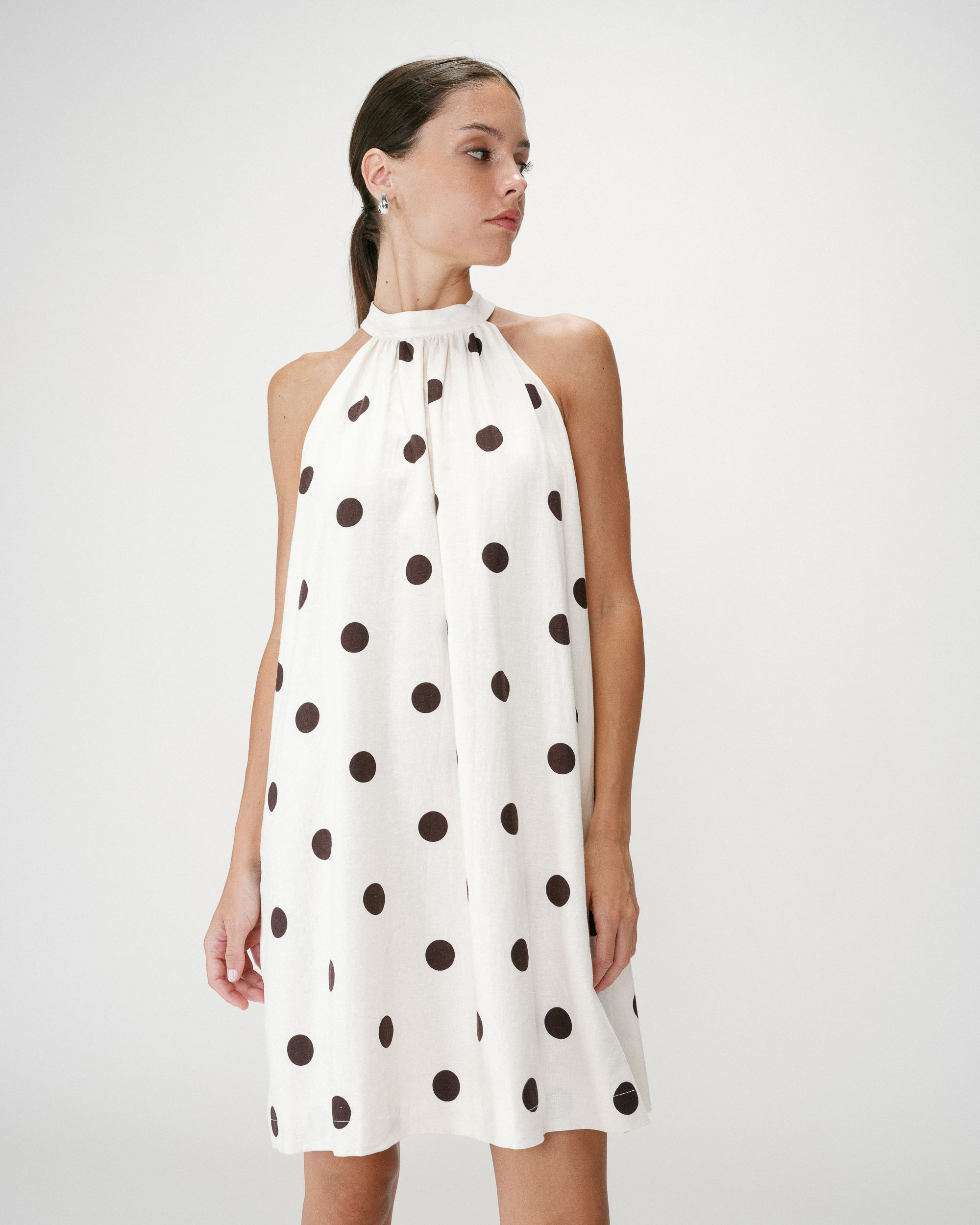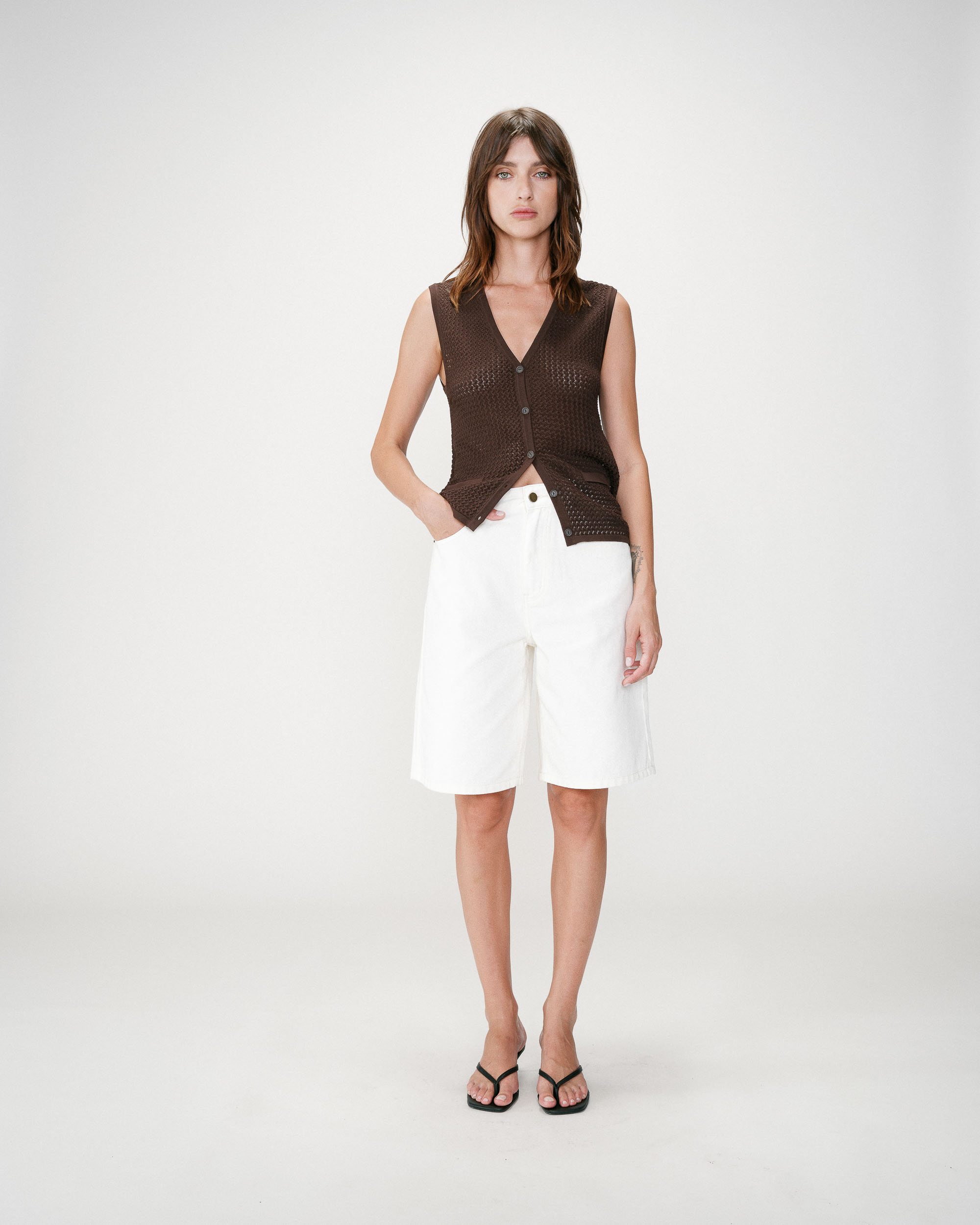 The sleeveless top WAITING, made from eyelet fabric, is a carefully crafted piece. The pointed cut and clean lines highlight its simplicity. The open back is enhanced with ties to create a sensual and feminine look.