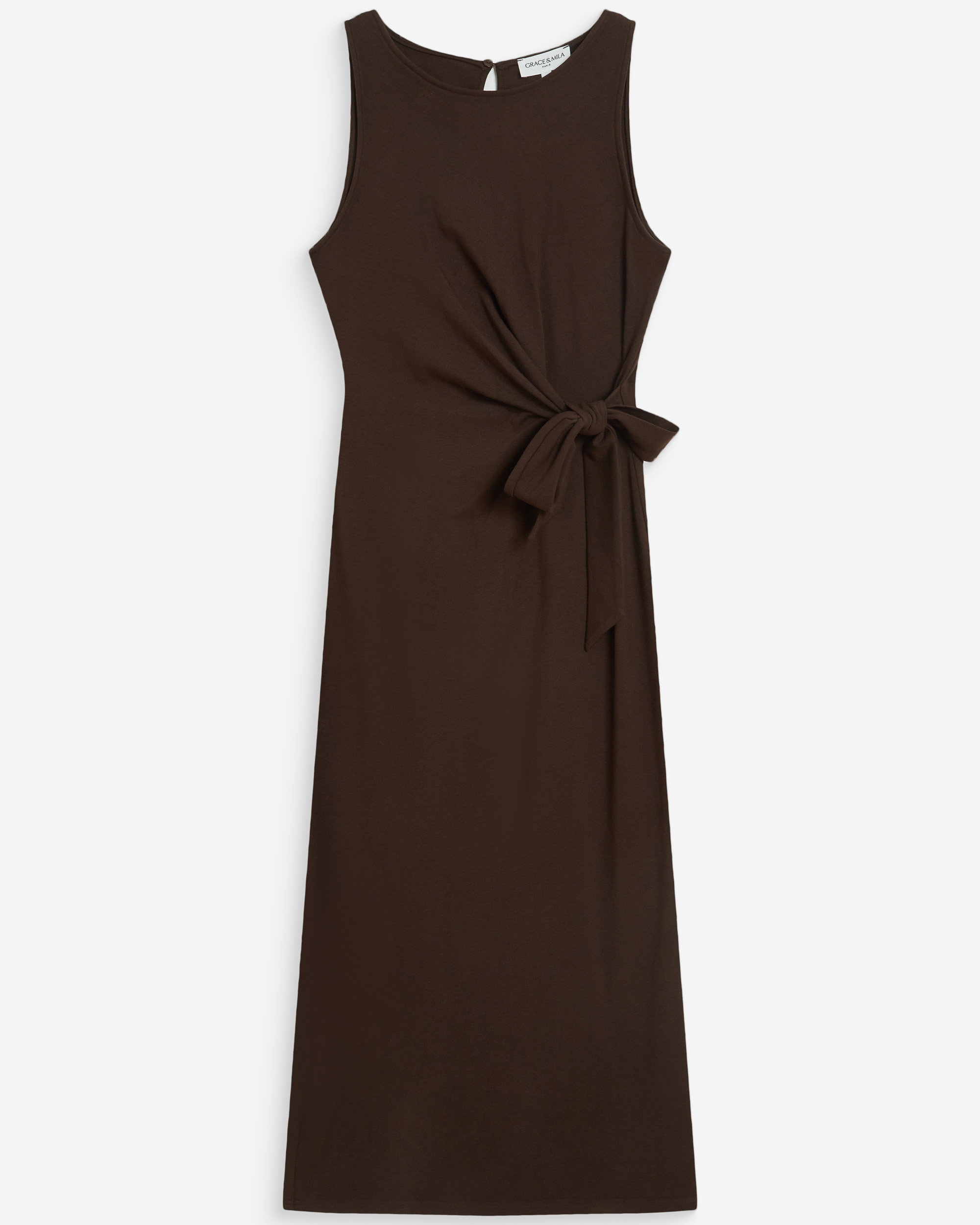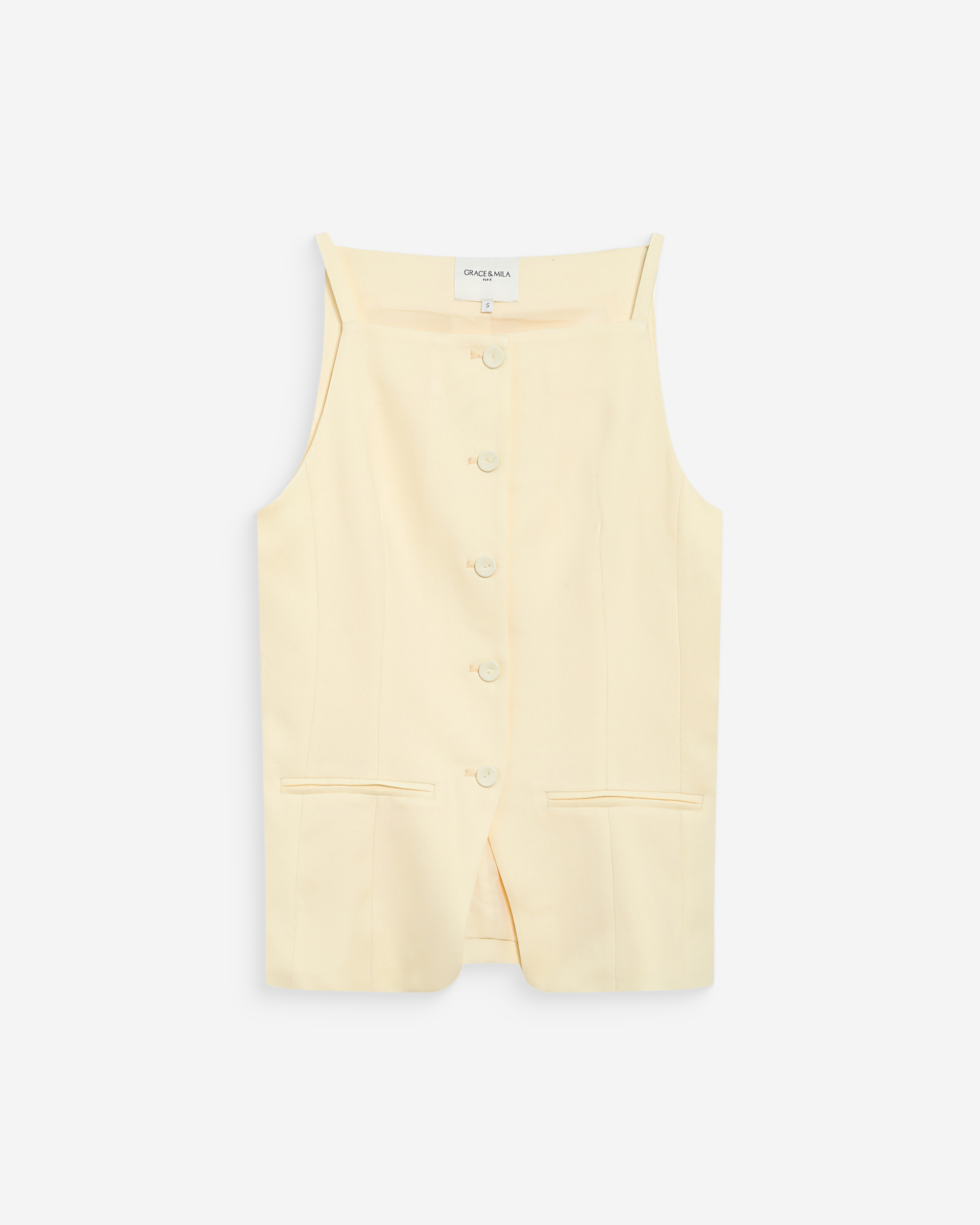 La coupe droite et le col rond du top sans manches WESCA sont rehaussés par des liens à nouer sur les côtés. Le modèle est confectionné dans un tissu en lin mélangé et propose une silhouette à l'élégance naturelle.