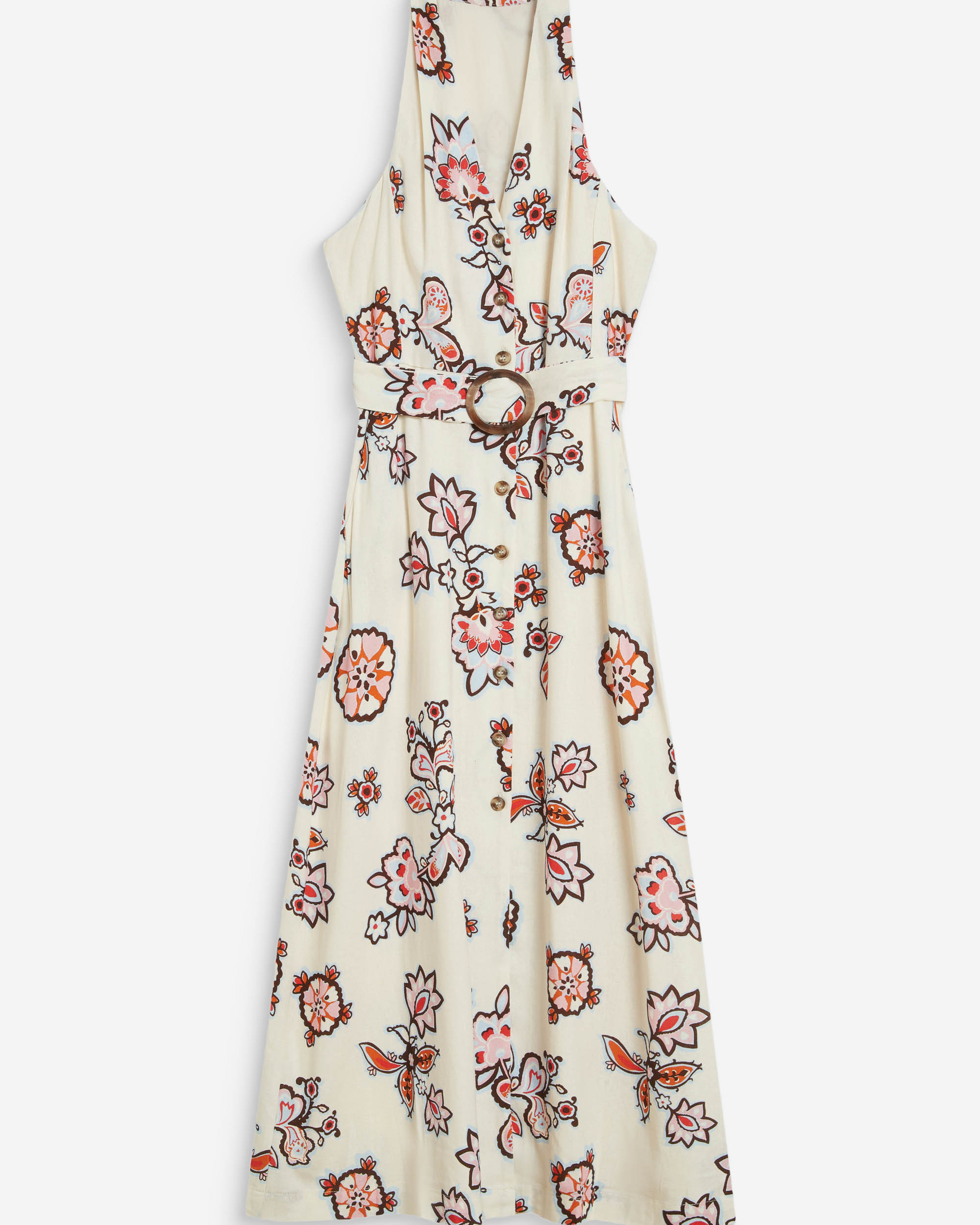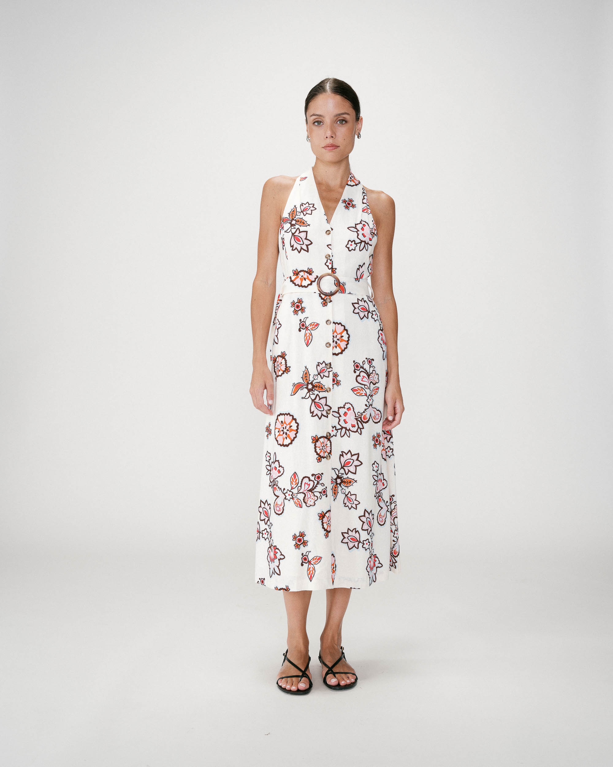 The midi dress WINK, enhanced with a floral print fabric, is a bohemian and refined piece. Shoulder pleats and a waist belt structure the silhouette elegantly. The floral print dress WINK features a V-neckline and an invisible button at the neckline.
