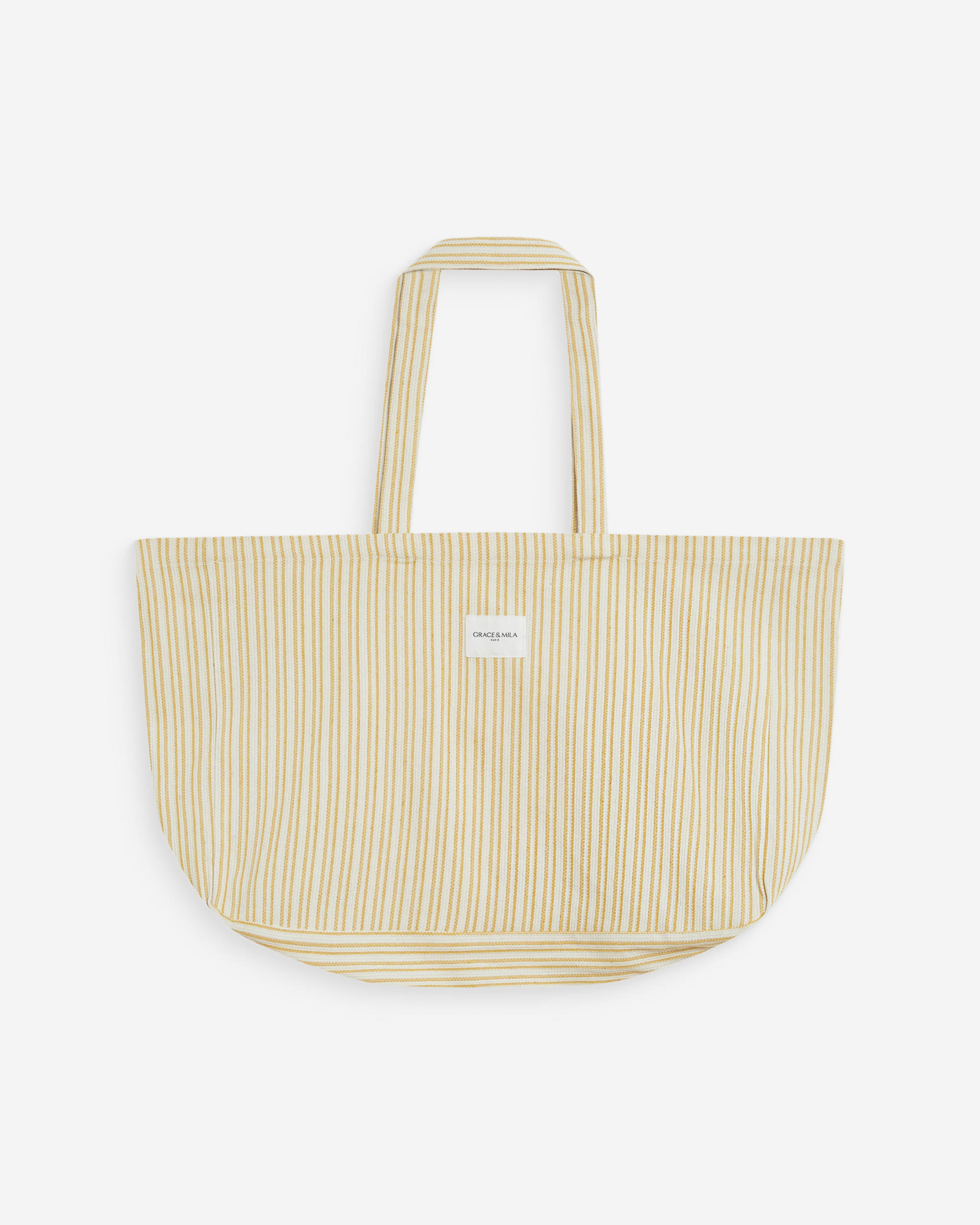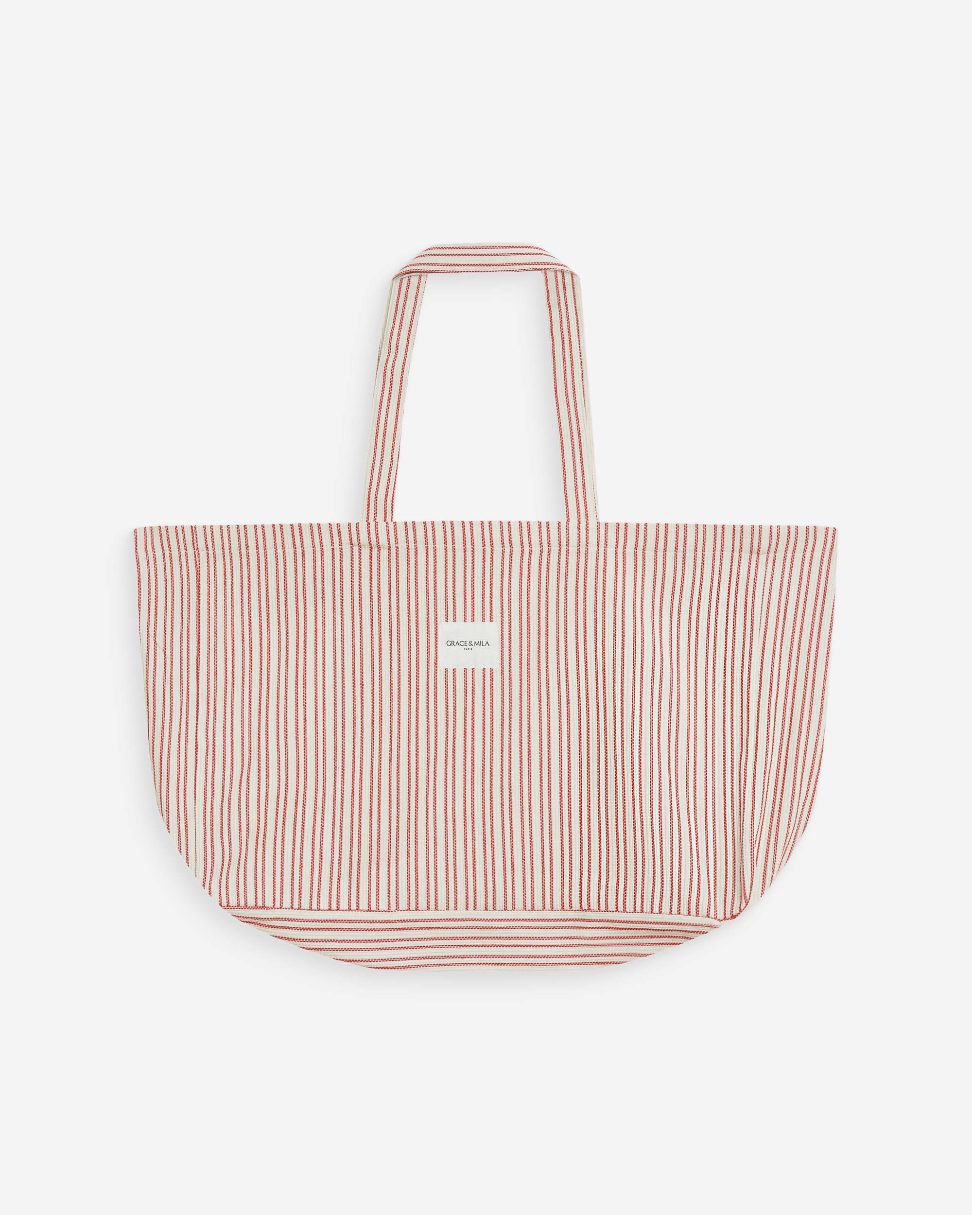 Confectionné dans un tissu à rayures en 100% coton, le tote bag WANDA a une étiquette Grace & Mila sur le devant. Ce modèle rejoint la sélection d'accessoires de la maison.