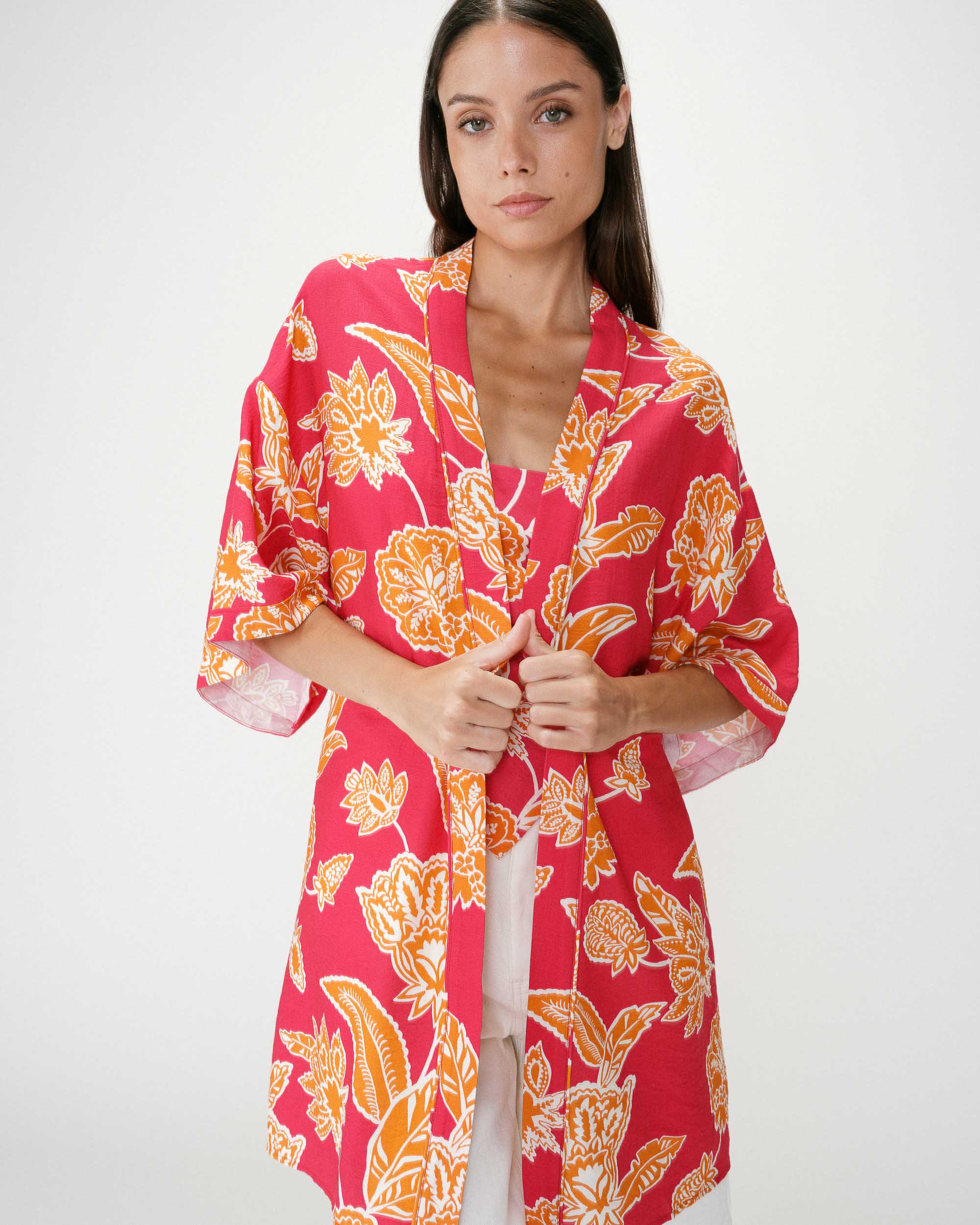 The loose fit of the VEZIA round-neck blouse, enhanced by a paisley print, creates a bold and bohemian silhouette. The three-quarter sleeves and shoulder gathers add a subtle touch of elegance and highlight the femininity of the model. The VEZIA printed blouse features a front button placket.