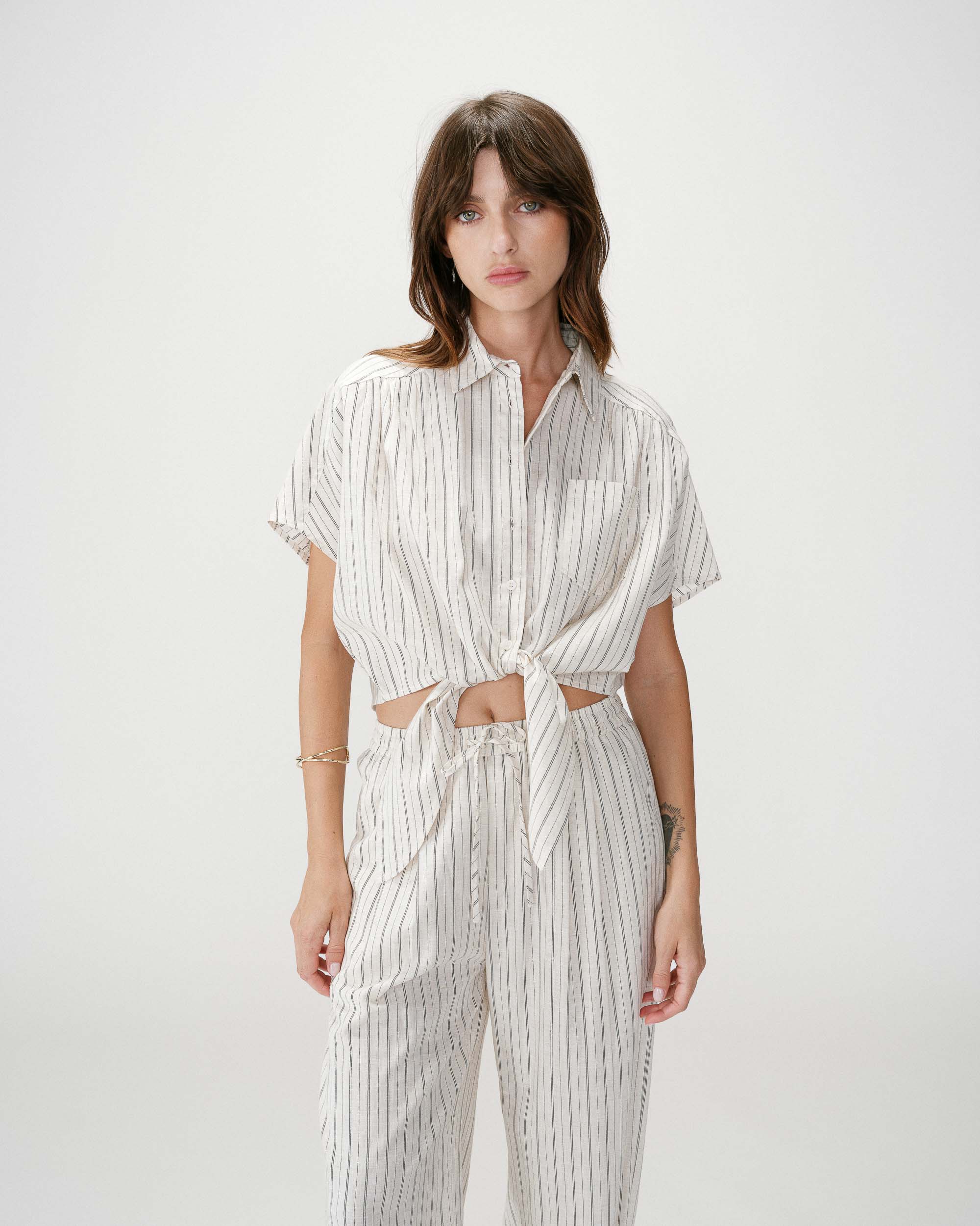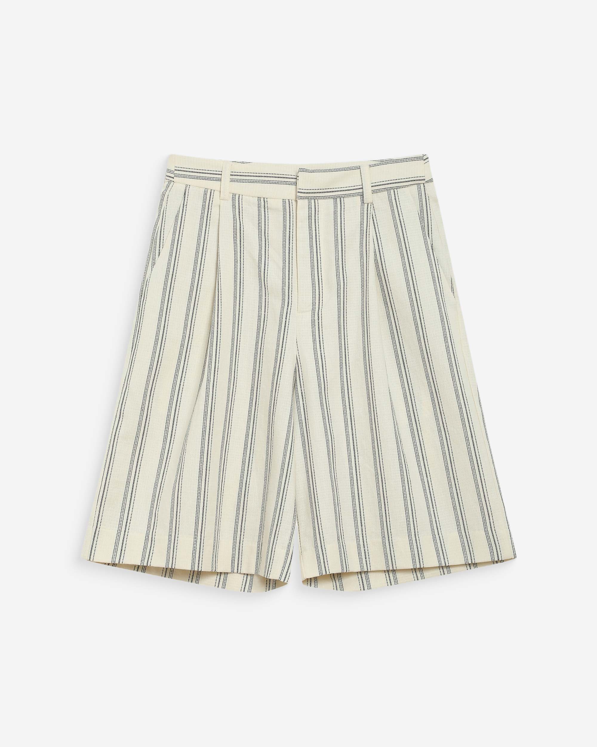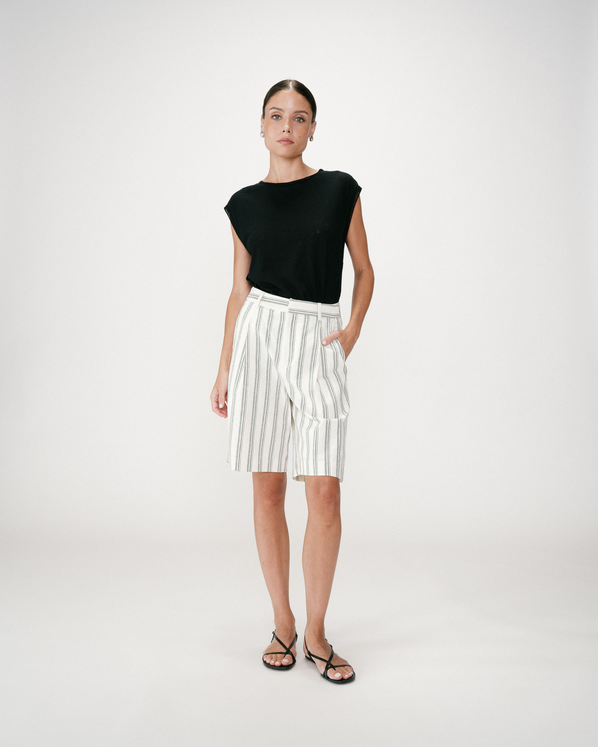 Made from a vertical striped fabric, the wide bermuda WELLO is a modern and elegant piece. The mid-rise waist pairs with pleats that add a touch of sophistication to this structured garment. The model has welt pockets at the back and Italian pockets at the front.