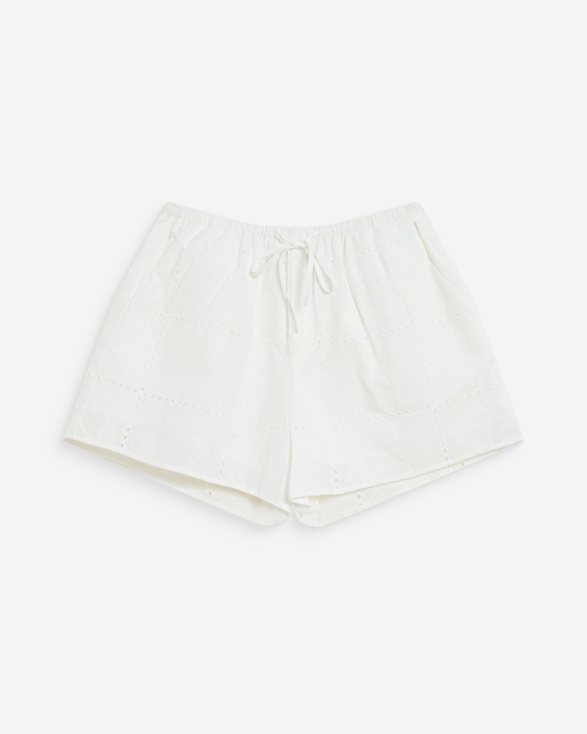 The wide cut of the cream shorts WYLER is enhanced with eyelet embroidery fabric, creating a delicate and feminine silhouette. The lightweight fabric pairs with an elasticated waist with drawstring for a relaxed and comfortable piece.