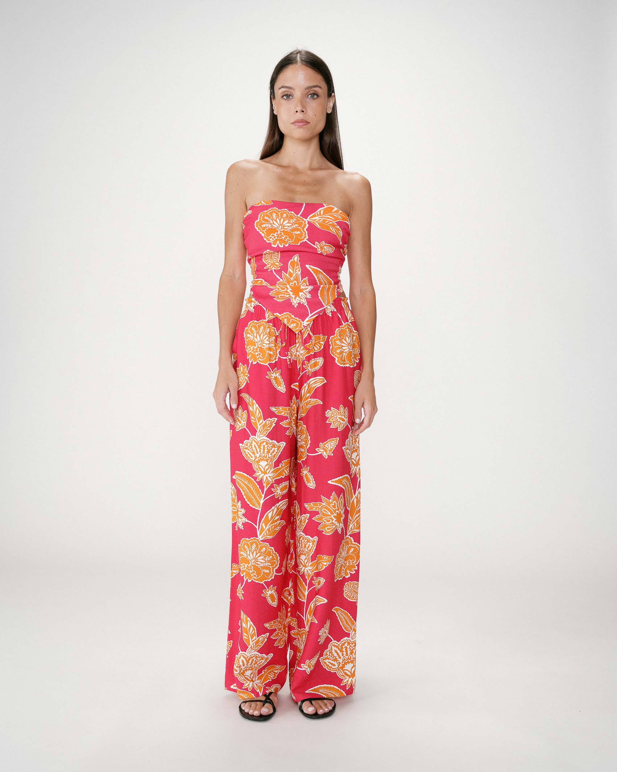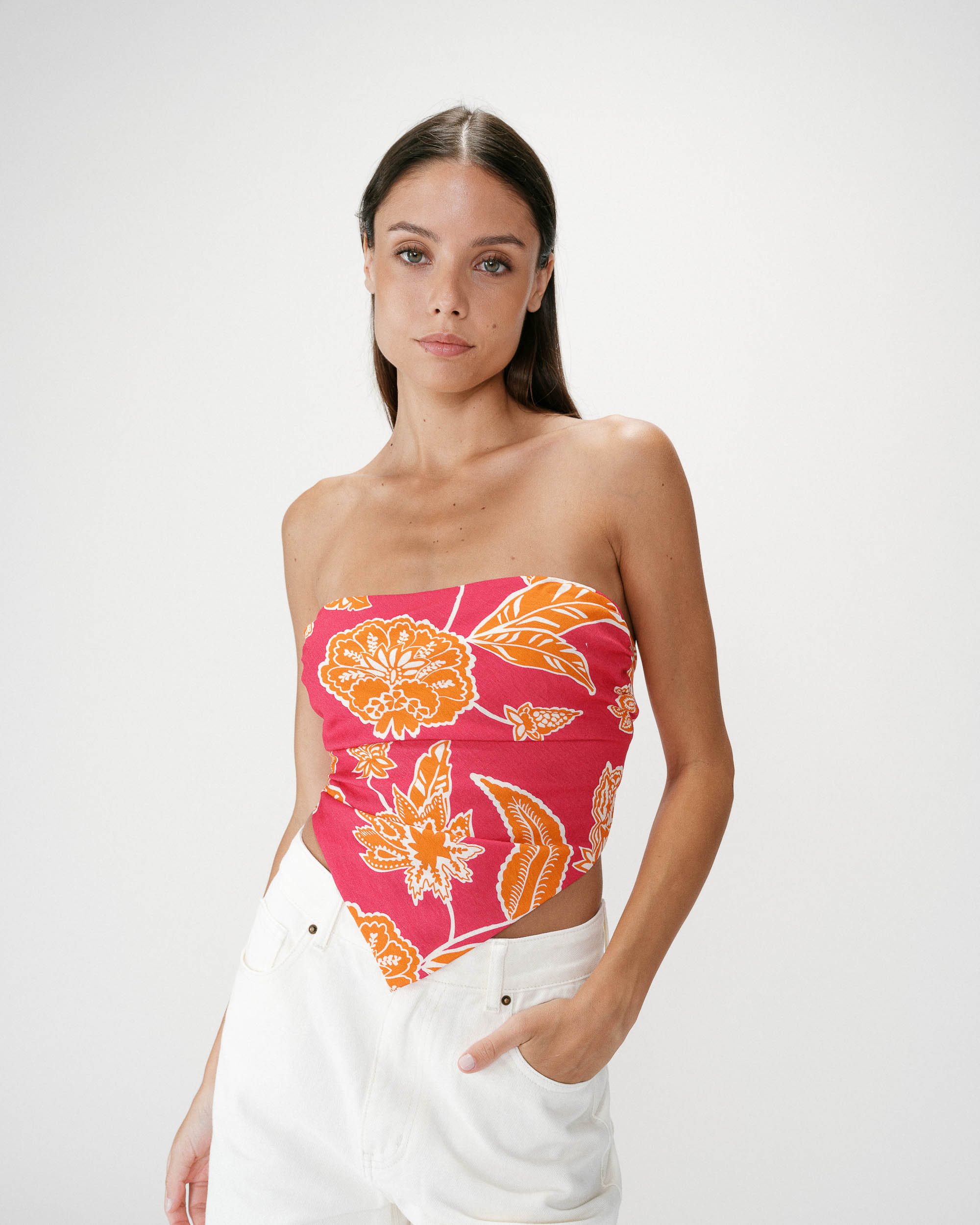 Le top bustier WILLARA est sublimé par un imprimé floral aux teintes chaudes et vives. La coupe en pointe met en valeur la silhouette avec féminité tandis que le lien à nouer au dos permet un ajustement parfait. Le top à nouer WILLARA propose une allure bohème et solaire.