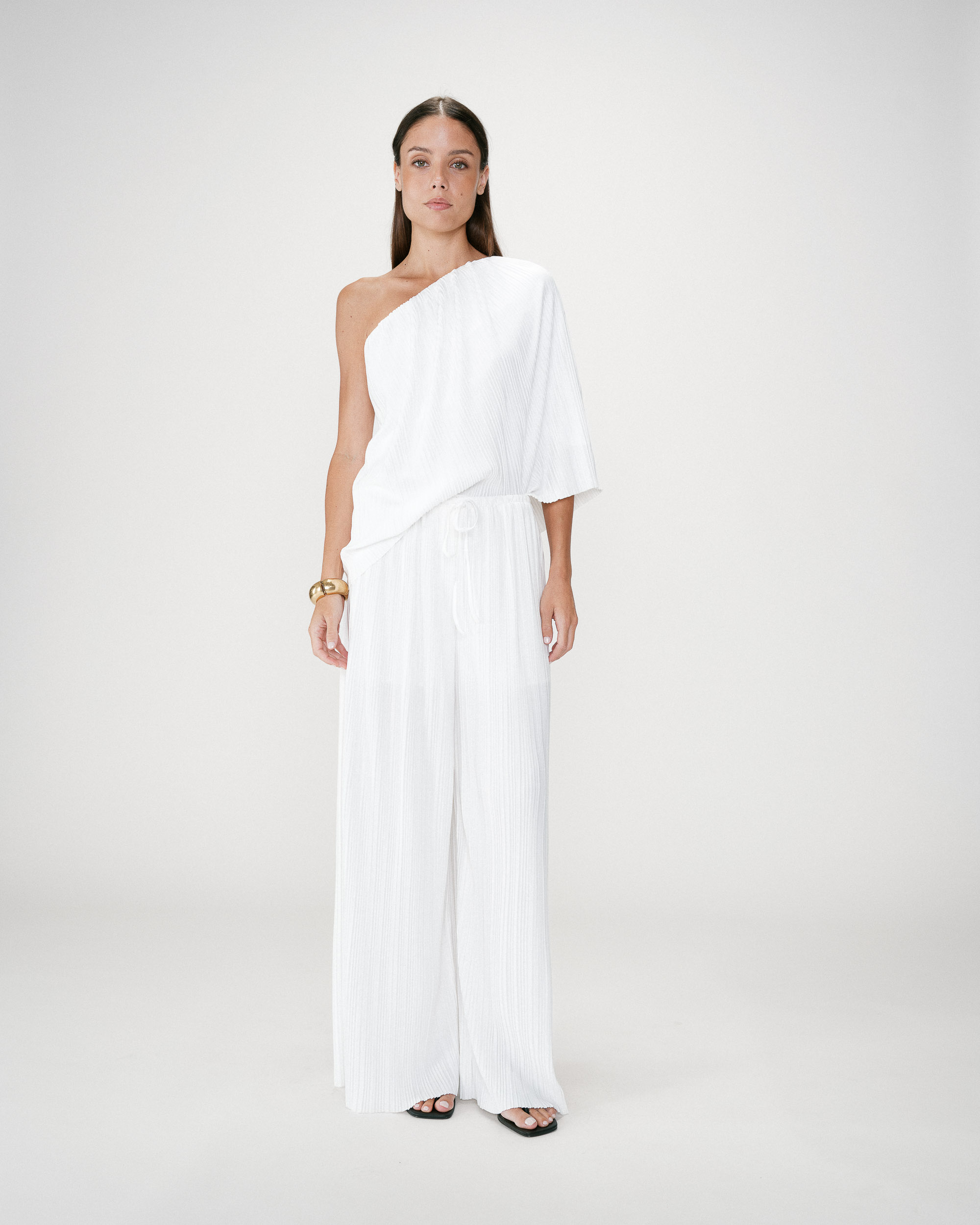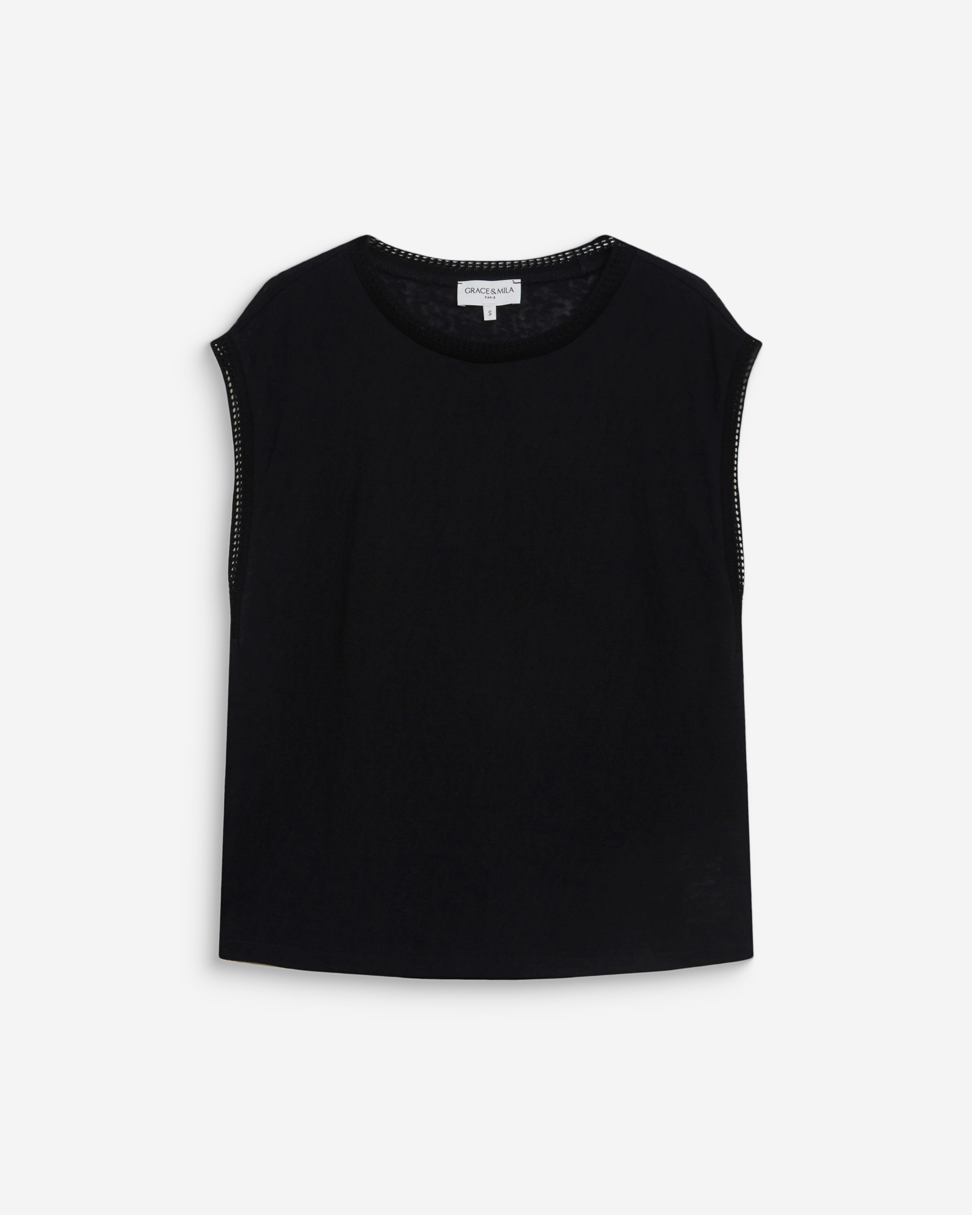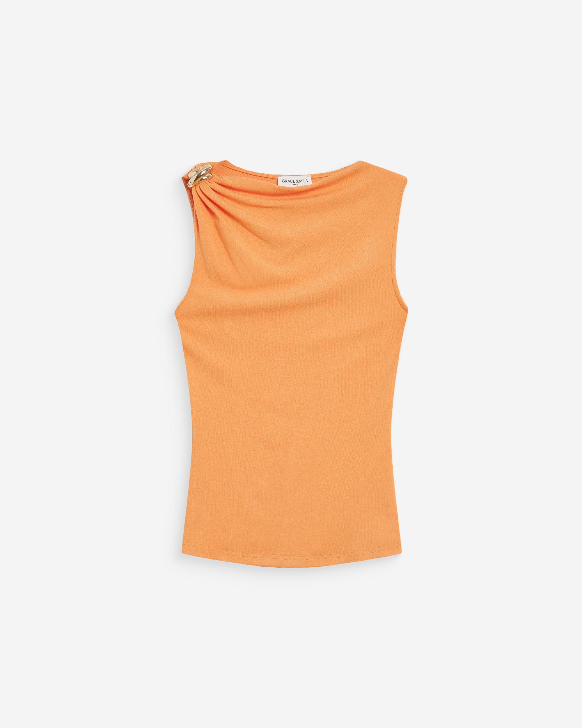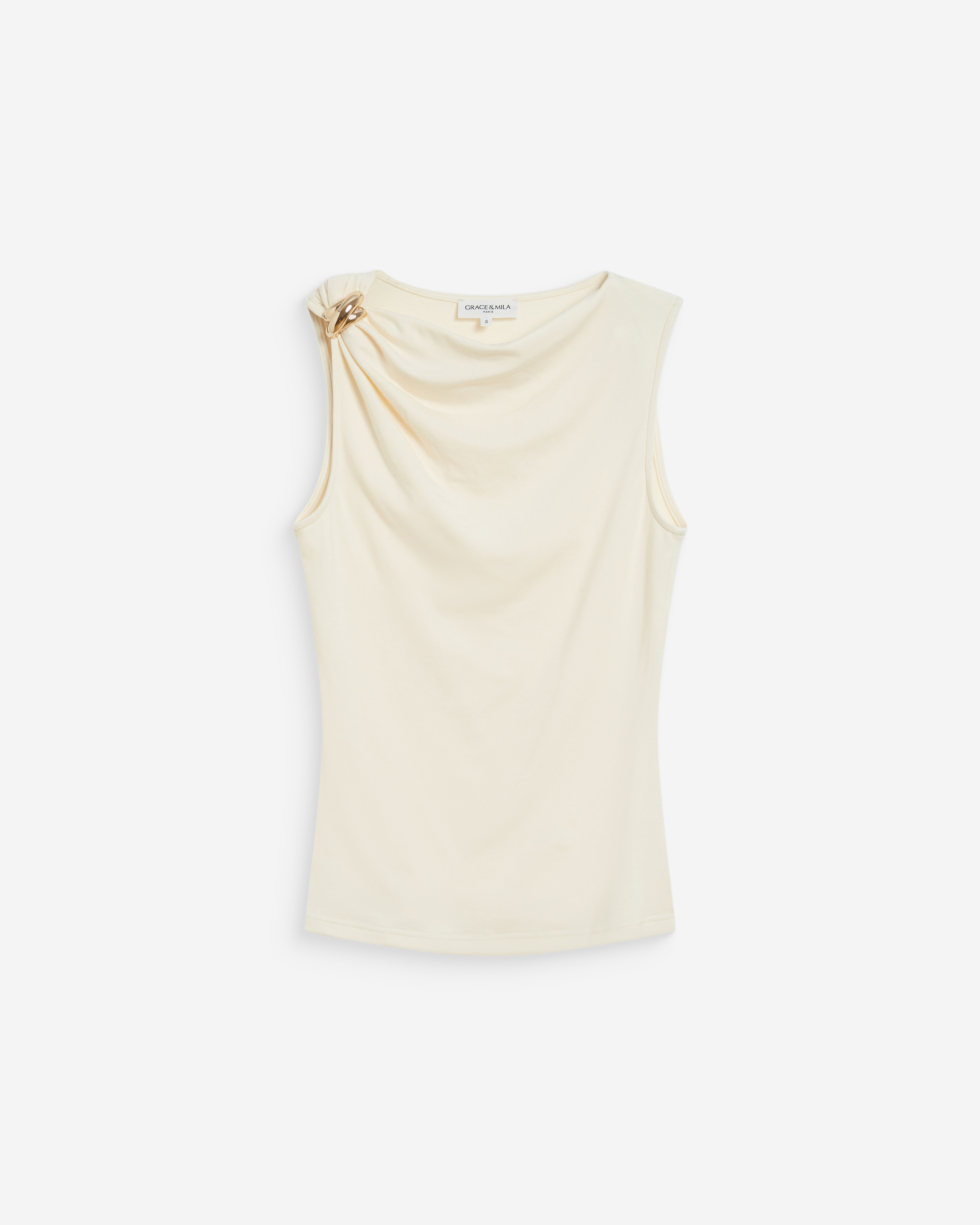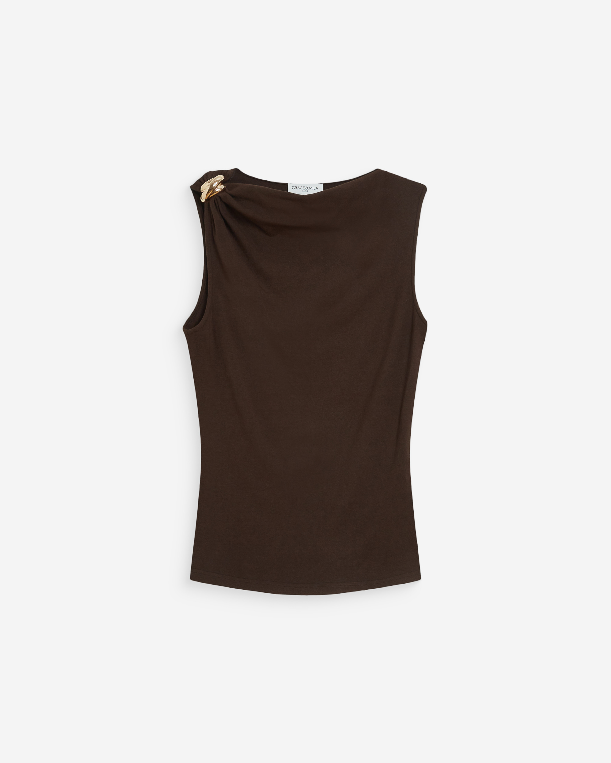 The sleeveless top WAGNER is a modern and feminine piece. The fitted cut is enhanced by draping that sculpts and flatters the silhouette. The draped top WAGNER features a gold detail on the shoulder for an elegant touch.