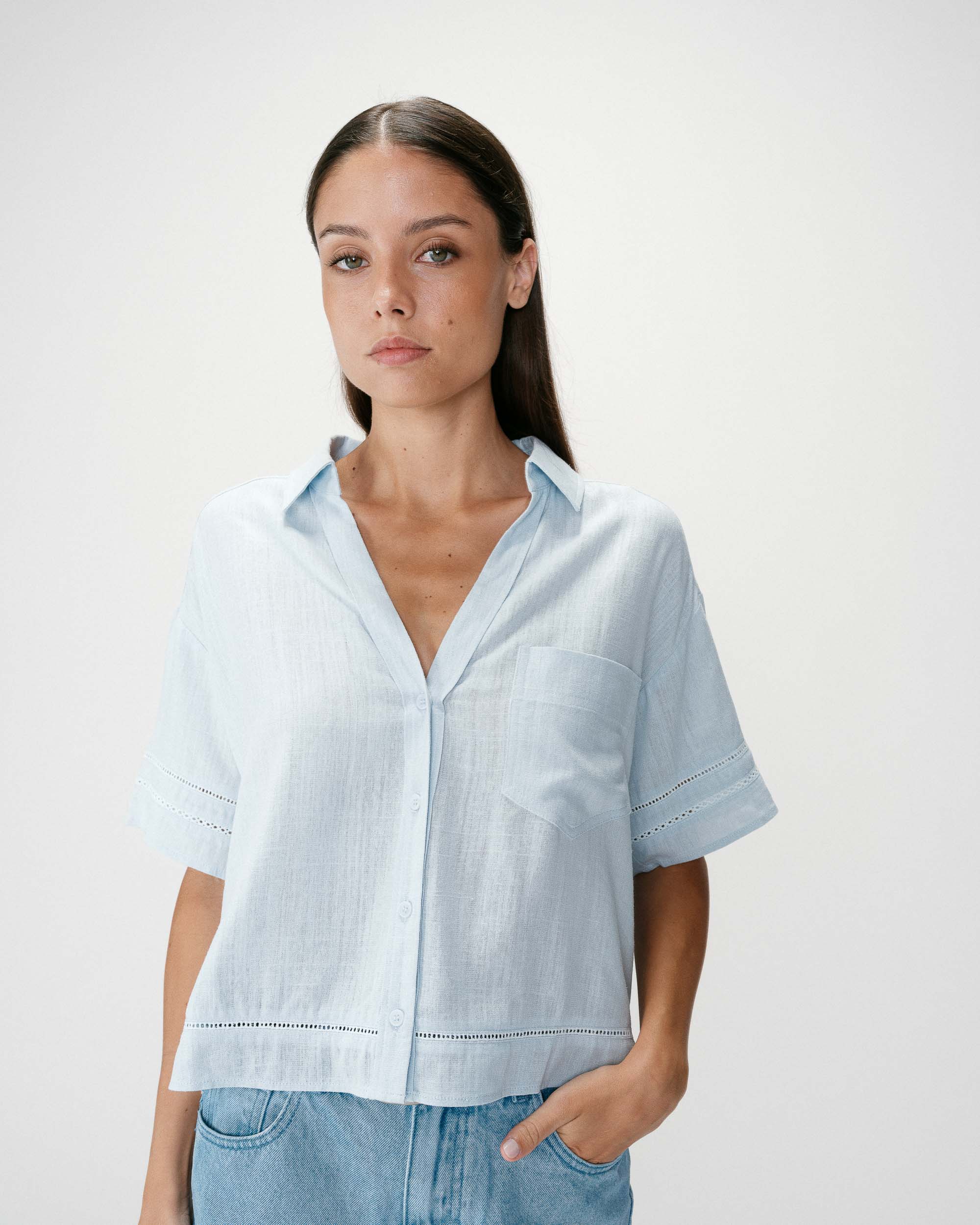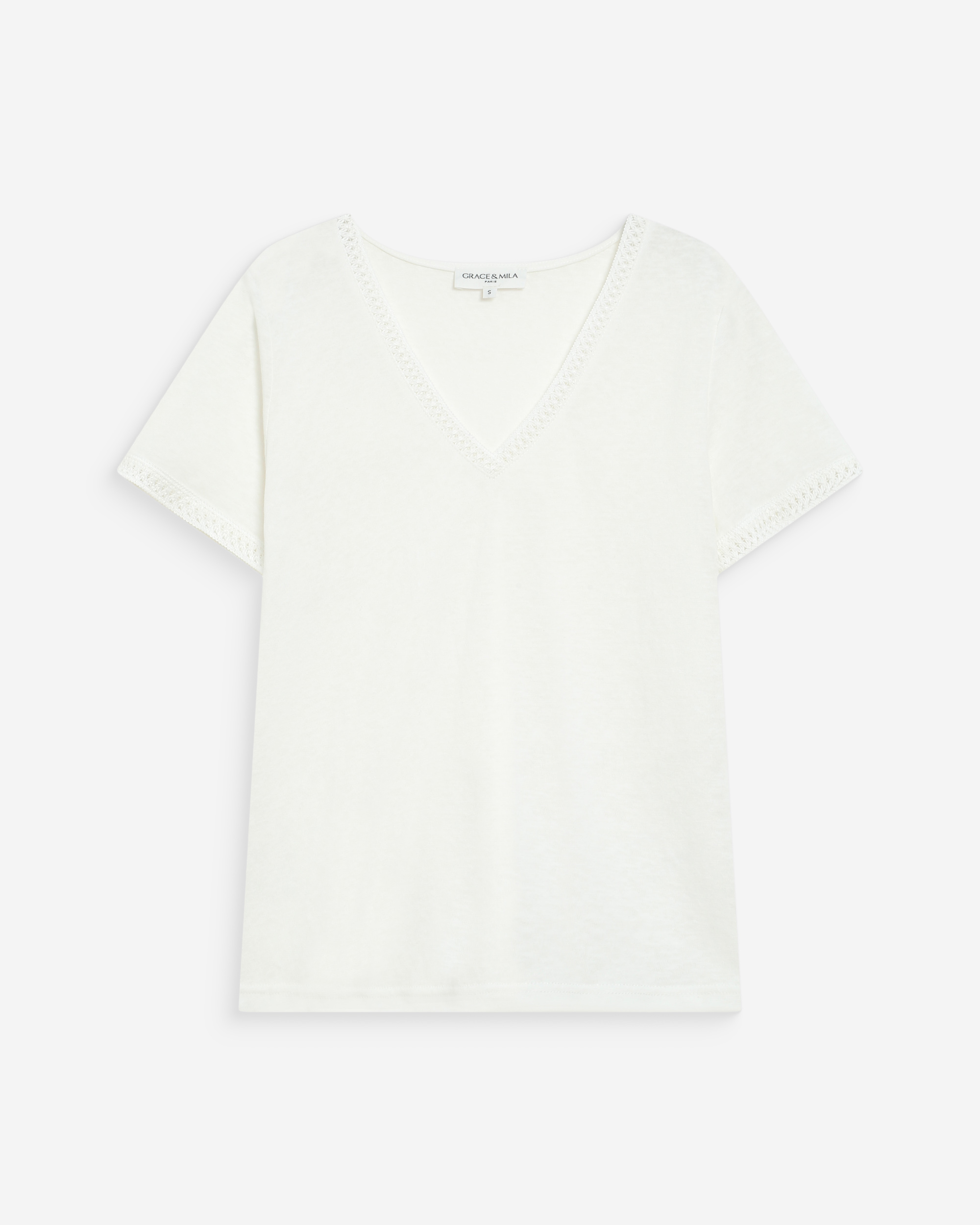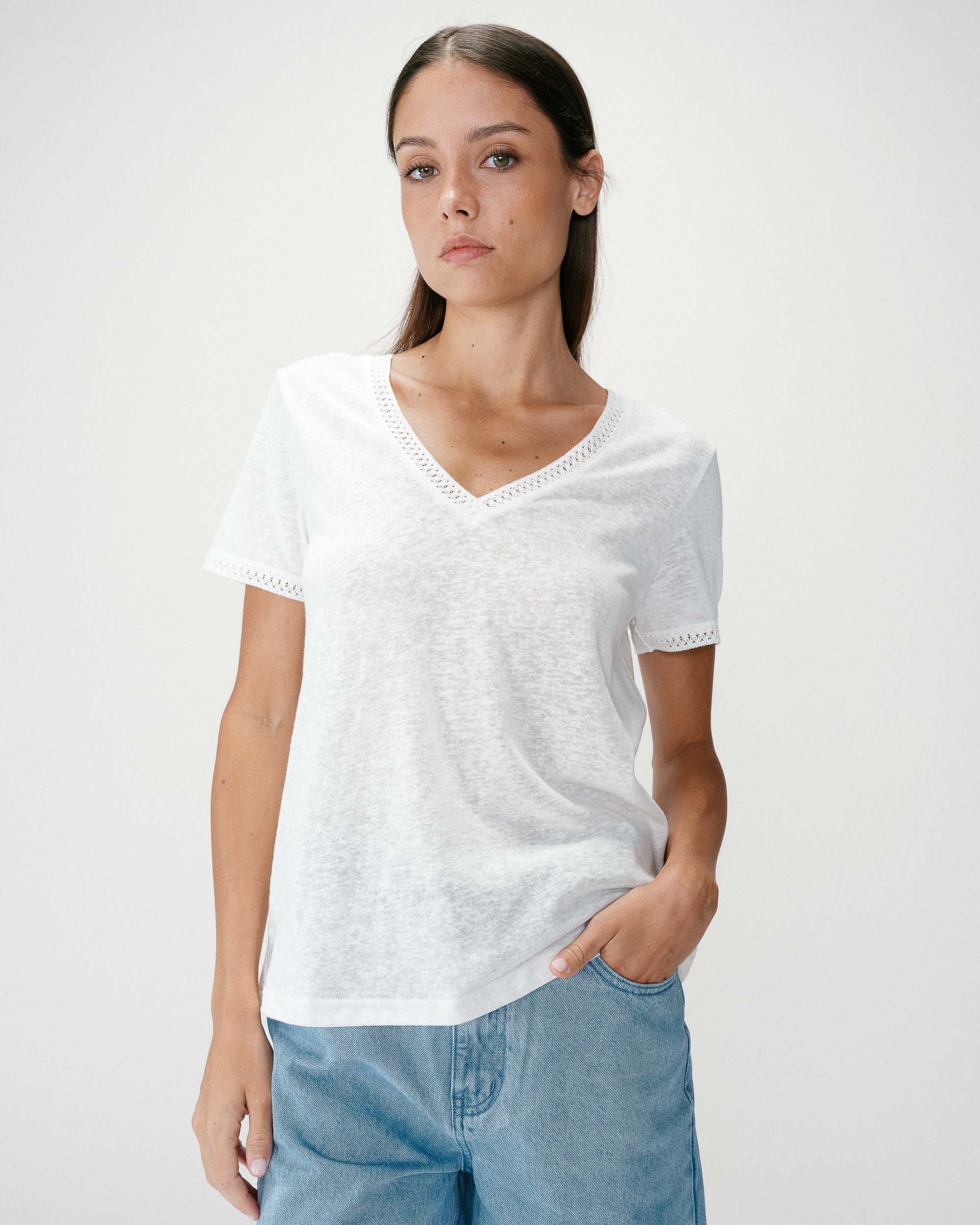 The WILLEM short-sleeved top is a timeless piece from the Maison. The classic lines of the design adapt to every woman’s figure. The V-neckline of the WILLEM straight top is enhanced by a lace trim that highlights the neckline and adds a feminine touch.