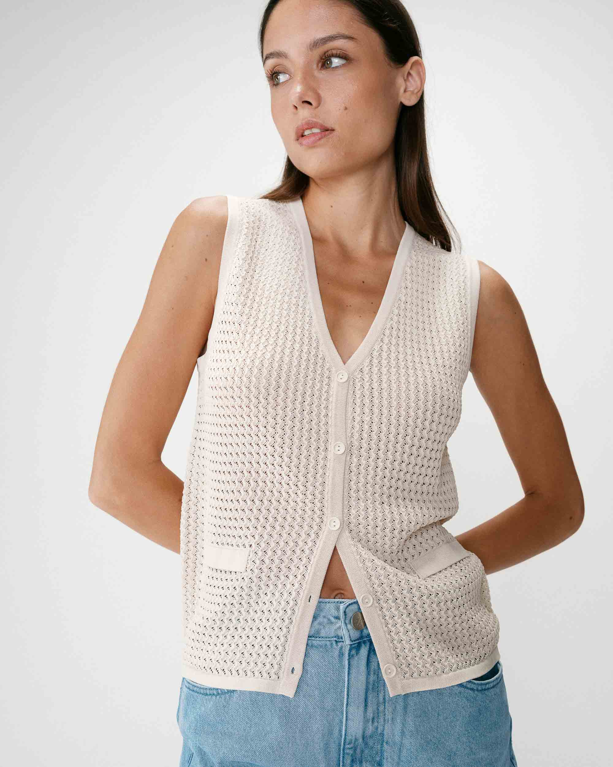 The VADIM buttoned cardigan is a lightweight piece made from fine openwork knit. The straight cut and short sleeves give it a relaxed and modern style. The shirt collar adds a touch of elegance, while the buttoned front allows for a practical and personalized fit.