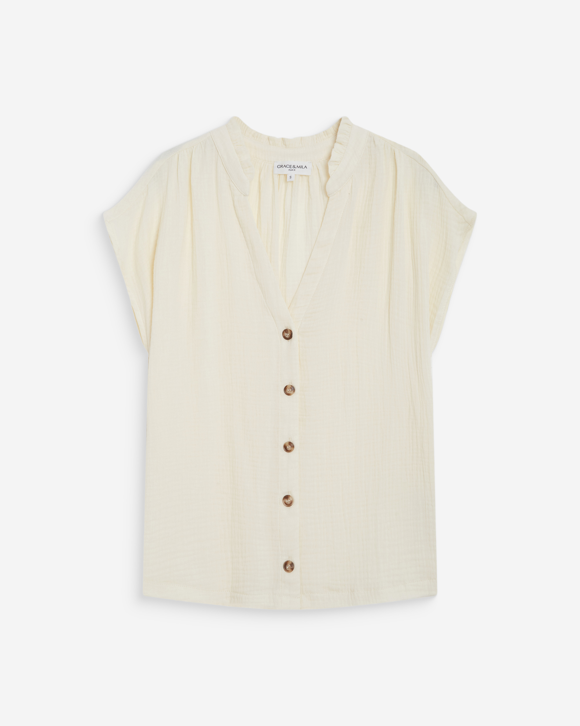 The VALORY straight blouse is designed to be both relaxed and refined. The buttoned cuffs with the G&M monogram add a subtle and elegant signature. The V-slit neckline, pleats on the shoulders, and puffed sleeves highlight the femininity of the silhouette.