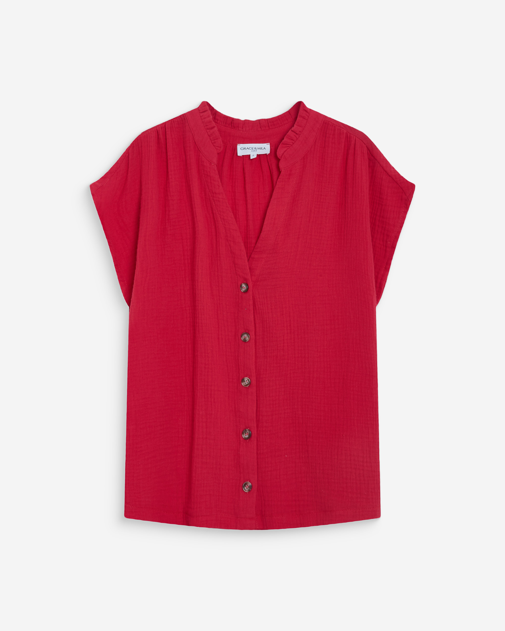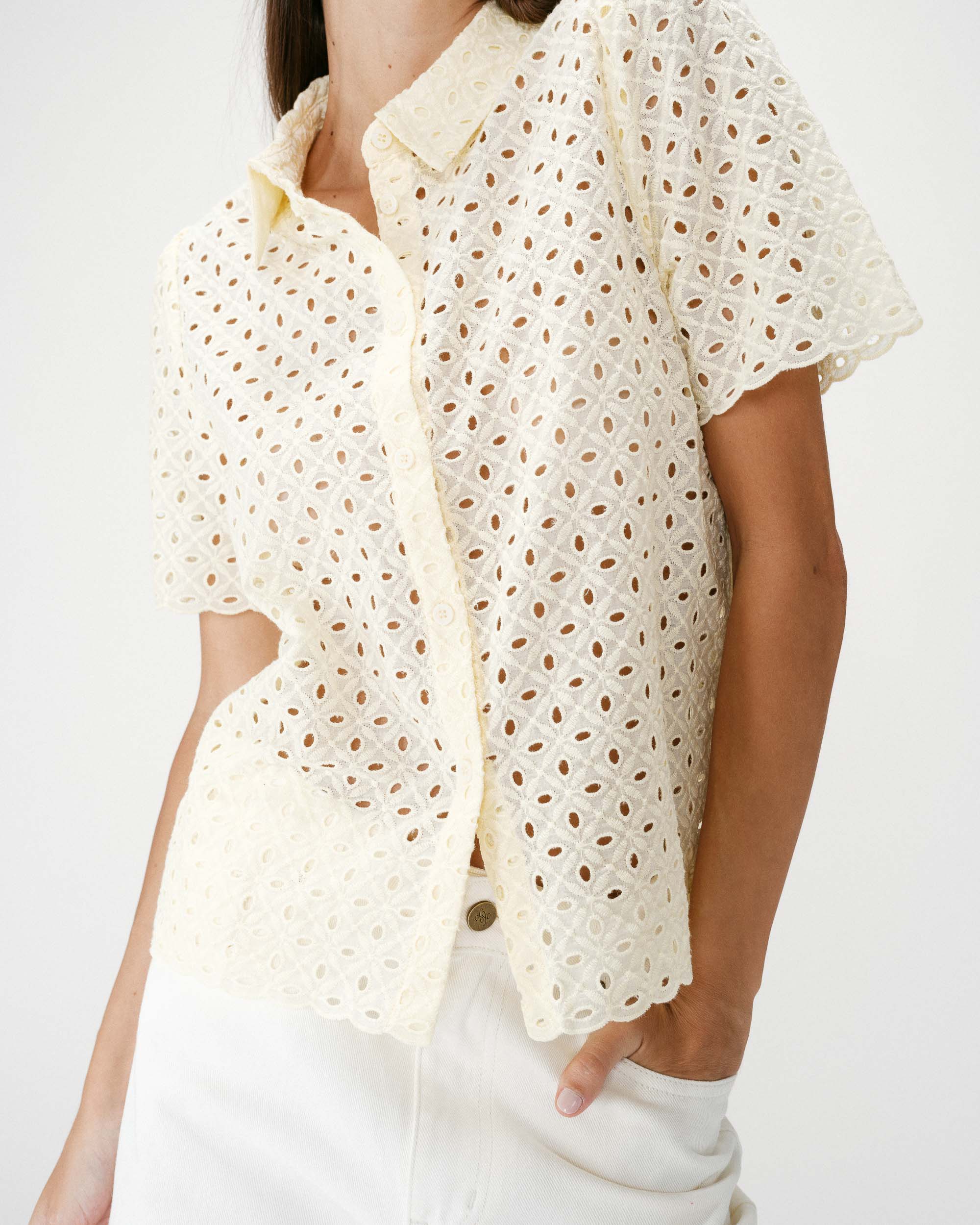 La blouse légèrement transparente VICKY possède des manches courtes. Son décolleté en V et sa patte de boutonnage sur le devant dessinent une silhouette élégante et intemporelle. Les finitions festonnées au col et aux manches, ainsi que les fronces discrètes de la blouse en dentelle VICKY, apportent une touche délicate et romantique.